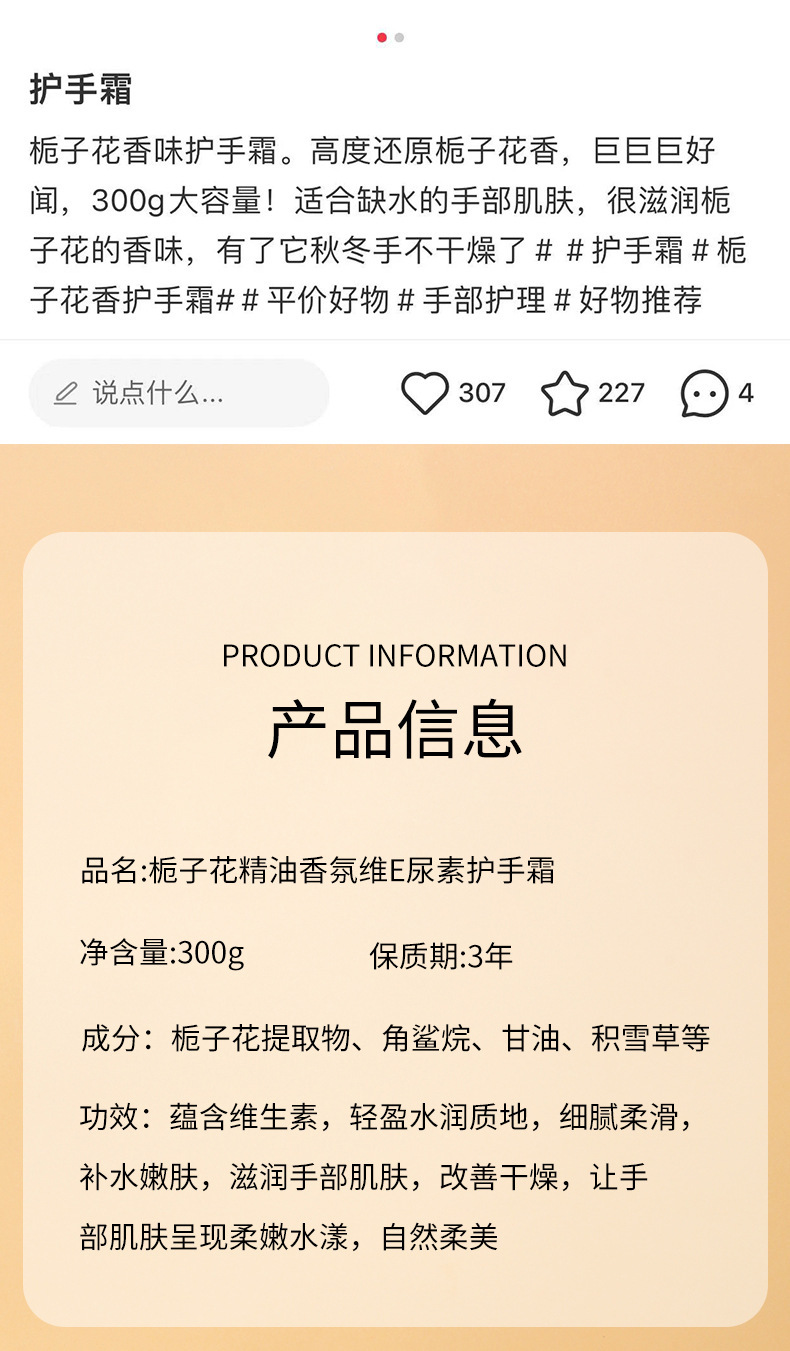 Крем для рук с эфирным маслом Xuemi Gardenia, ароматом витамина Е и мочевины, 300 г