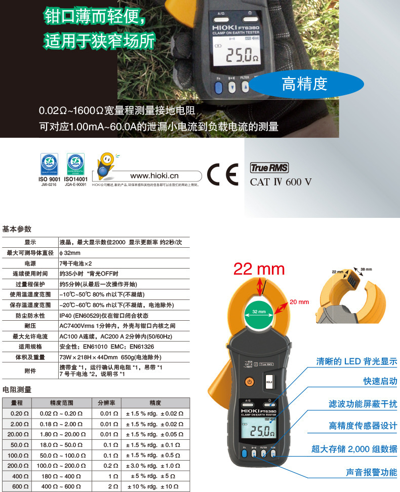 Цифровой зажимной измеритель сопротивления заземления HIOKI FT6380-50 с Bluetooth и цифровым дисплеем
