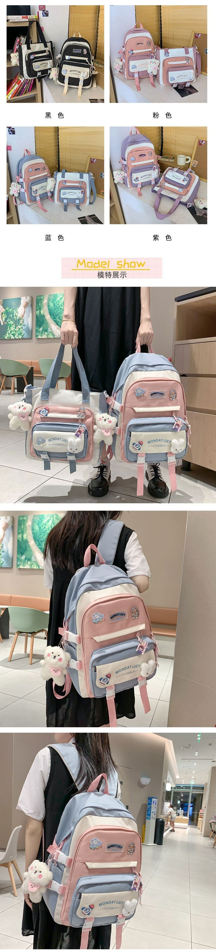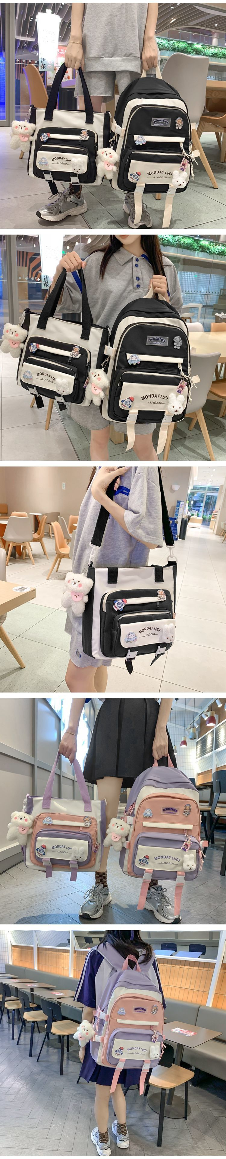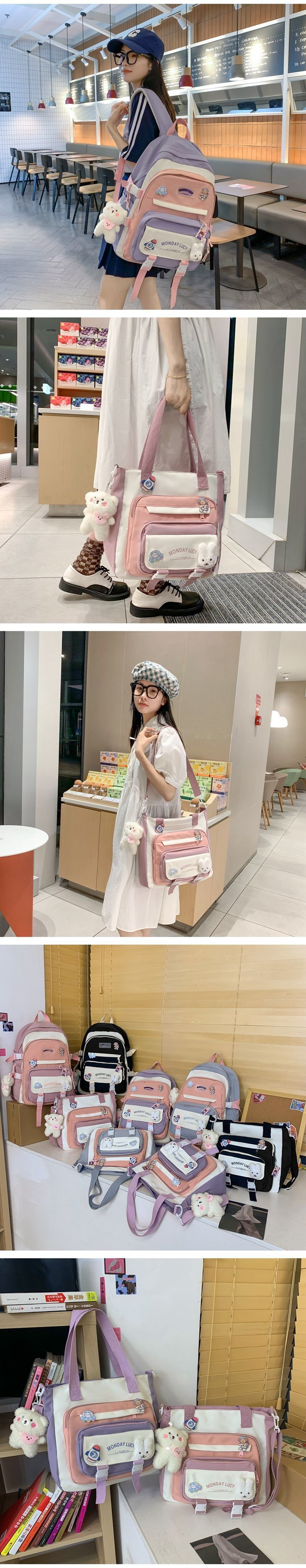 Черная сумка через плечо с 4 значками и 1 медвежонком.; Синяя сумка через плечо с 4 значками и 1 медвежонком.; Фиолетовая сумка через плечо с 4 значками и 1 медвежонком.; Розовая сумка через плечо с 4 значками и 1 медвежонком.; Черный рюкзак с 4 значками и 1 медведем.; Синий рюкзак с 4 значками и 1 медведем.; Фиолетовый рюкзак с 4 значками и 1 медведем.; Рюкзак розового цвета с 4 значками и 1 медвежонком.; Черный комплект из двух предметов с 8 значками и 1 медведем.; Синий комплект из двух предметов с 8 значками и 1 медведем.; Фиолетовый комплект из двух предметов с 8 значками и 1 медвежонком.; Розовый комплект из двух предметов с 8 значками и 1 медвежонком.