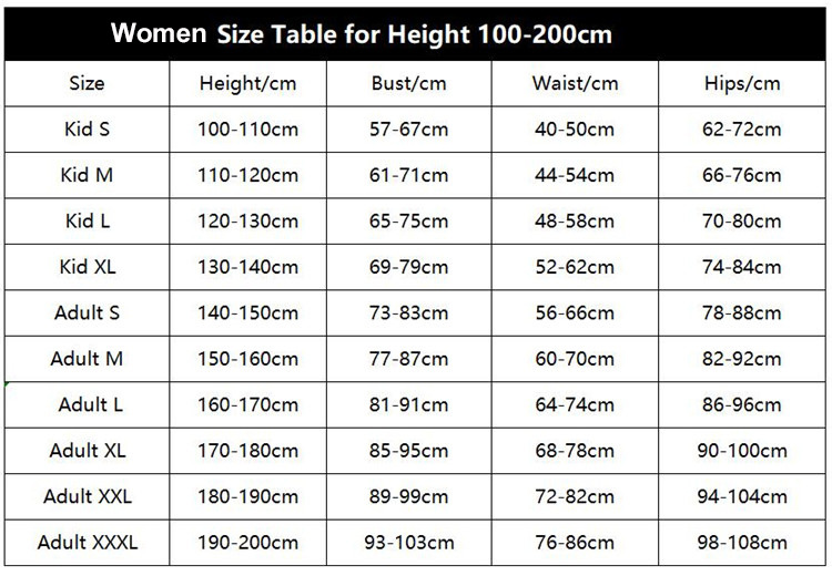 Дети С (100-110); Дети М (110-120); Дети Л (120-130); Детский XL (130-140); Взрослый С (140-150); Взрослый-М (150-160); Взрослый-Л (160-170); Взрослый-XL (170-180); Взрослый-2XL (180-190); Взрослый-3XL (190-200)
