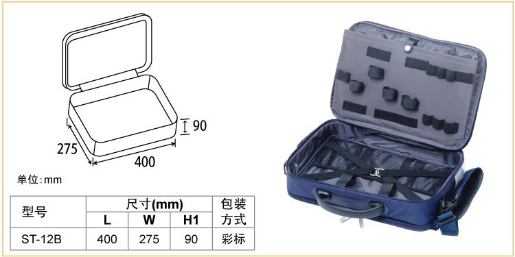 防泼水设计,不仅可用于放置工具,内部有松紧带及隔层,还可放置笔记本电脑、文具、书籍、文件、衣物等。既可当作工具包,也可以是公文包,外形大方美观。 |