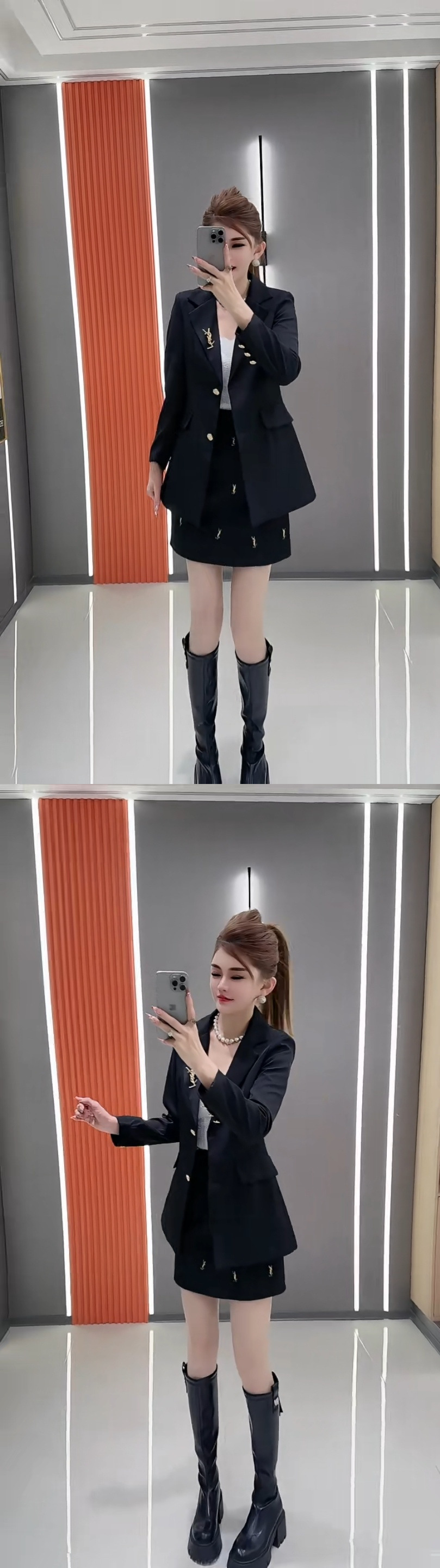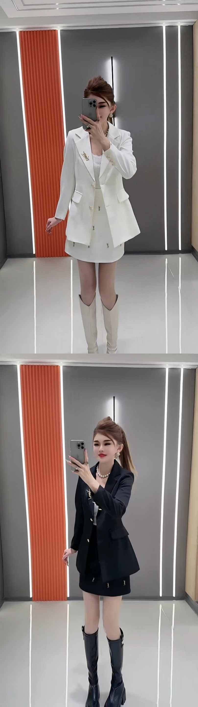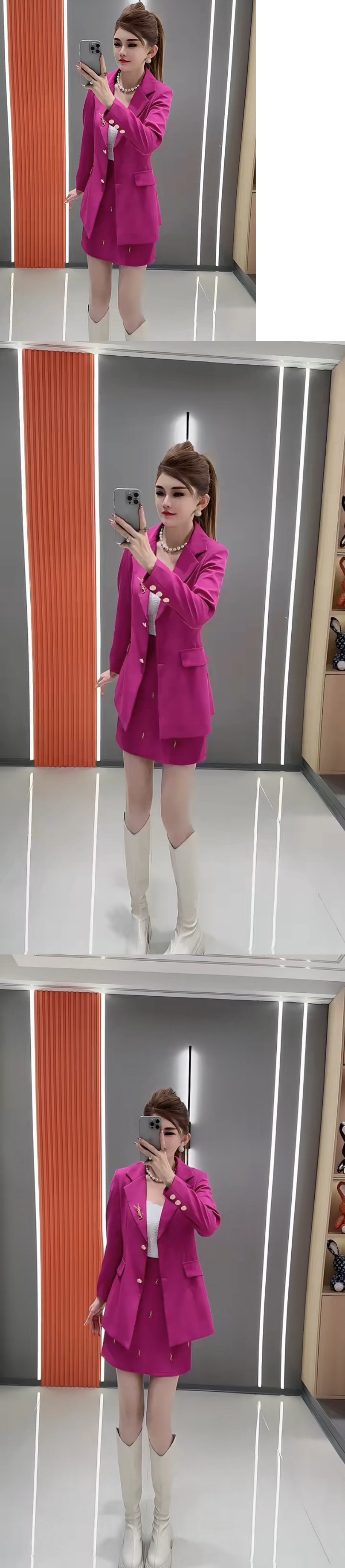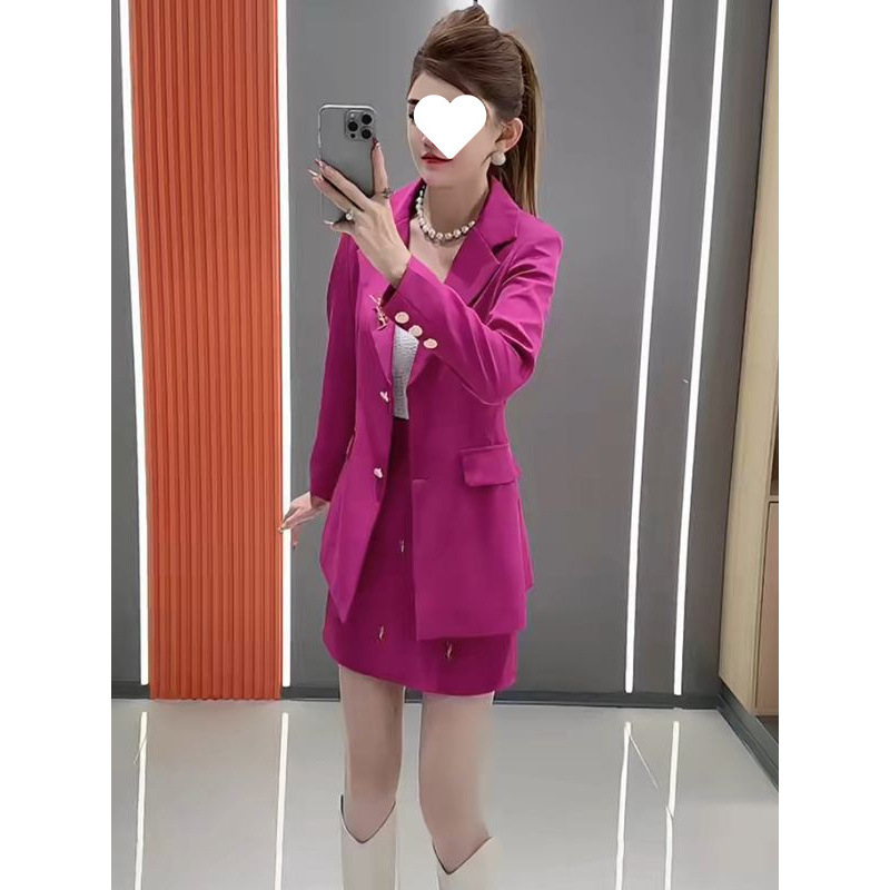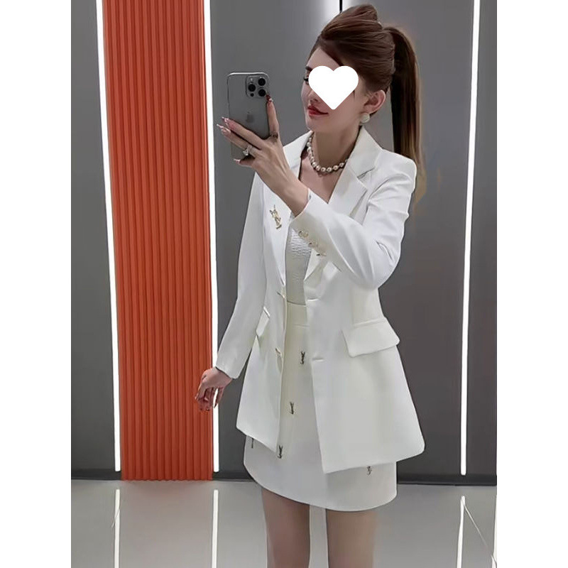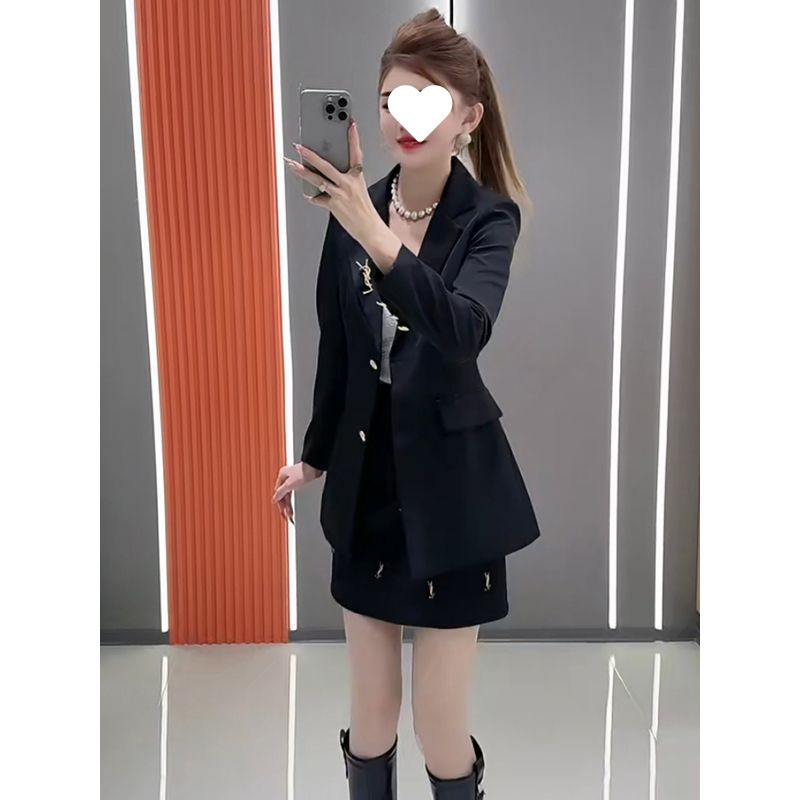 2025 весна новый однотонный жакет средней длины с завышенной талией + юбка с высокой талией и объемным декором комплект из двух предметов
