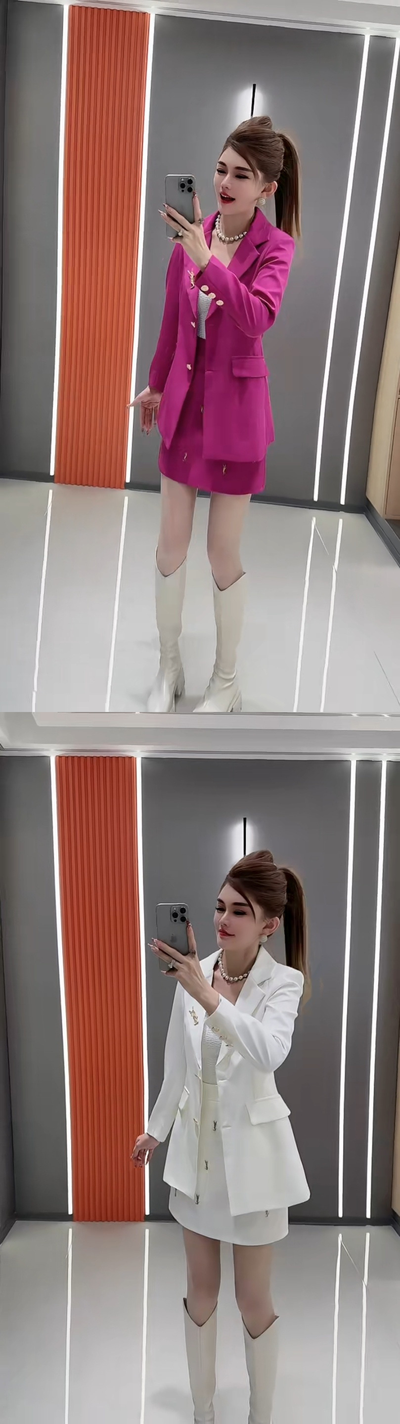 Комплект из двух предметов розово-красного цвета; Белый комплект из двух предметов.; Черный костюм из двух частей