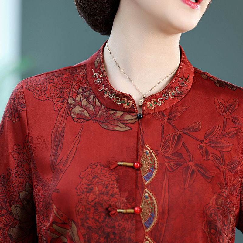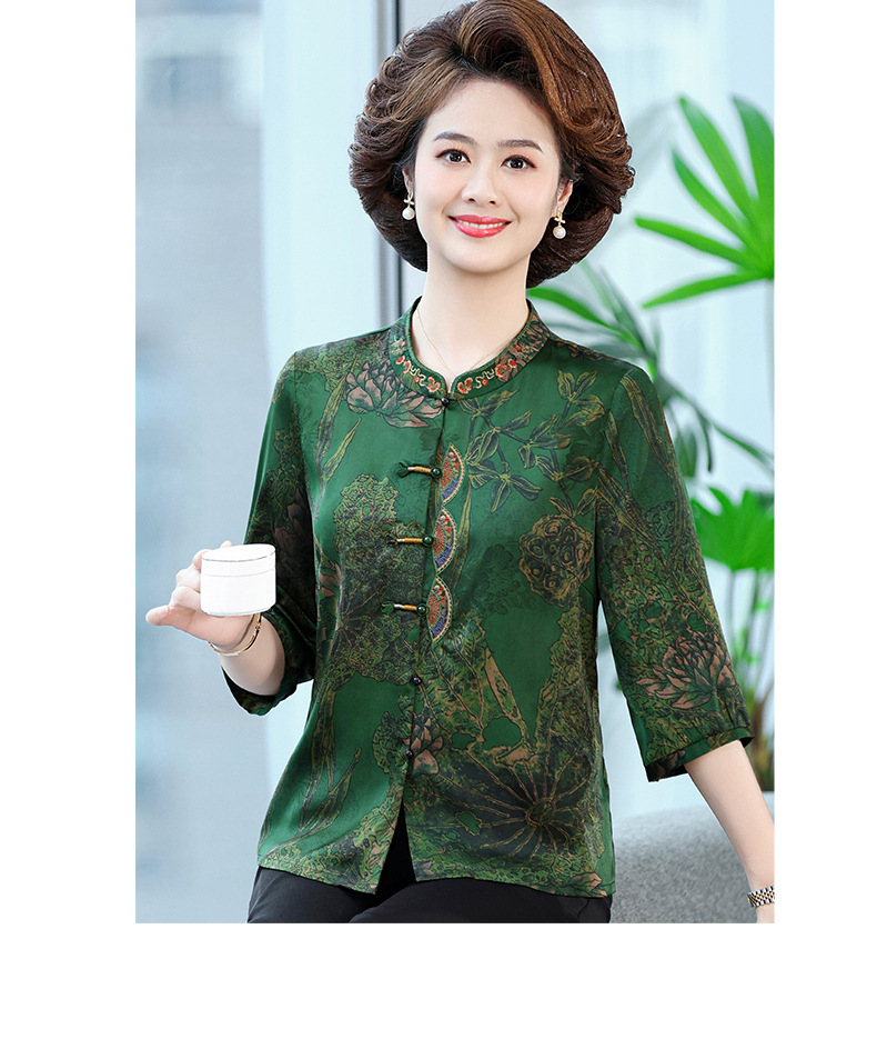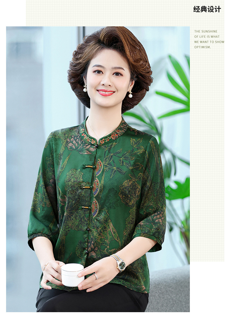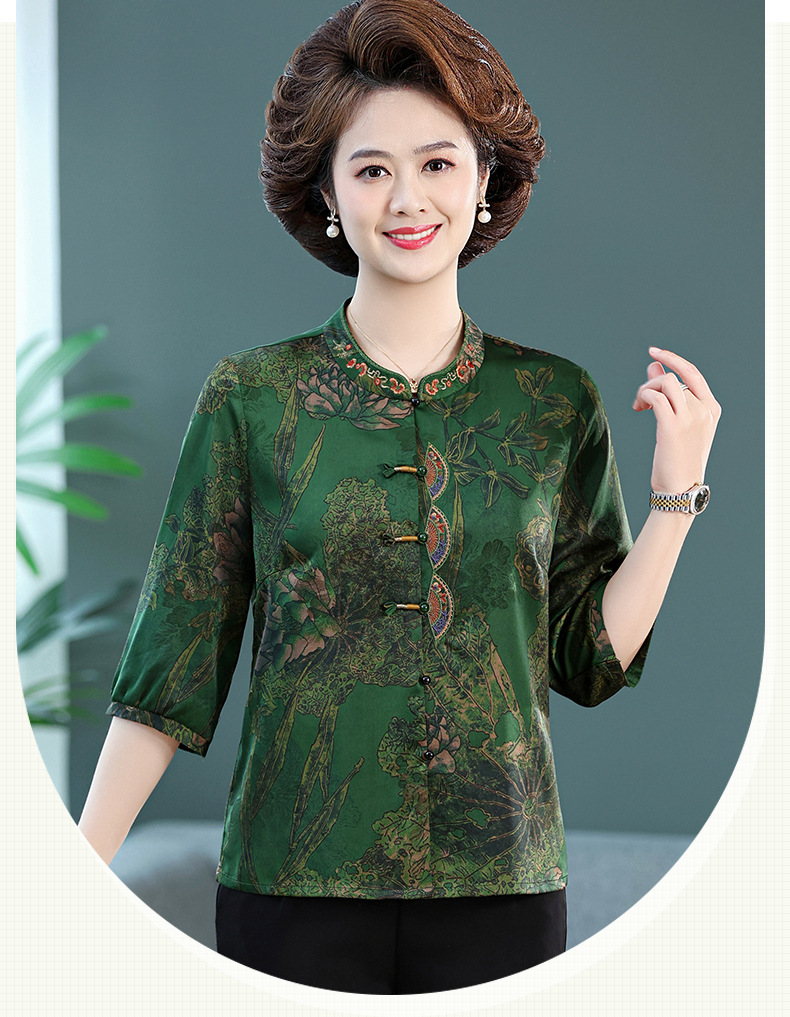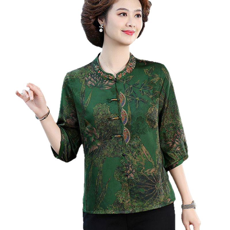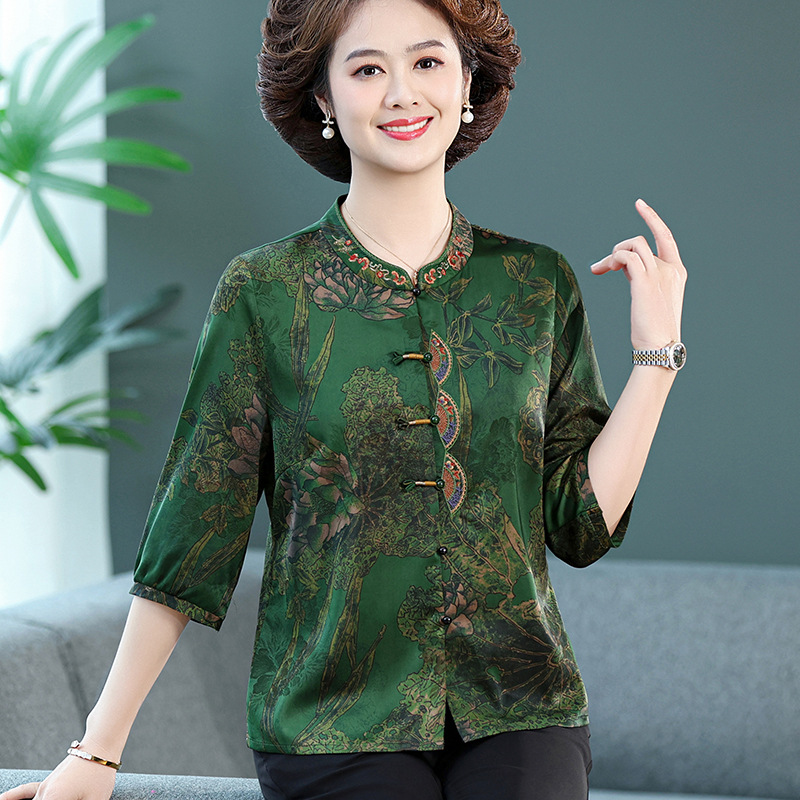 Среднего и пожилого возраста бабушка новый китайский стиль рубашка женская весна и лето шелк атласная мама летнее платье с отворотами, дикий кардиган топ