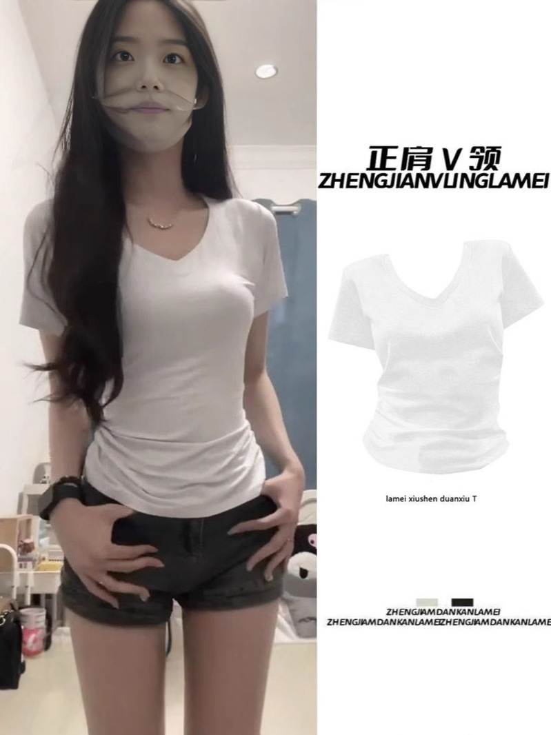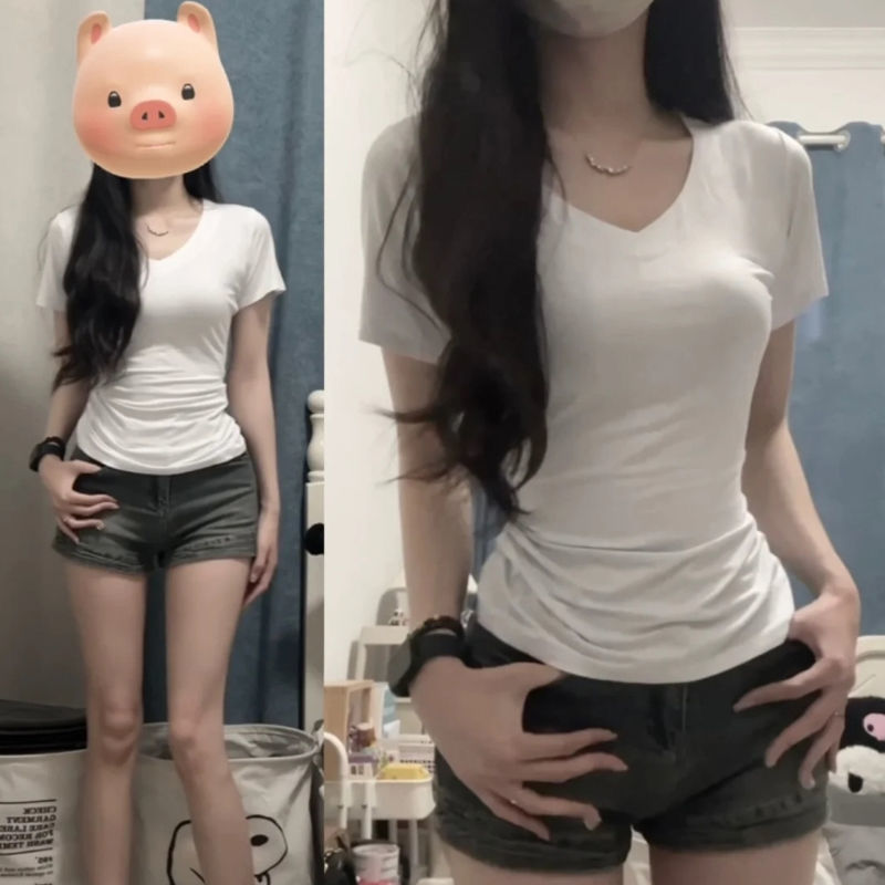 Белая футболка Pure Desire с v-образным вырезом и правым плечом из ледяного шелка с короткими рукавами для девочек, летний обтягивающий талию, сексуальный шикарный топ