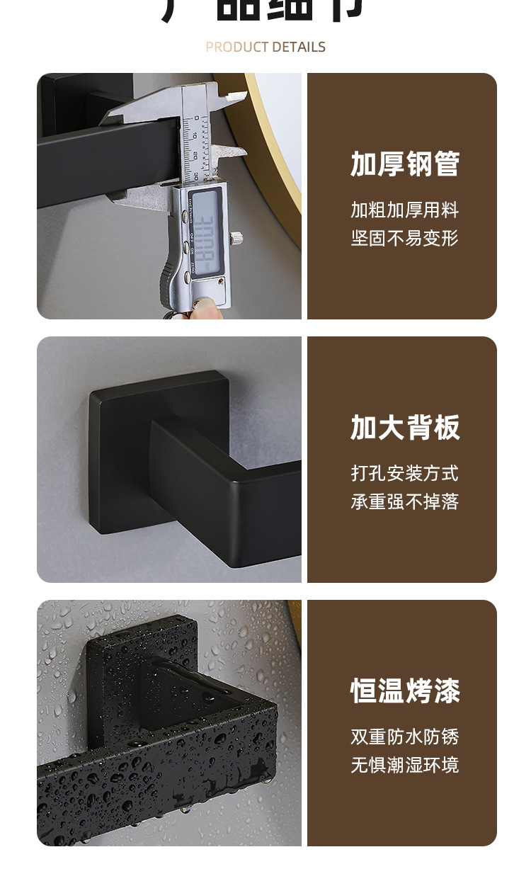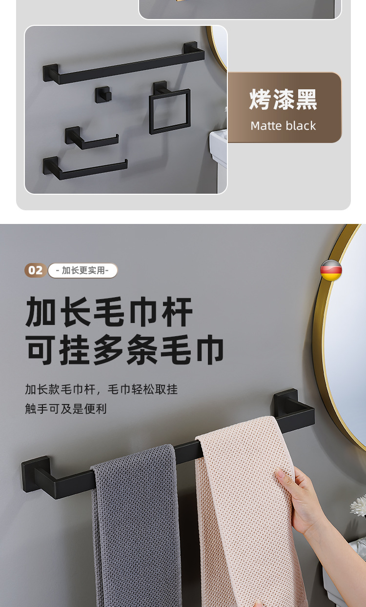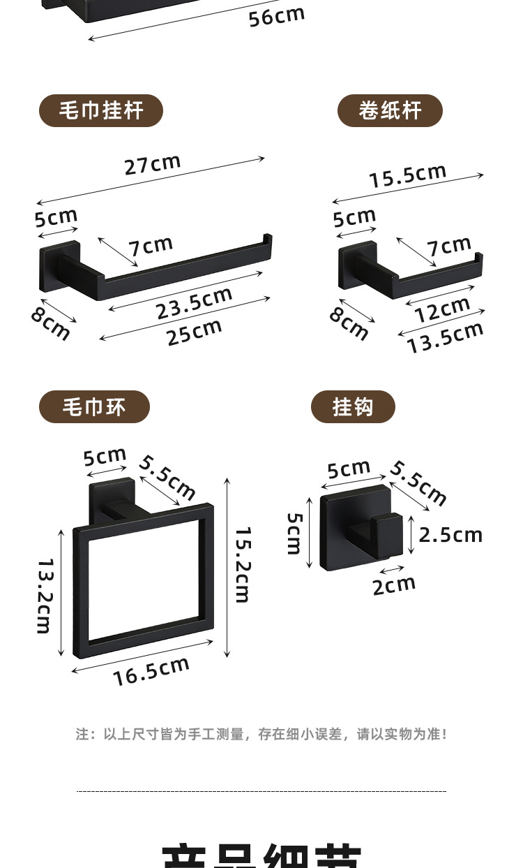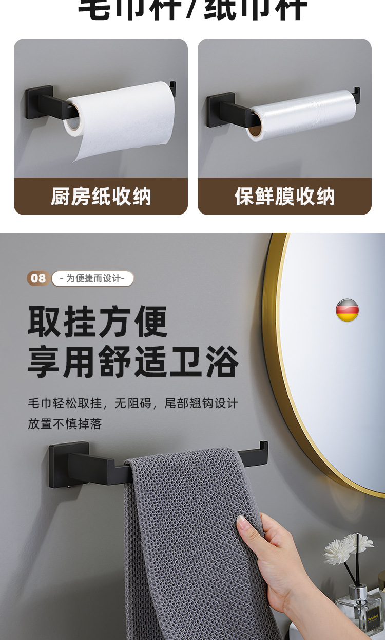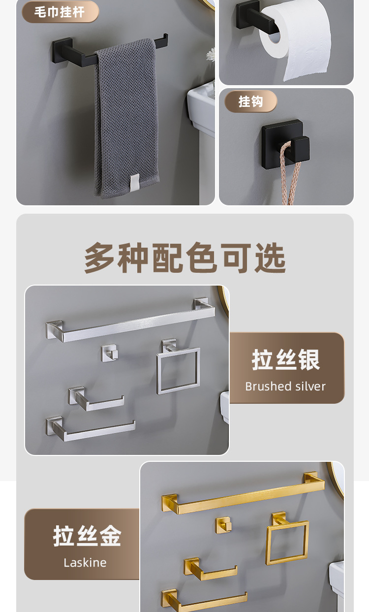 Квадратный черный с перфорацией; Квадратный черный полотенцедержатель с перфорацией; Квадратное черное бумажное полотенце с перфорацией; Квадратное черное полотенце с перфорацией; Квадратный черный набор из трех частей с перфорацией; Квадратный черный набор из четырех штампованных частей; Квадратный черный набор из 4 предметов с перфорацией; Квадратный черный набор крючков из 4 предметов - перфорированный; Квадратный черный набор из пяти штук с перфорацией; 40 длинных черных комплектов из 7 предметов; Набор из 11 длинных квадратных трубок серебристого цвета, 40 штук