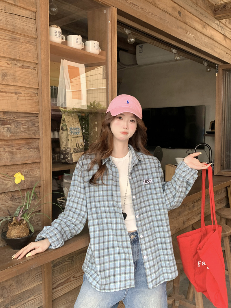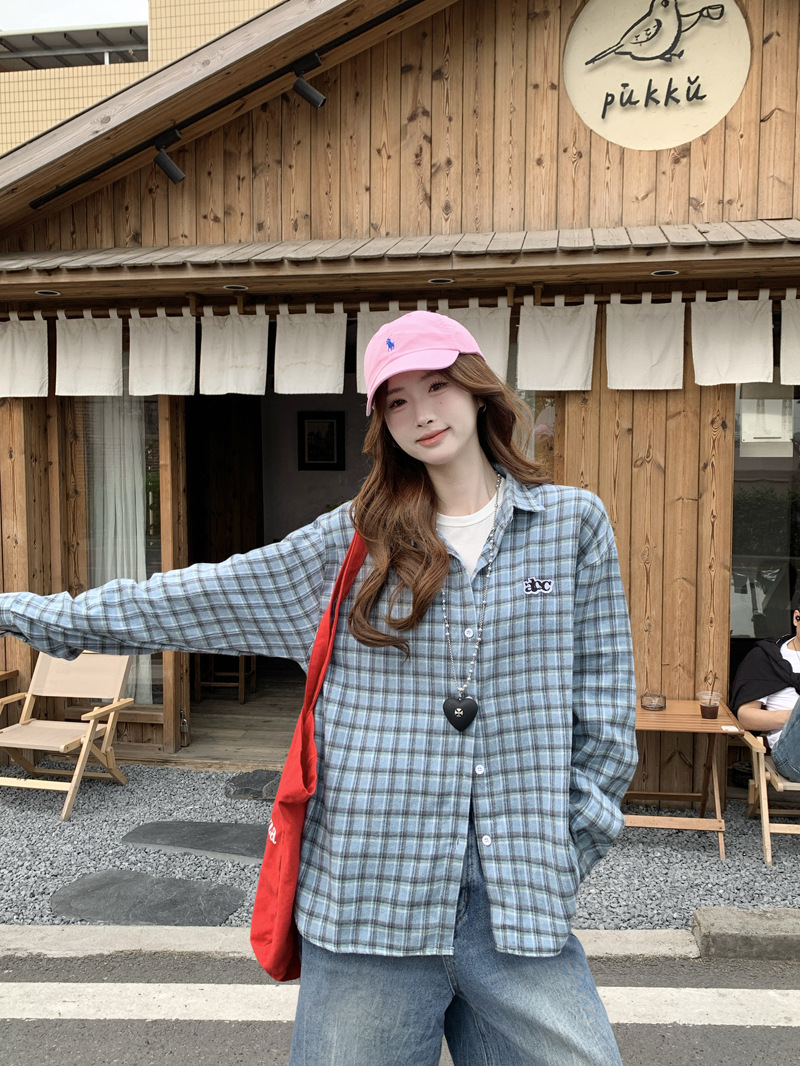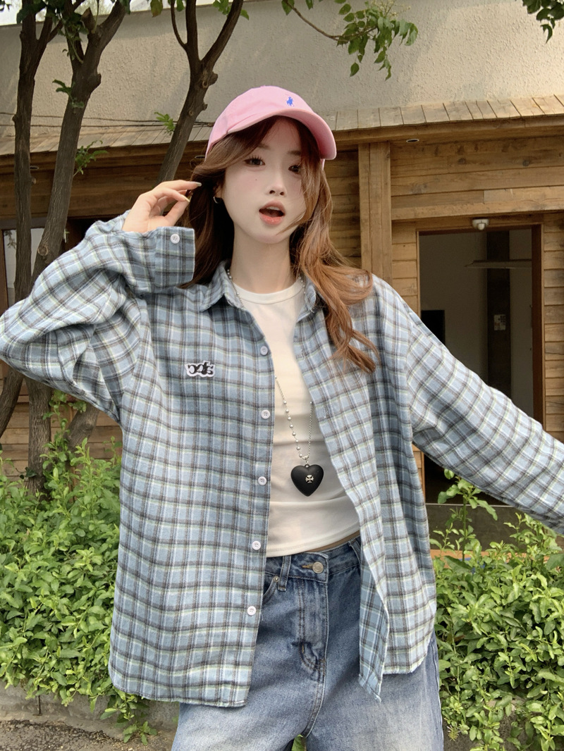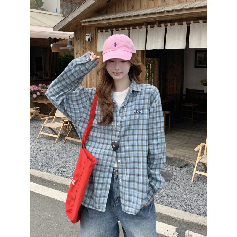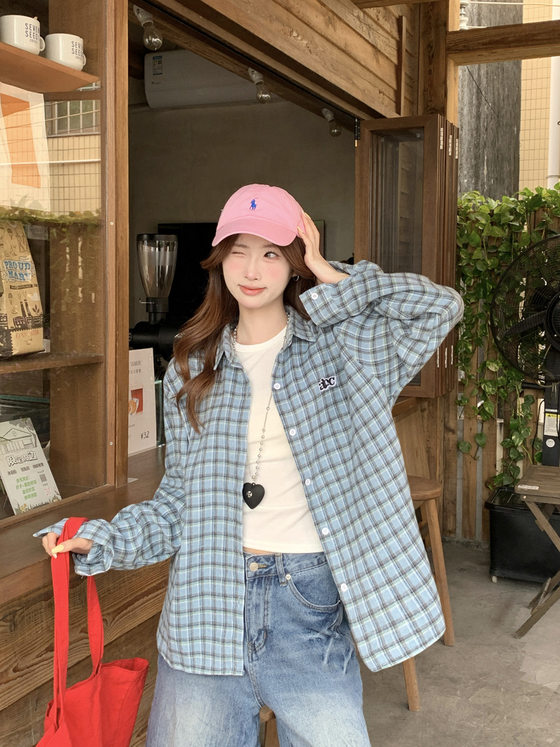 Женская рубашка в ретро-стиле с синей клетчатой вышивкой, свободного кроя, универсальная, с длинным рукавом, весна-осень 2025 года