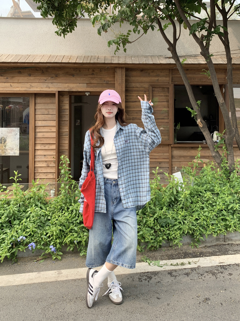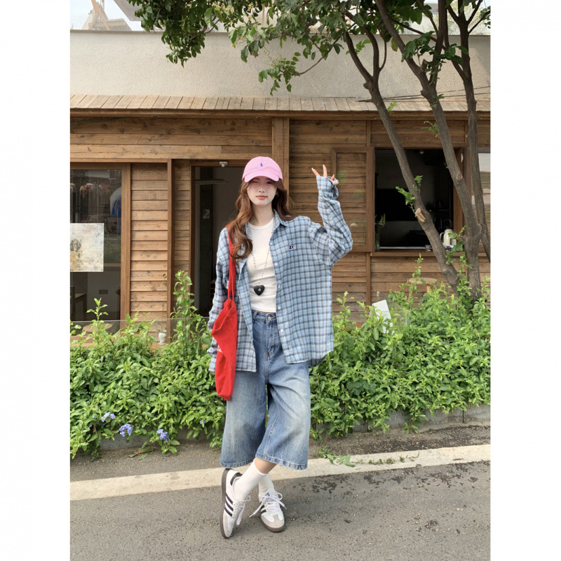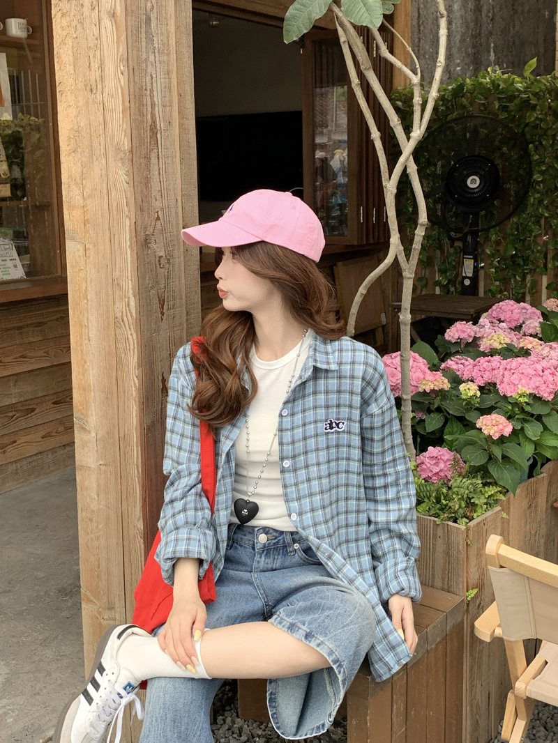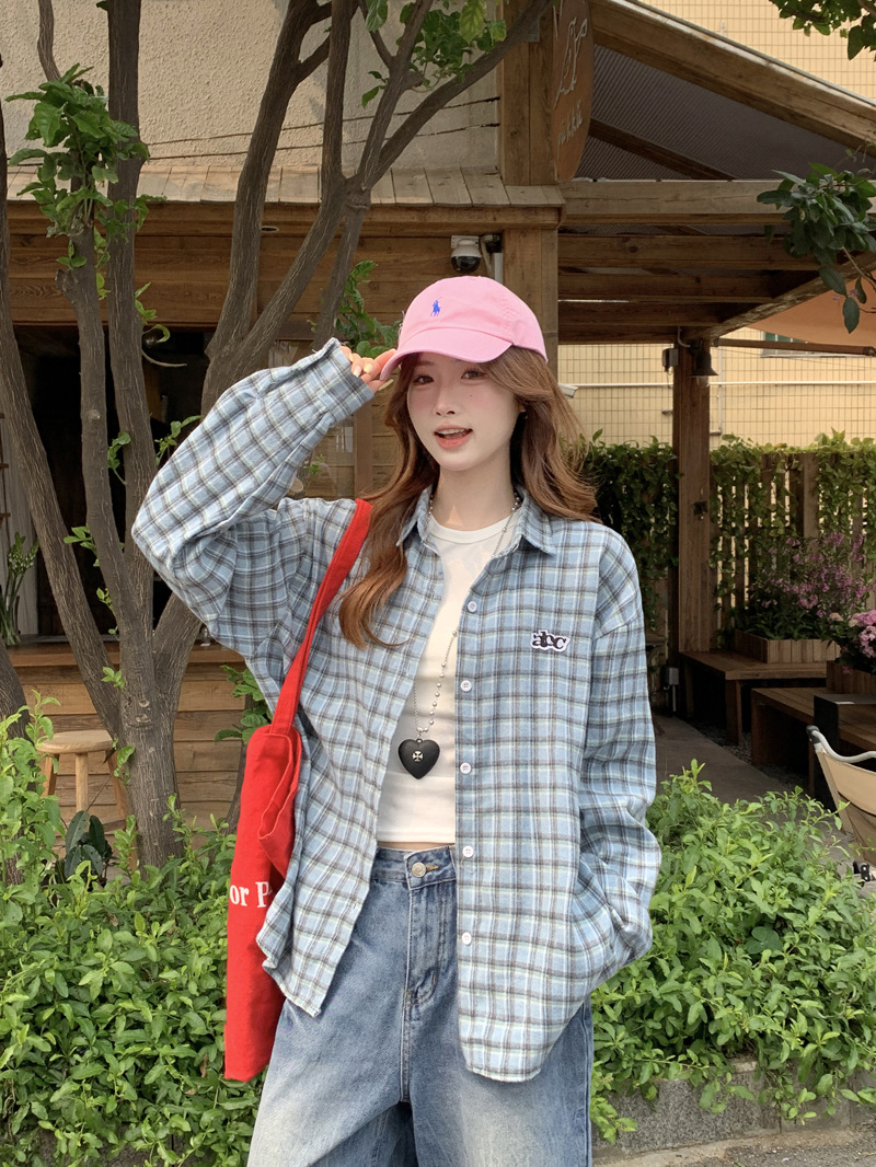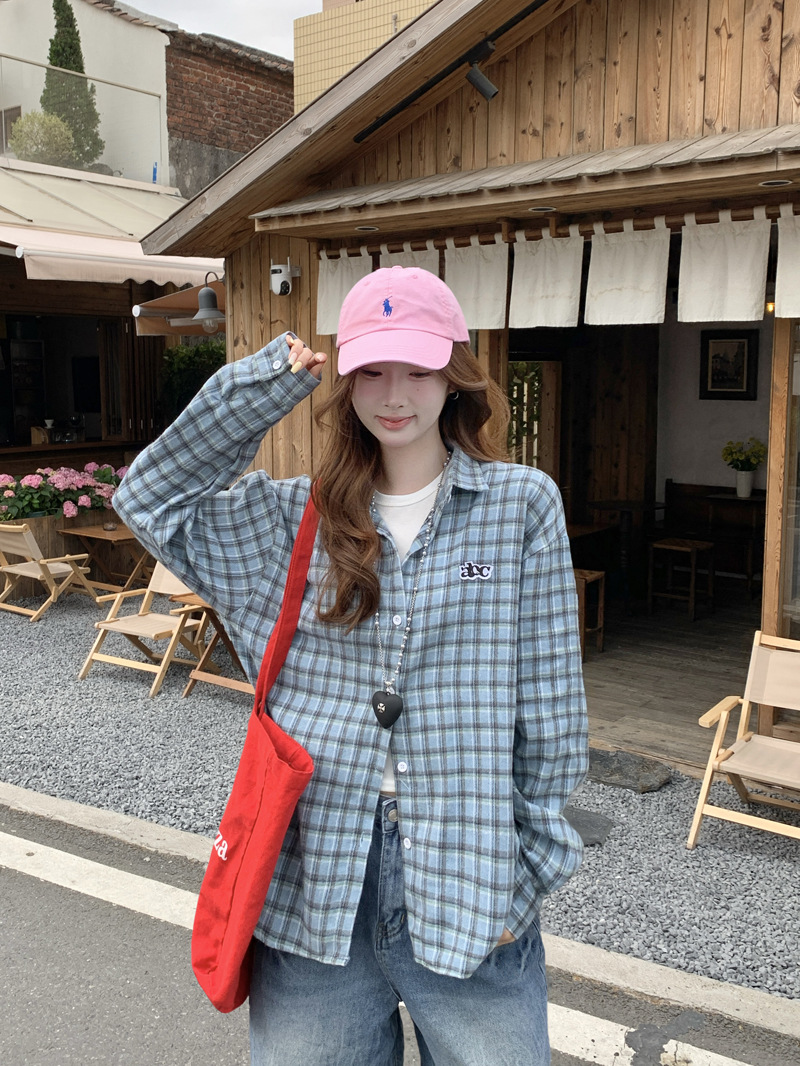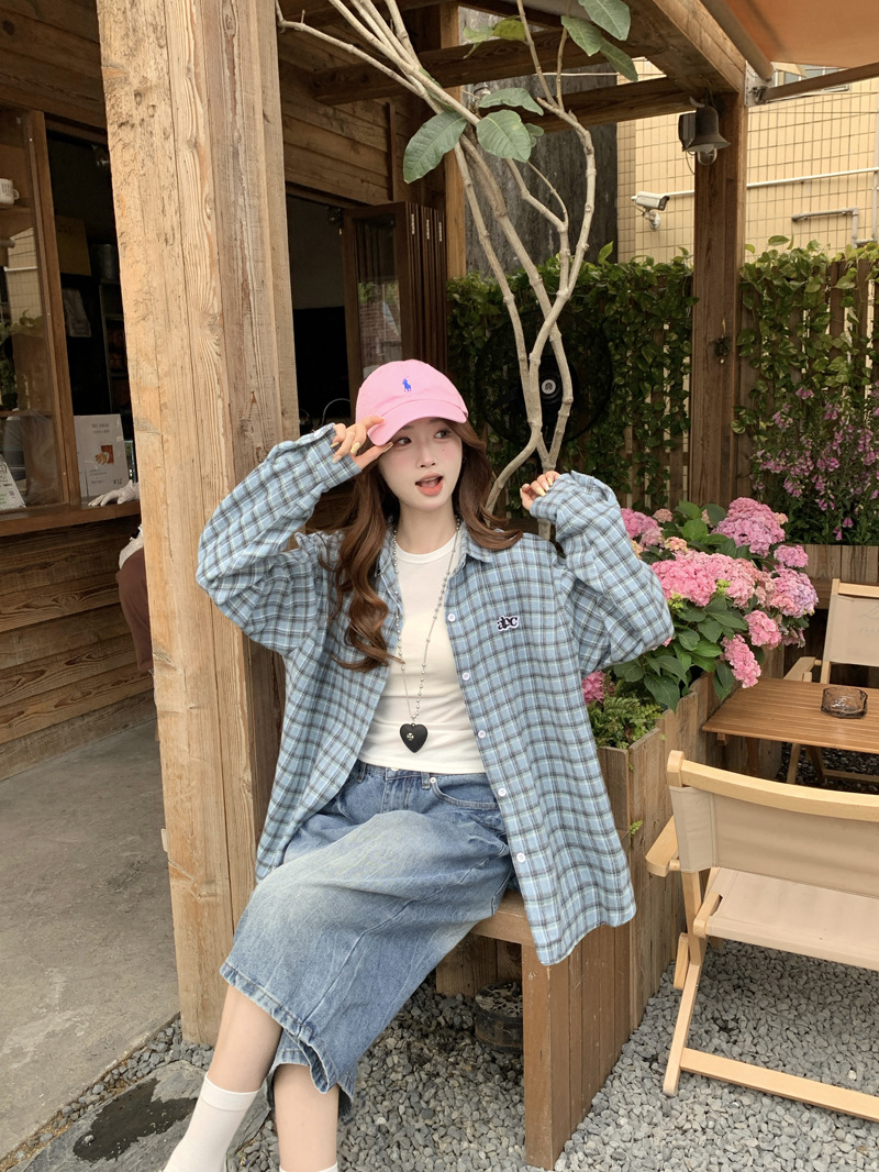 Женская рубашка в ретро-стиле с синей клетчатой вышивкой, свободного кроя, универсальная, с длинным рукавом, весна-осень 2025 года