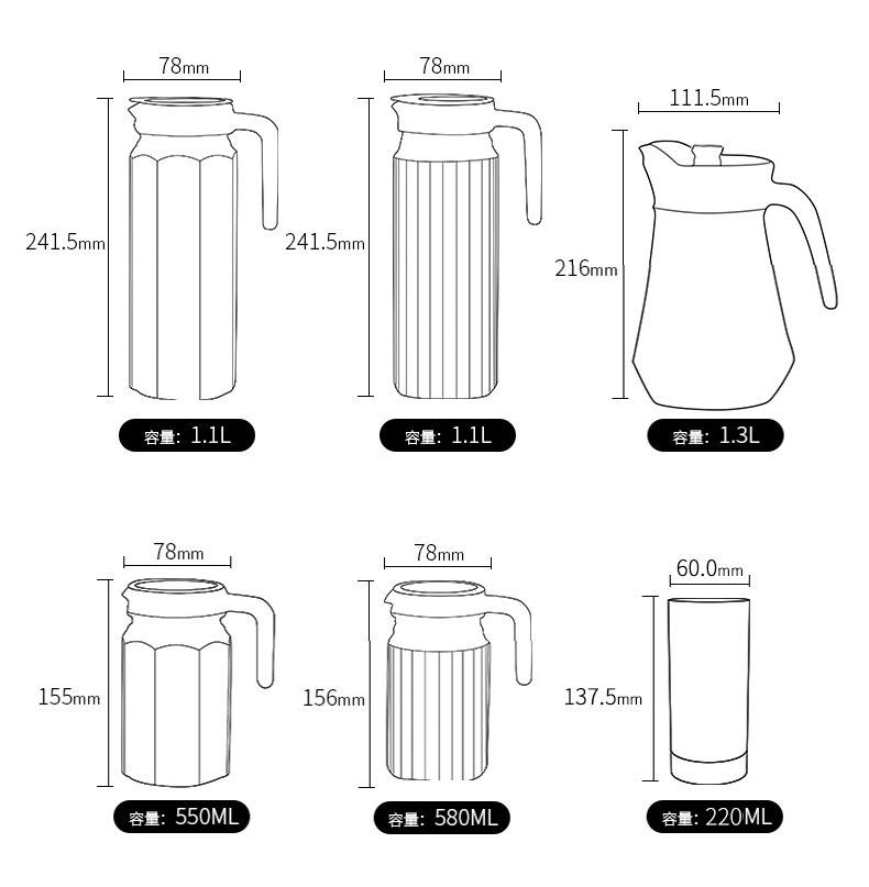 Вертикальный чайник объемом 1,1 л.; Восьмиугольная кастрюля объемом 1,1 литра.; Чайник «утконос» объемом 1,3 л.; Прямая кастрюля объемом 1,2 литра (наполняйте кипятком напрямую); Кастрюля объемом 1,4 литра (наполняйте кипятком напрямую); Кастрюля объемом 1,8 литра (наполняйте кипятком напрямую); 2,0 литра чайника белого цвета (наполняйте кипятком напрямую); 6 высоких круглых чашек; Вертикальный чайник объемом 1,1 литра с 6 высокими чашками.; Восьмиугольная кастрюля объемом 1,1 литра с 6 высокими чашками.; Чайник «утконос» объемом 1,3 л с 6 высокими чашками.
