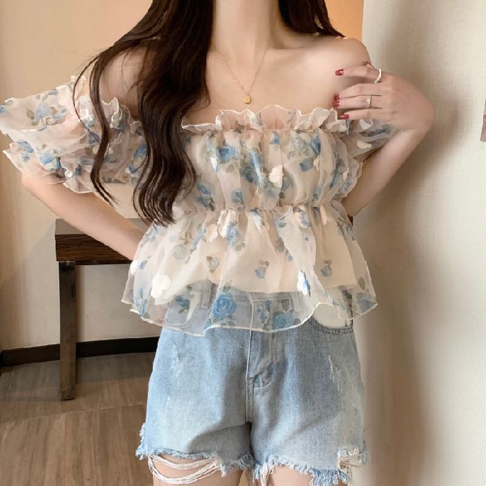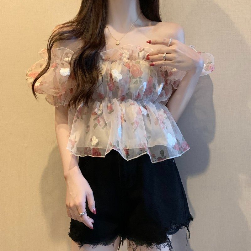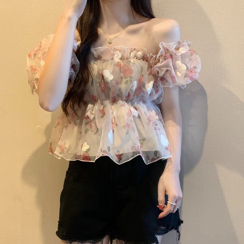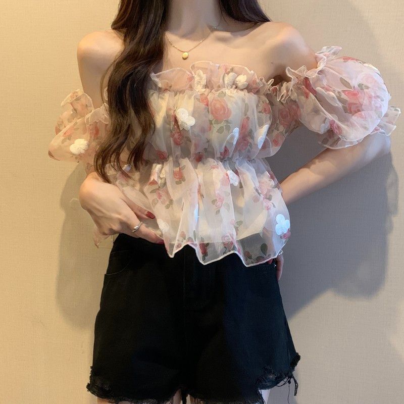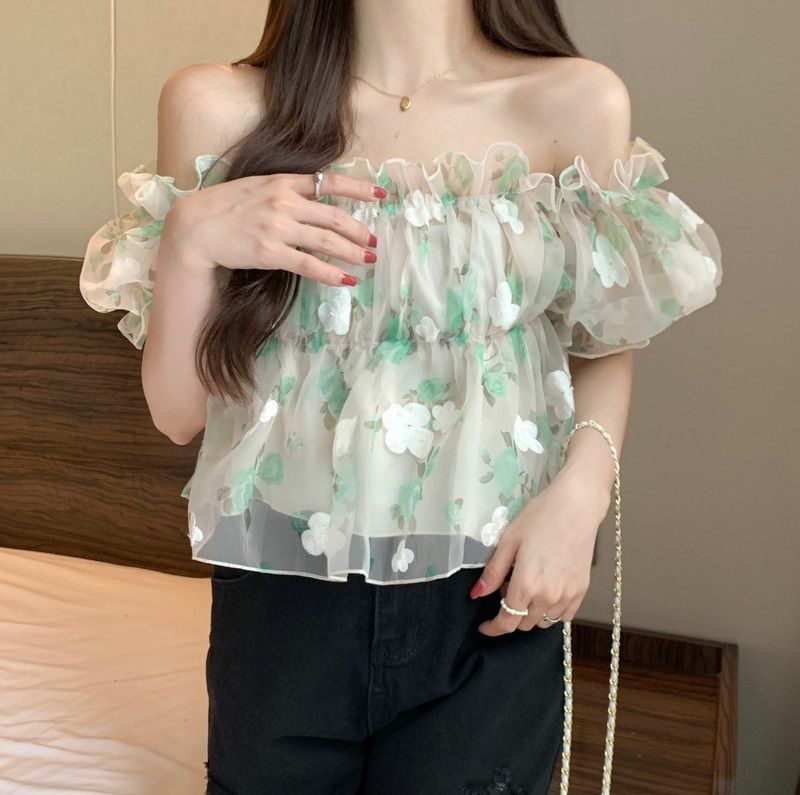 Женская летняя шифоновая блузка с вышивкой, пышным рукавом и одним плечом, для внешней торговли, 2025 года, стройнящая и милая.