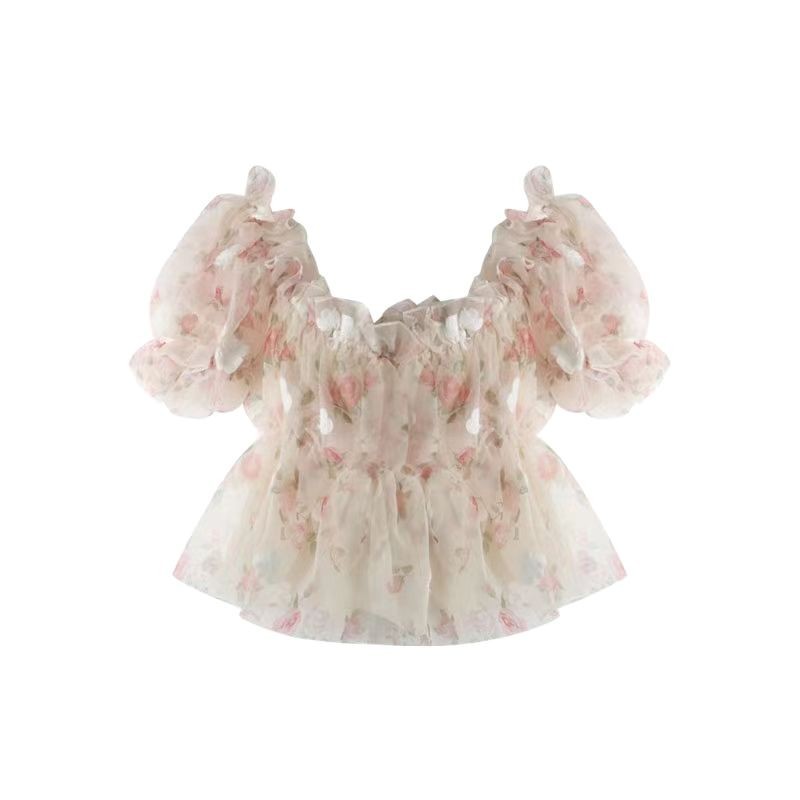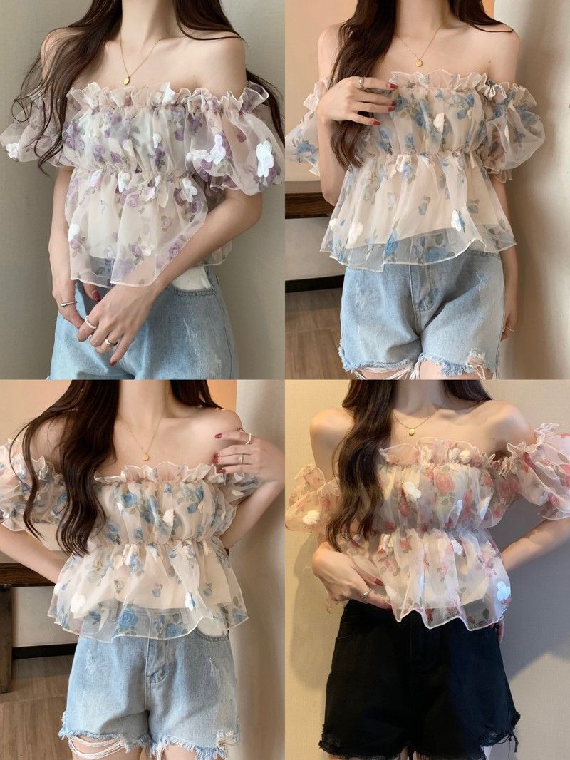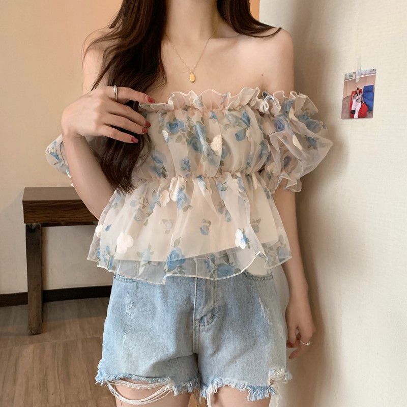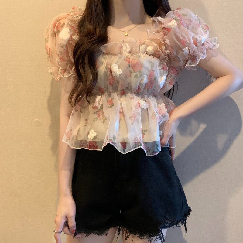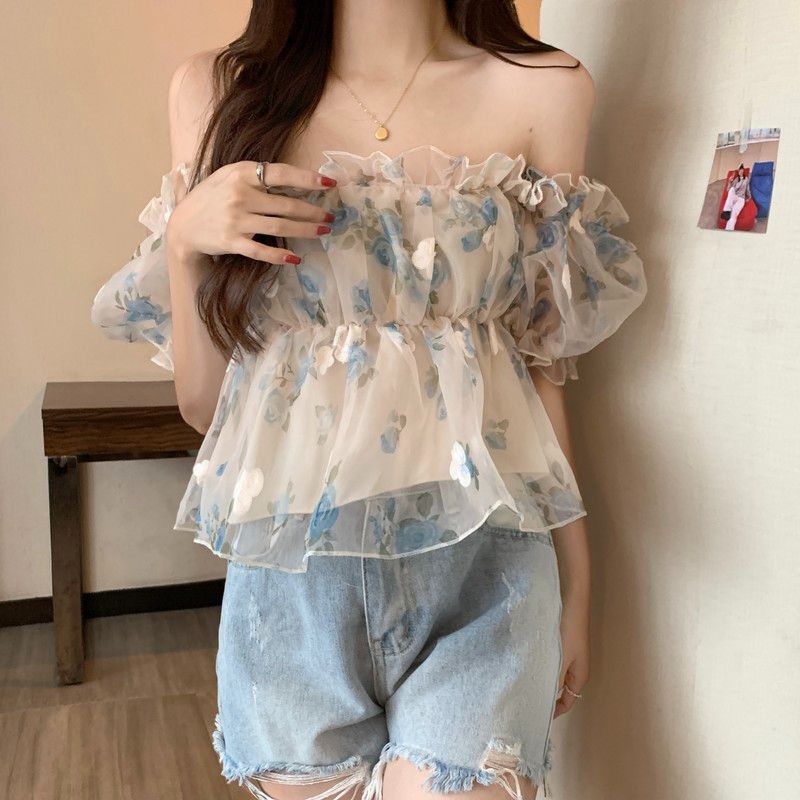 Женская летняя шифоновая блузка с вышивкой, пышным рукавом и одним плечом, для внешней торговли, 2025 года, стройнящая и милая.