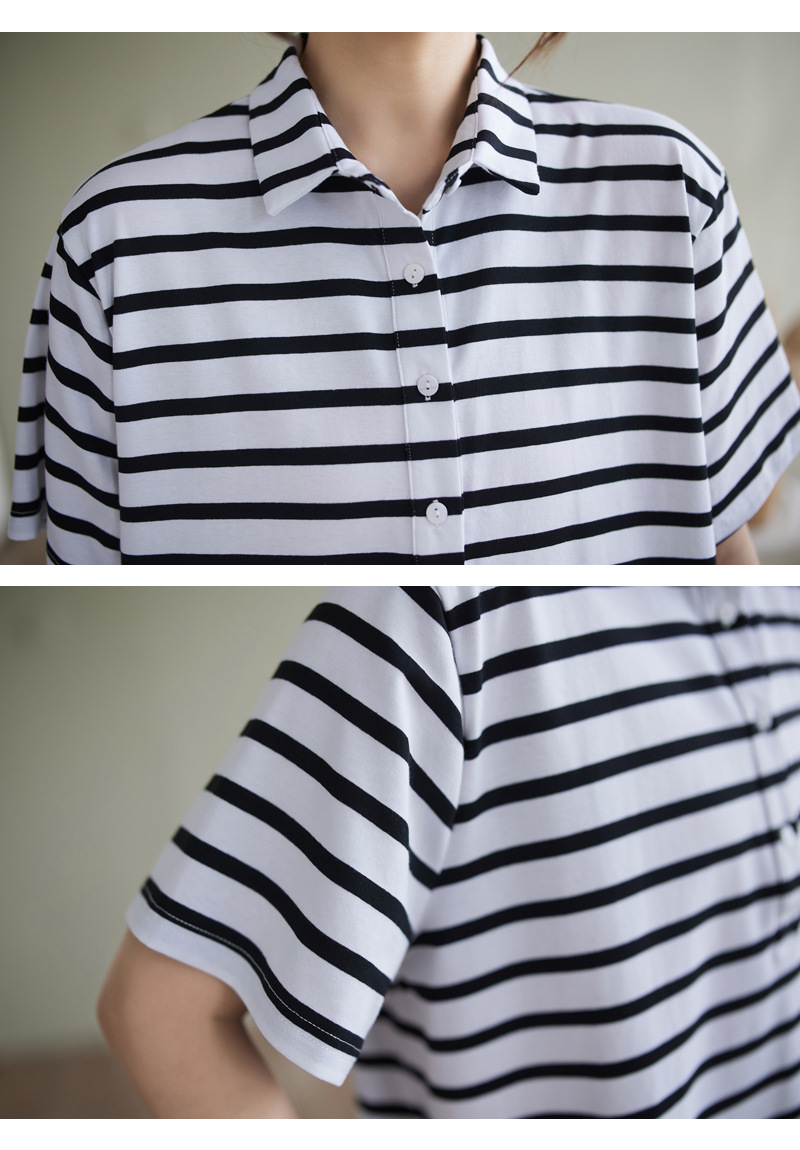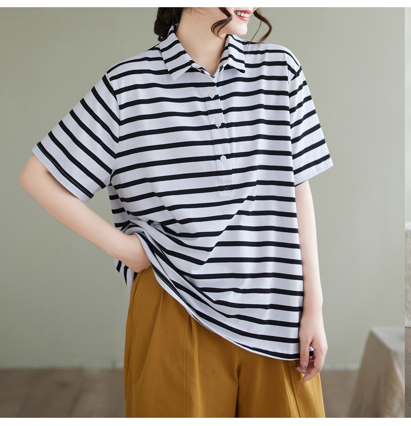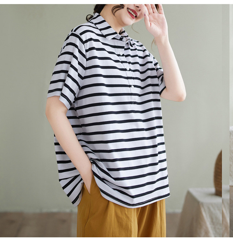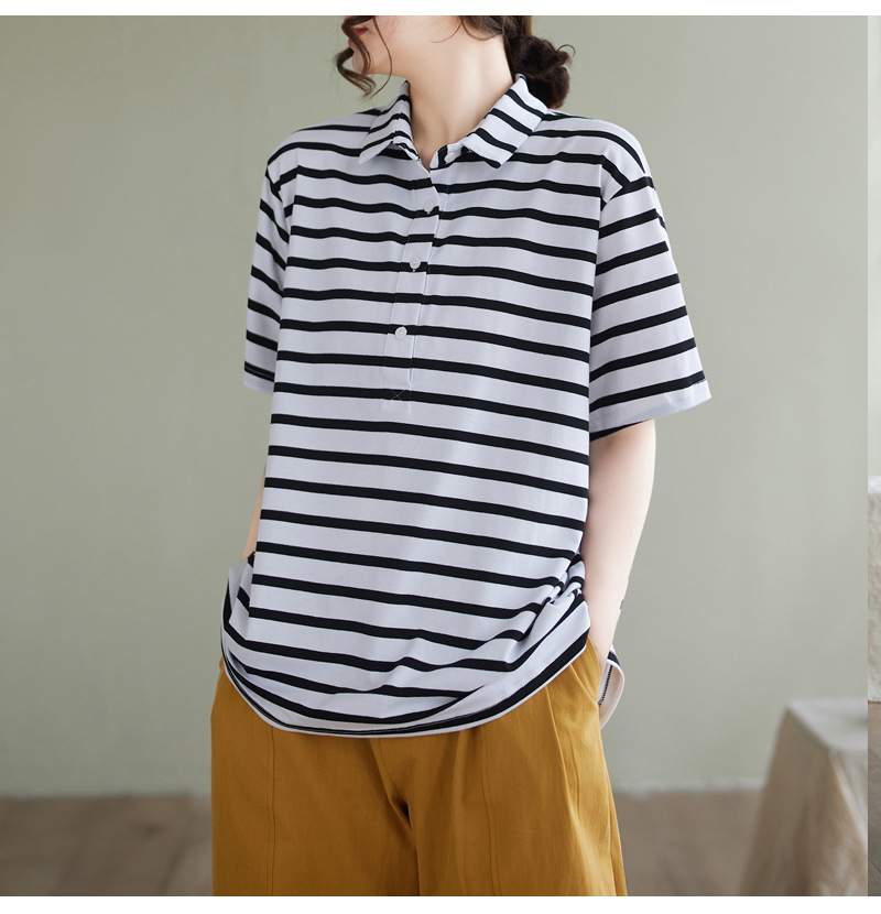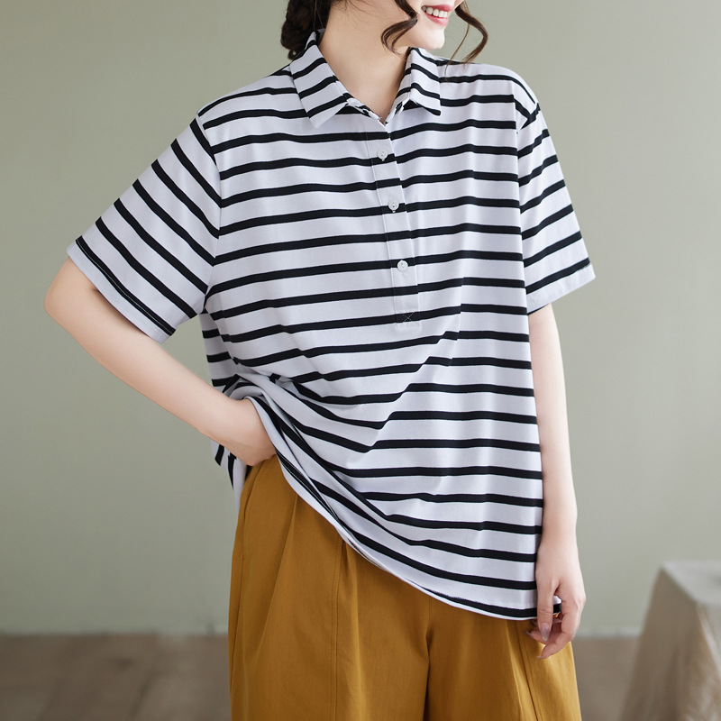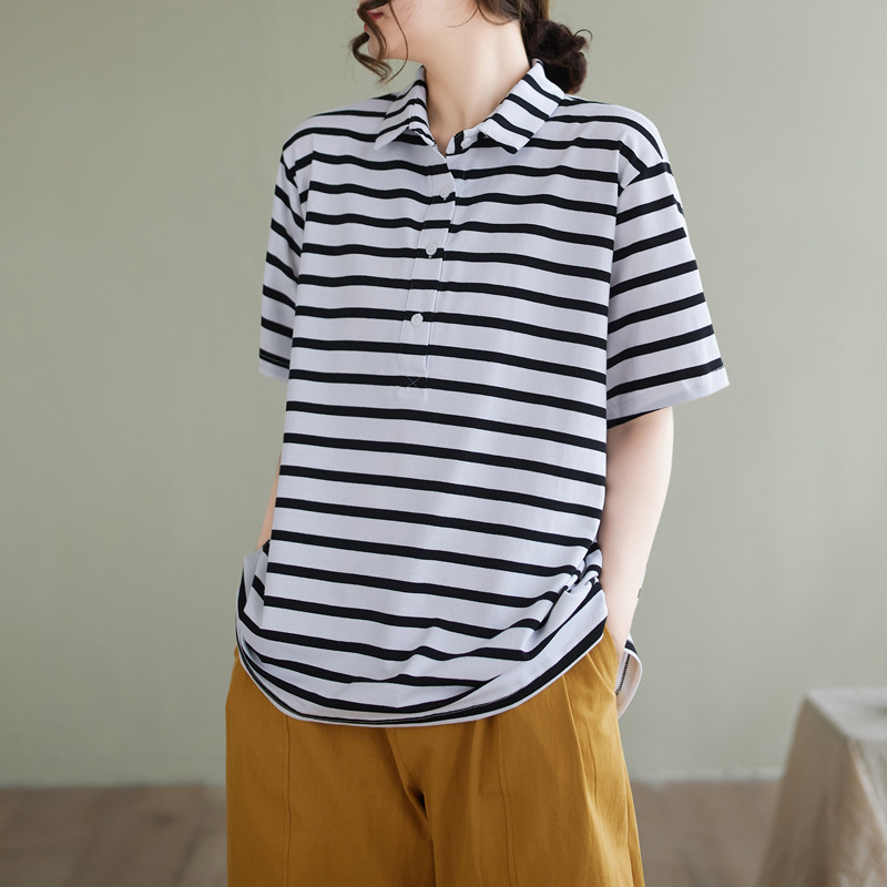 Художественно-простой пригородной свободная хлопковая футболка с короткими рукавами Polo с воротником в полоску топ для женщин