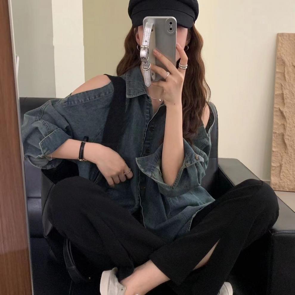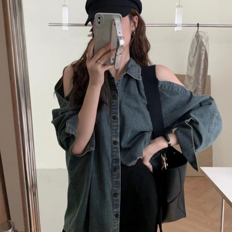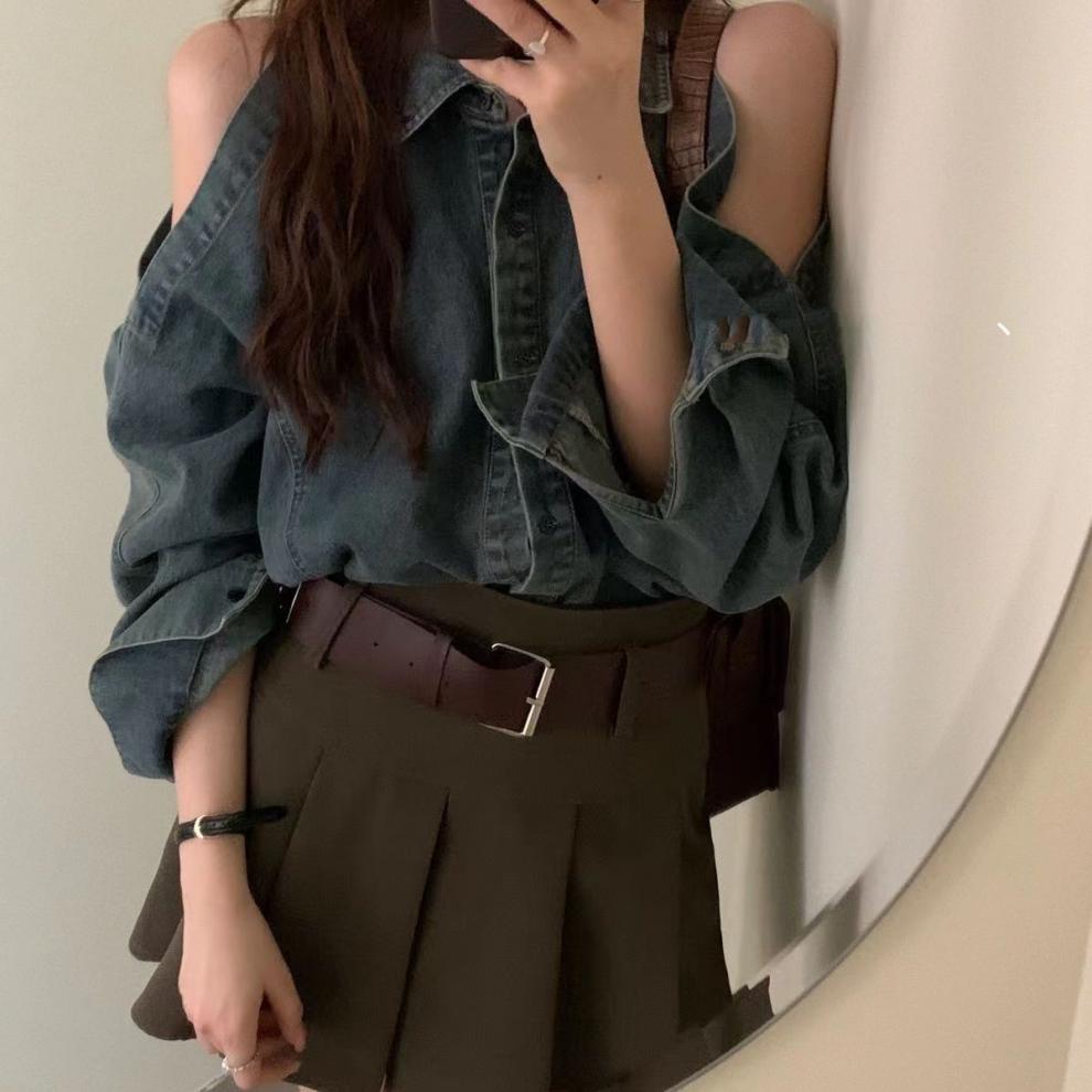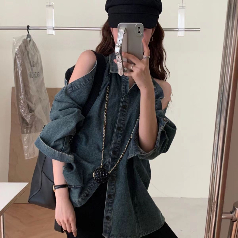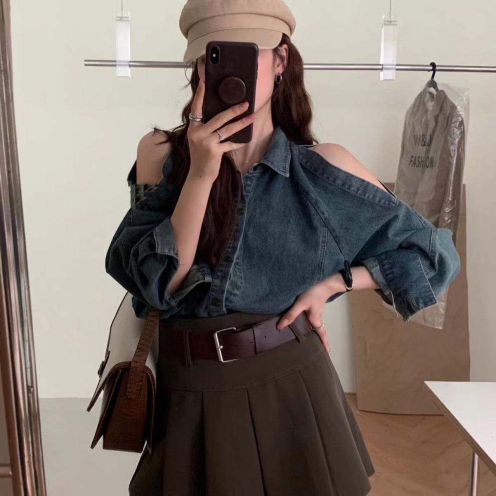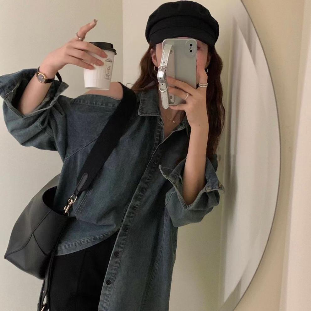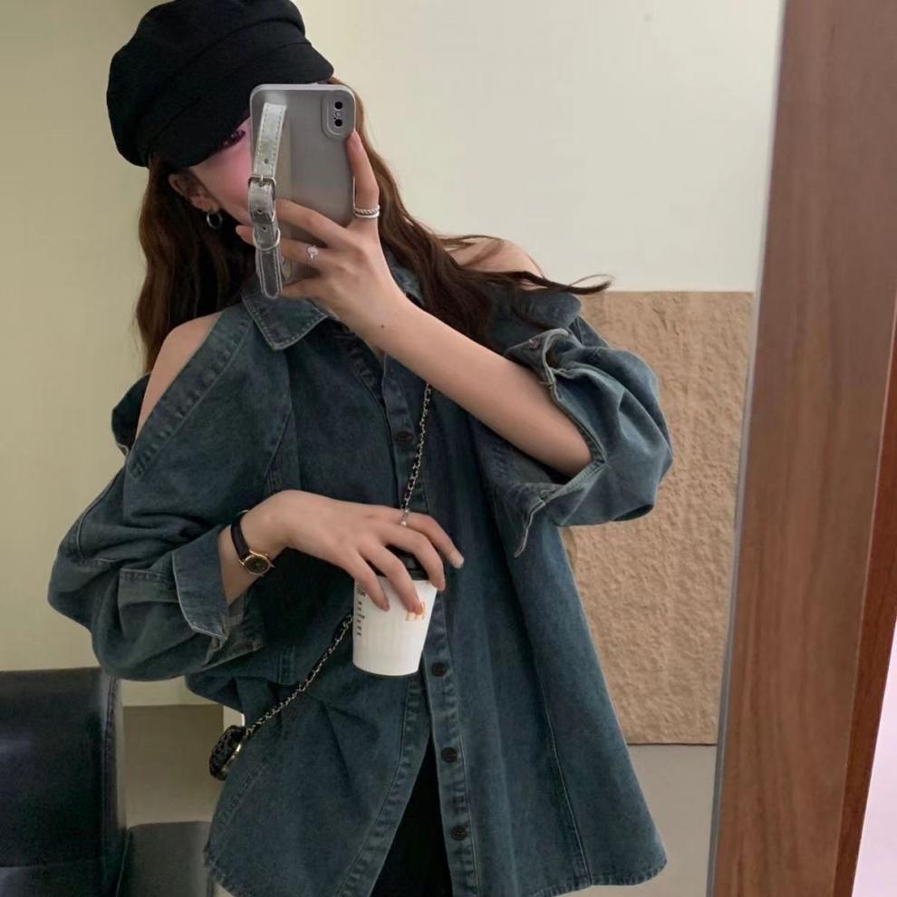 Джинсовая куртка-рубашка с длинными рукавами и открытыми плечами для женщин, осень 2025, новый дизайн в стиле Гонконг
