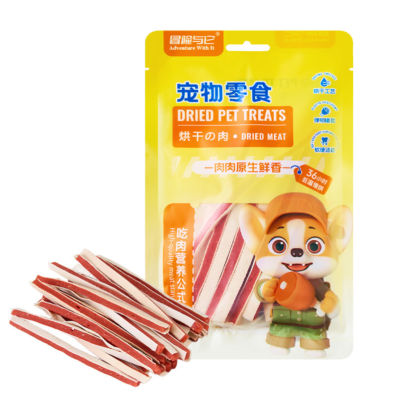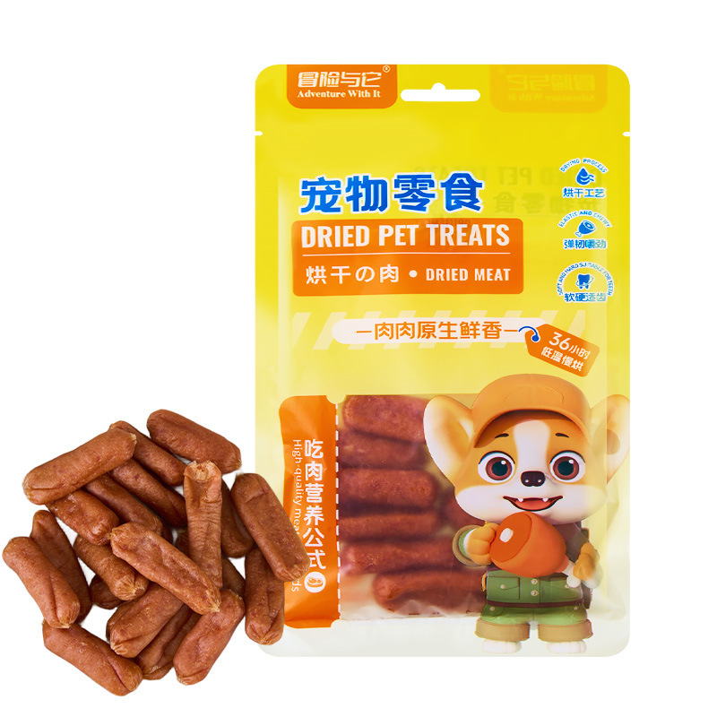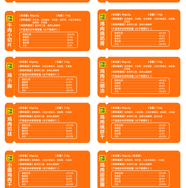 Тертая говядина – 110 г.; Мясо говядины небольшие ломтики-110г; Грудка куриная - 110 г.; Шинкованная курица-110г; Куриное вяленое мясо маленькое круглое-110г; Куриная колбаса - 110 г.; Курица, обернутая молочной костью-110г; Сэндвич с курицей-110г; Печенье с курицей-110г; Куриный пончик-38г одинарный