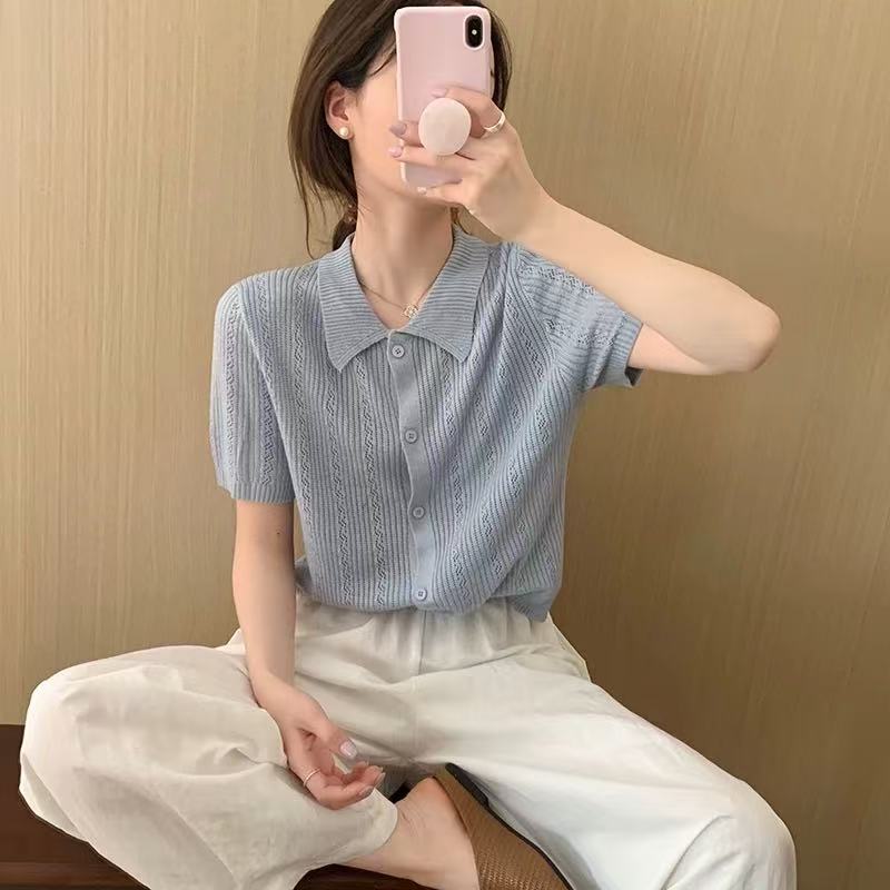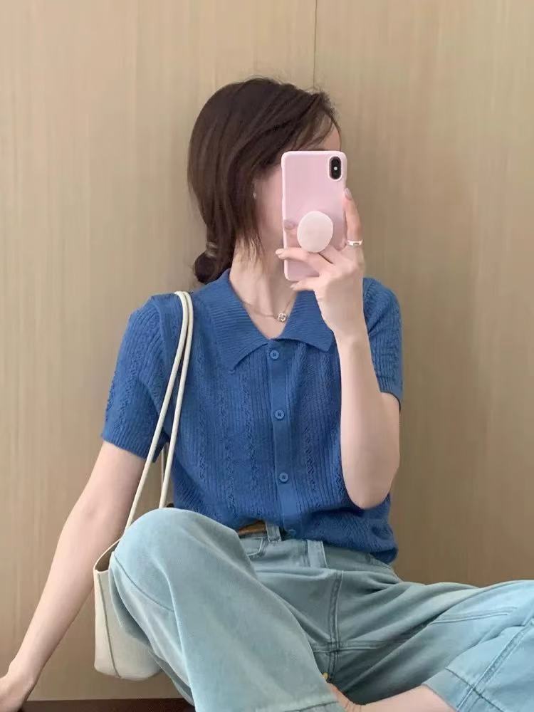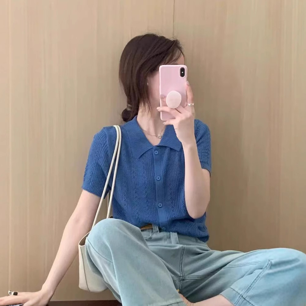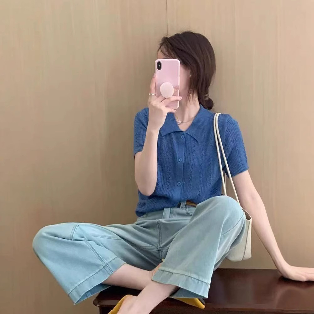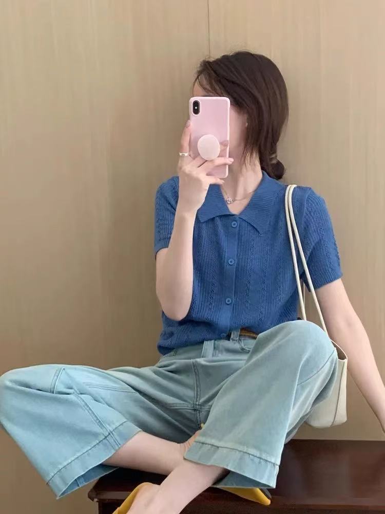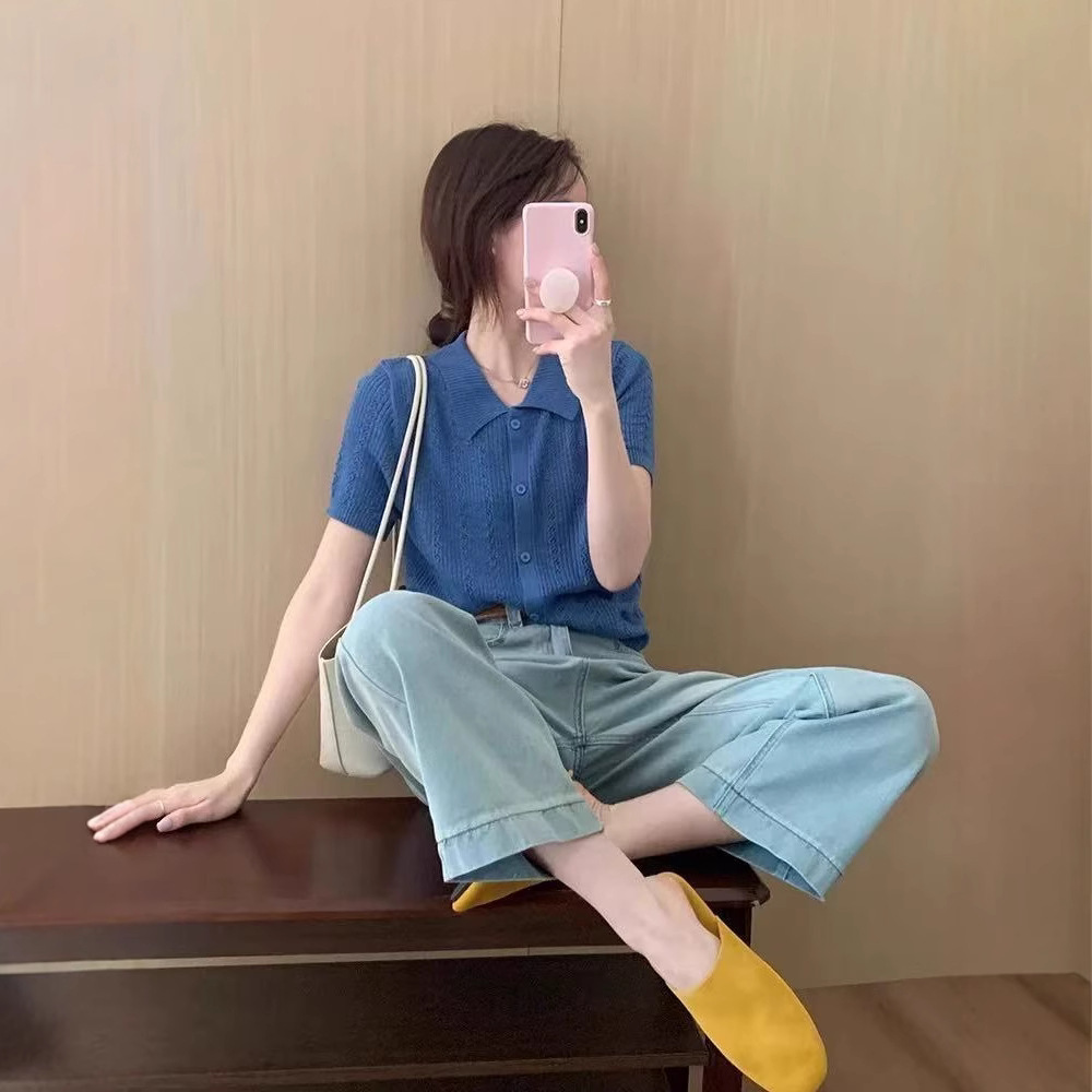 Французский Кляйн синий поло-воротник трикотажный ледяной шелковый укороченный топ женский летний уникальный