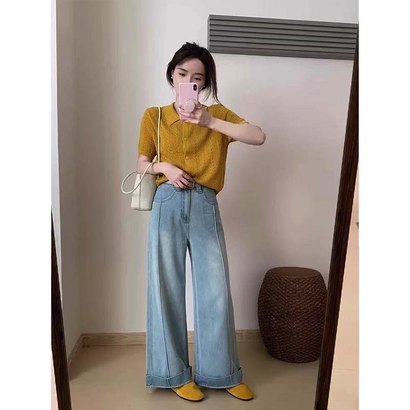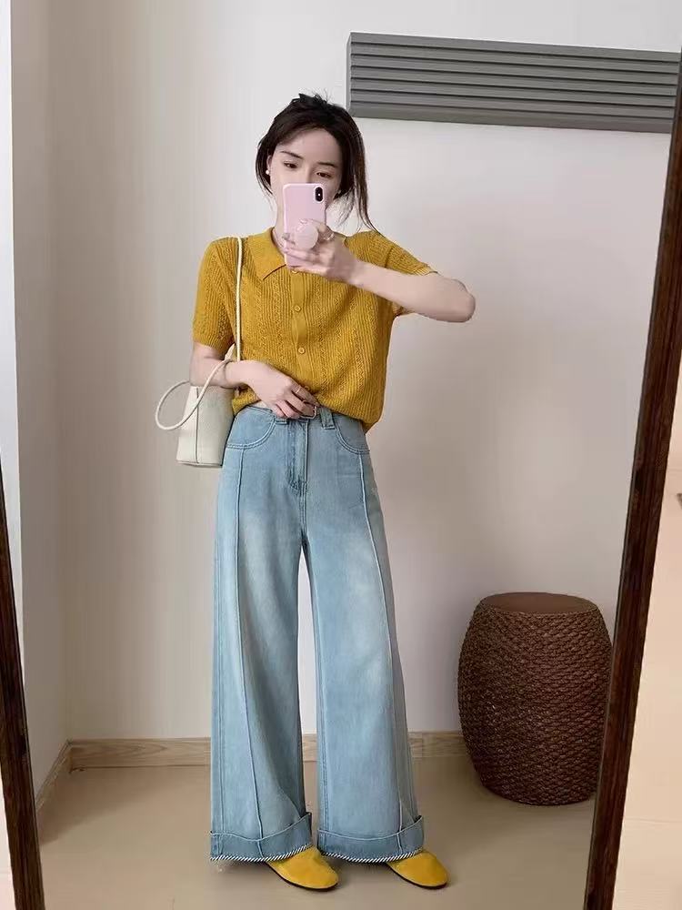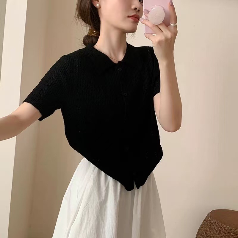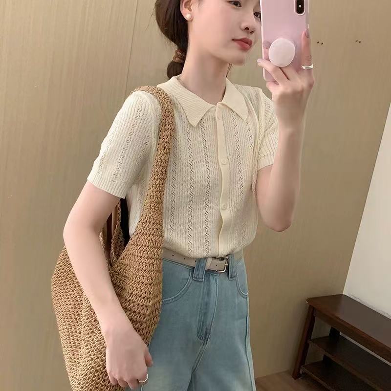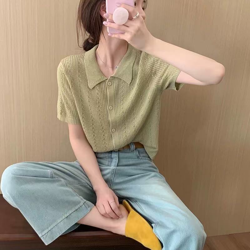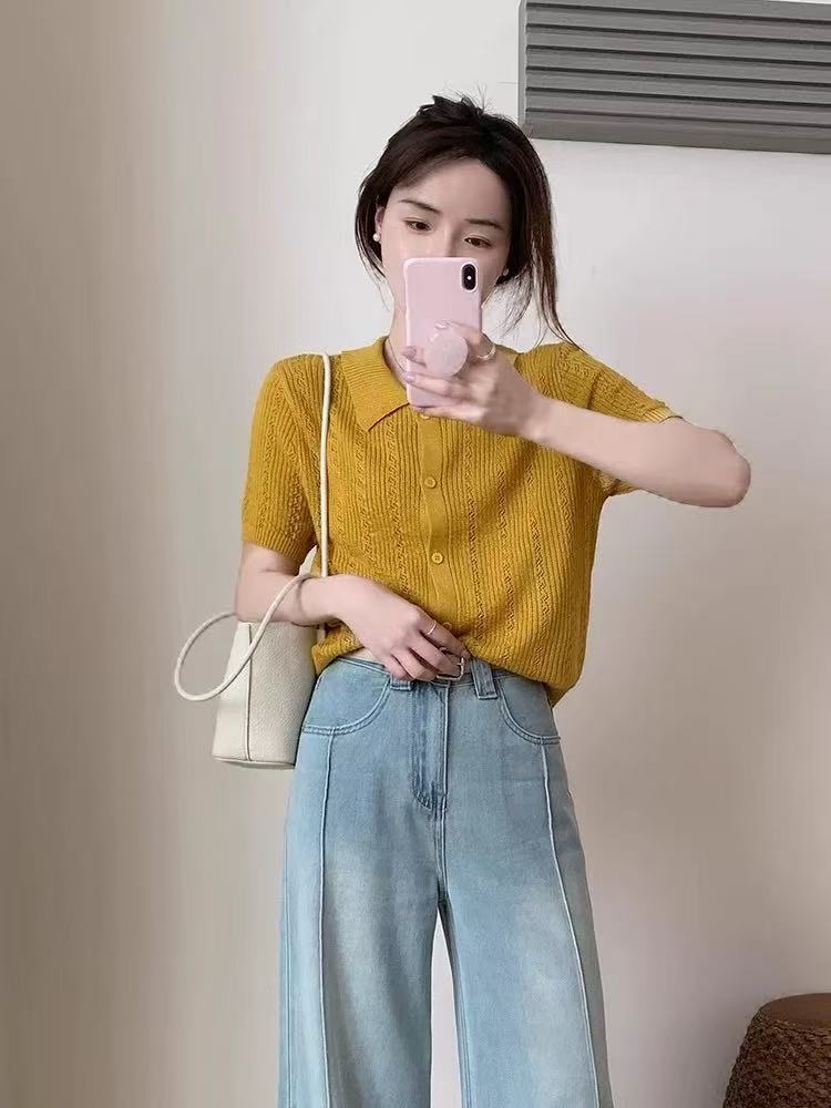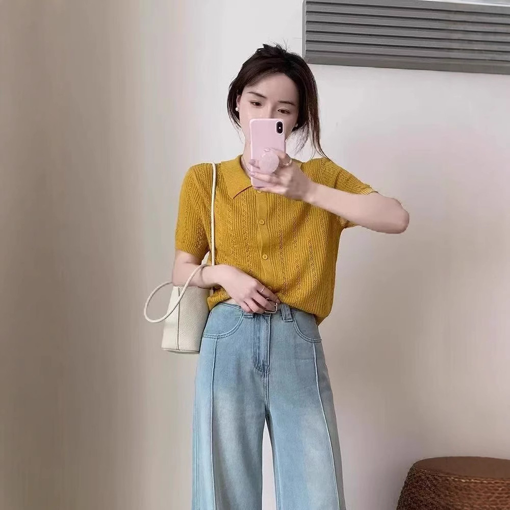 Французский Кляйн синий поло-воротник трикотажный ледяной шелковый укороченный топ женский летний уникальный