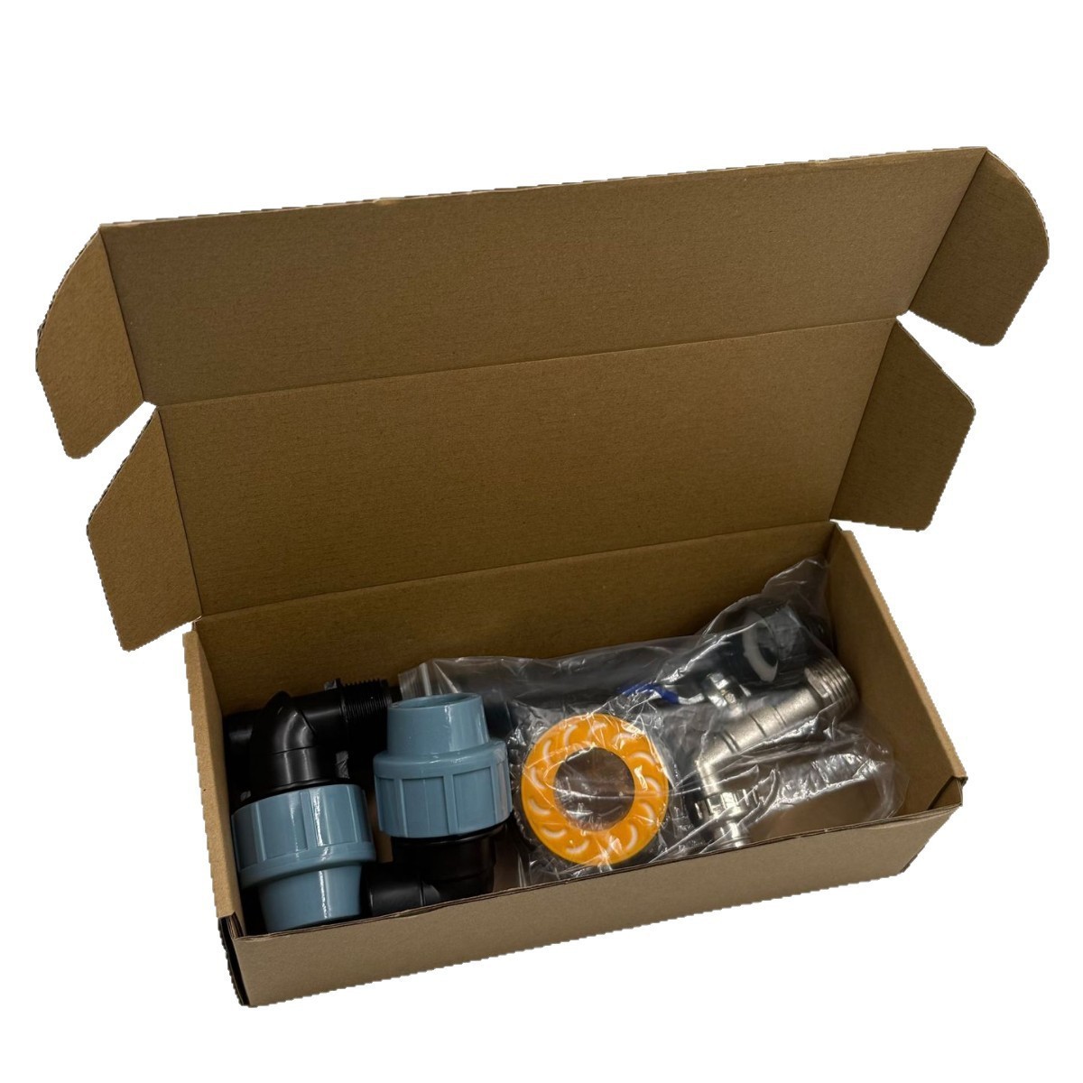 配件:内丝弯头+外丝弯头+25厘米PE管+3/4锌合金水嘴+一寸奶嘴+15米生料带
