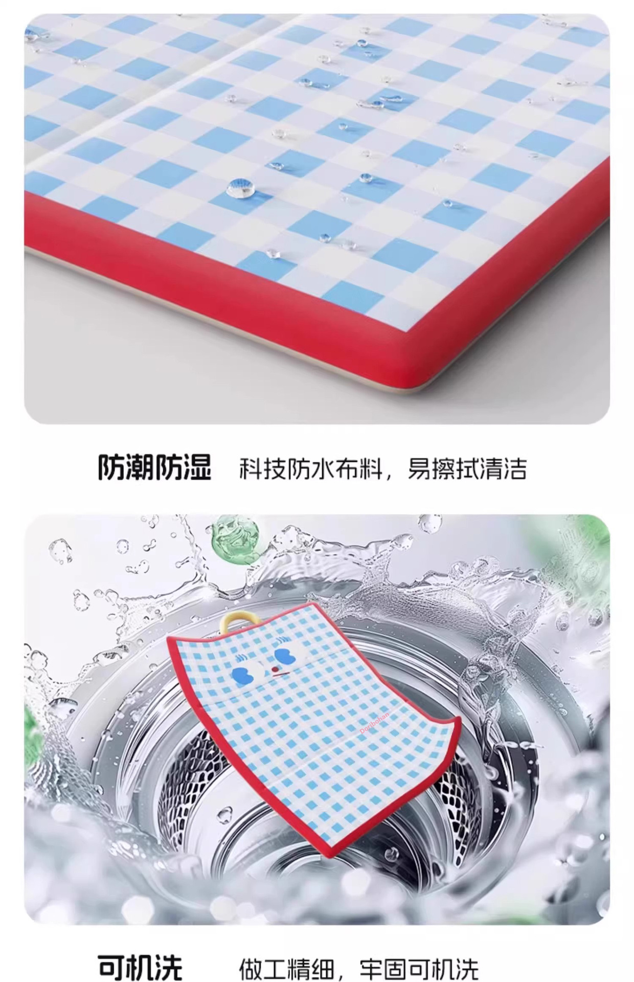 Розовый с синим краем — водонепроницаемый и влагостойкий [полностью машинная стирка]; Синяя сетка с красной кромкой — водонепроницаемая и влагостойкая [можно стирать в машине]; Волно-точечный матча [двусторонний, складной для хранения] можно стирать в машине; Полосатый латте [Двусторонний, складной и удобный для хранения] Можно стирать в машине