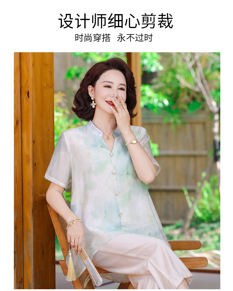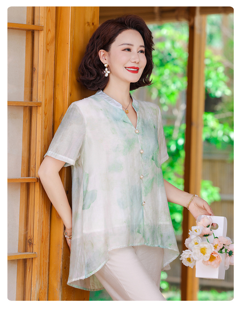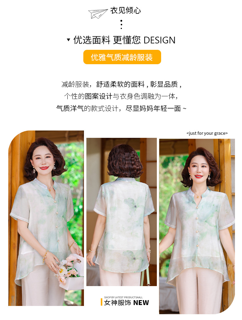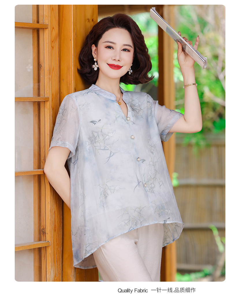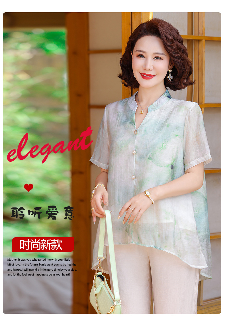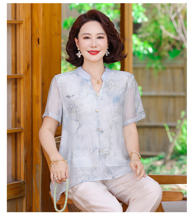 Мама среднего возраста летняя шифоновая рубашка 2025 новый средний и пожилой леди рубашка с короткими рукавами показывает молодой топ