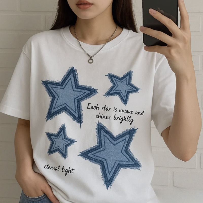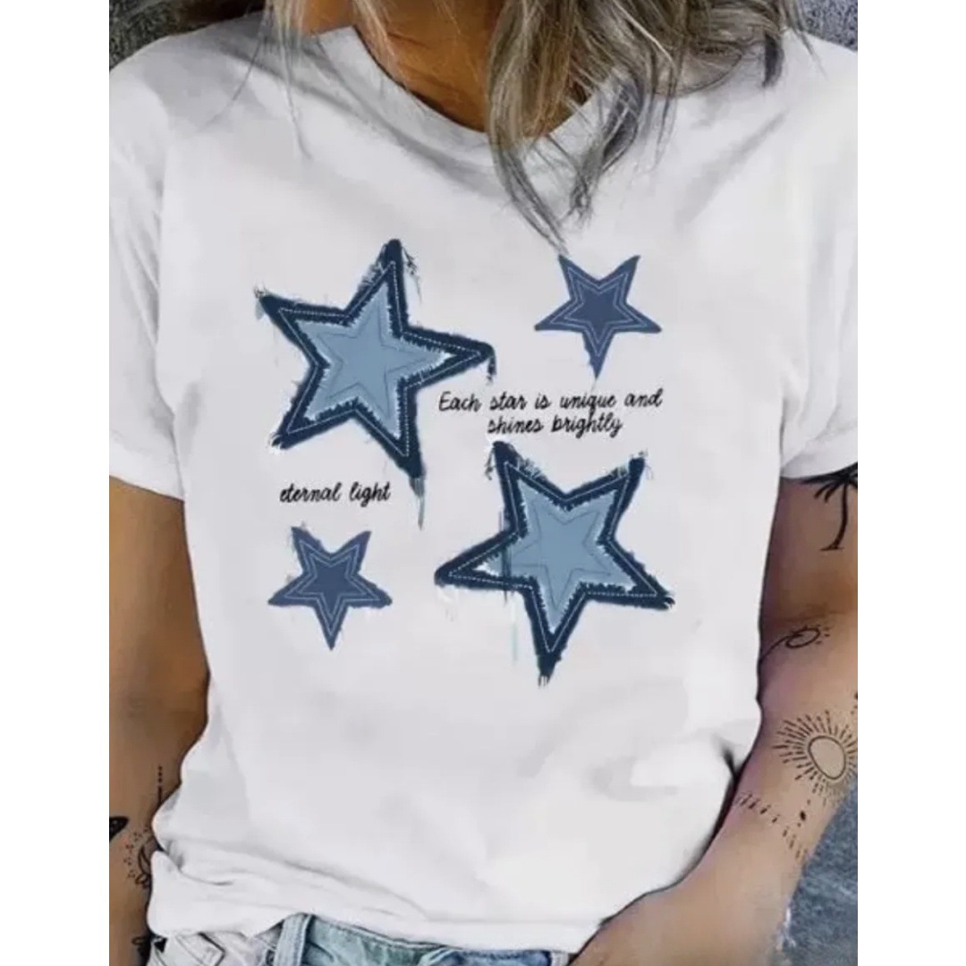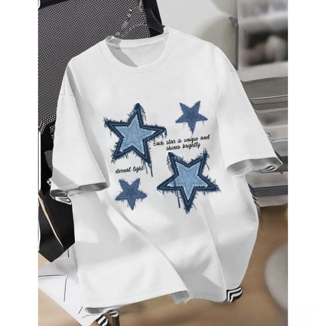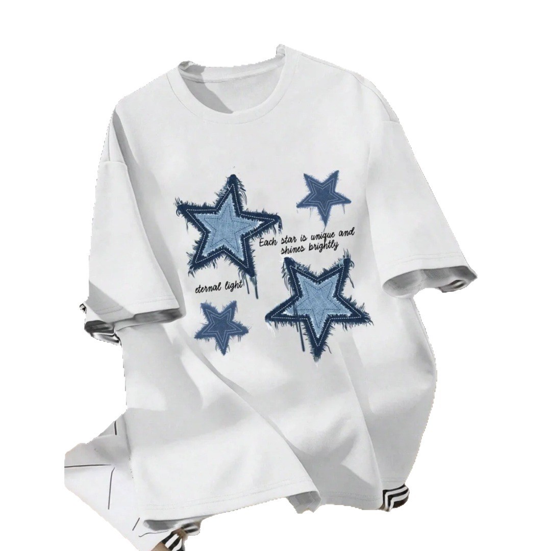 Европейская и американская внешняя торговля трансграничная хлопчатобумажная футболка с короткими рукавами женская свободная средняя длинная джинсовая рубашка с принтом звезды