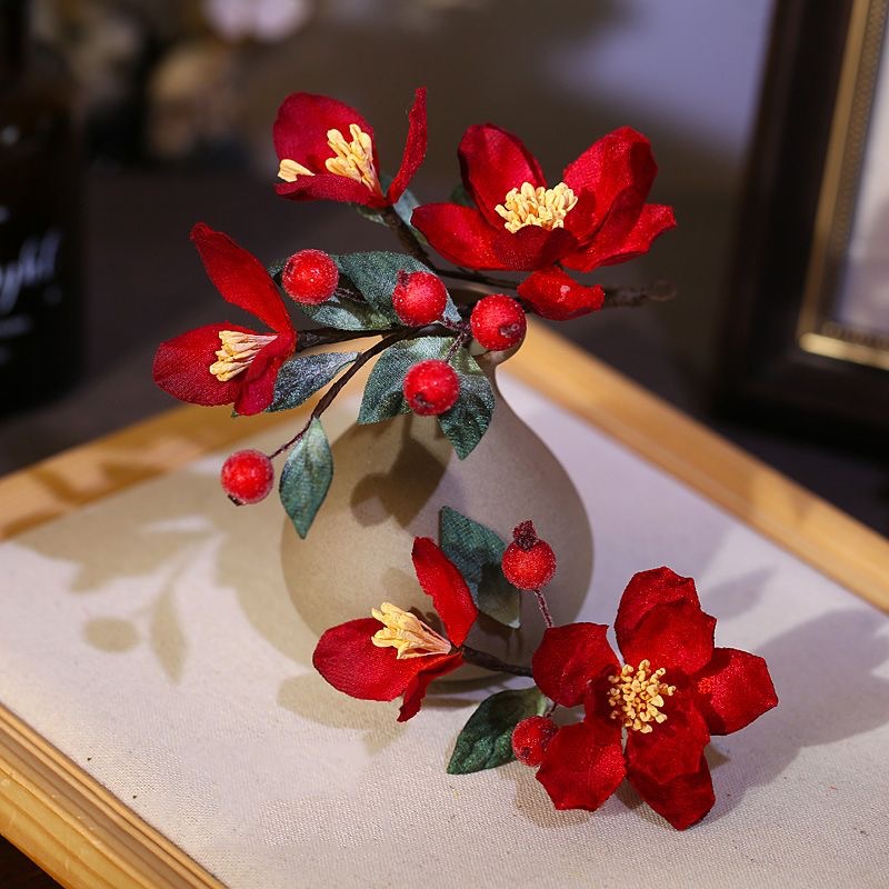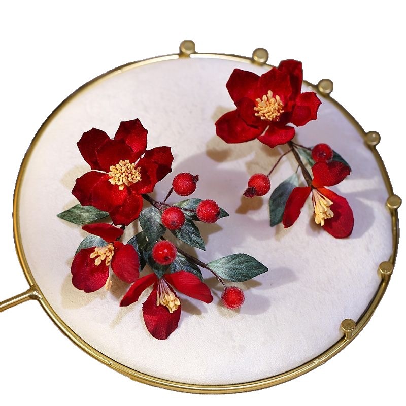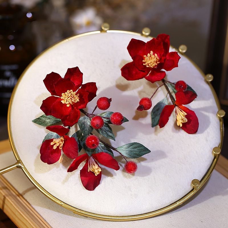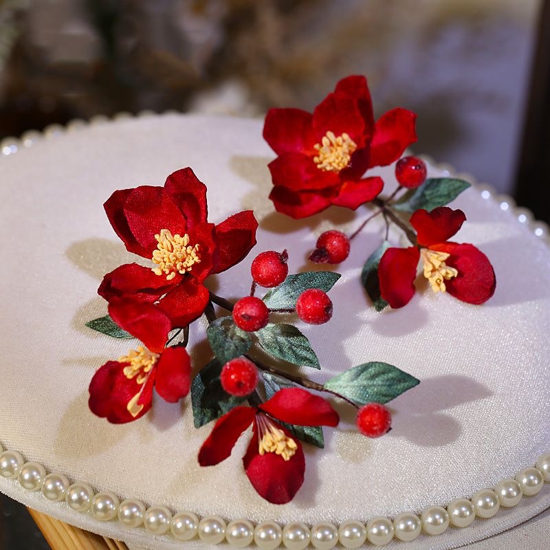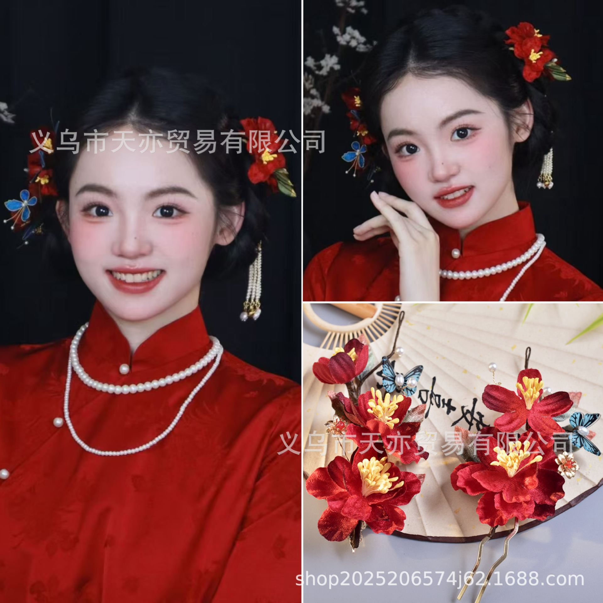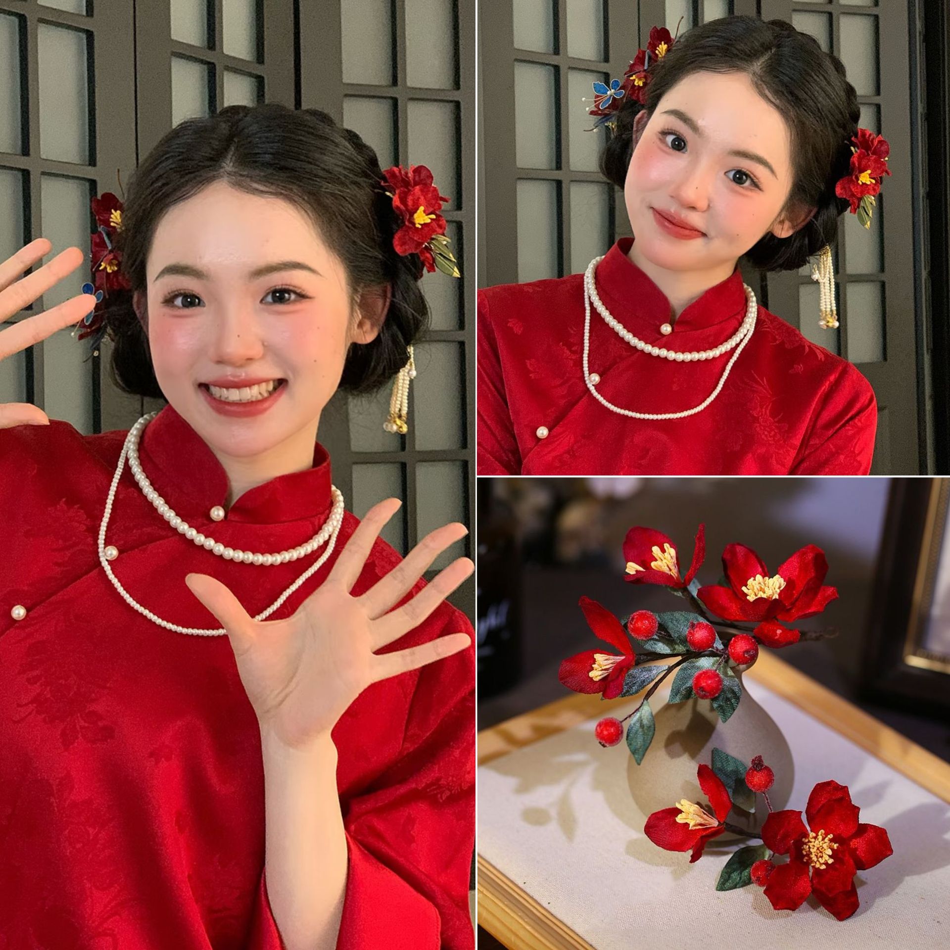 Свадебный головной убор, аксессуары для волос в китайском стиле с красными цветами ручной работы, аксессуары для макияжа и волос Xiuhe, набор аксессуаров для волос Hanfu