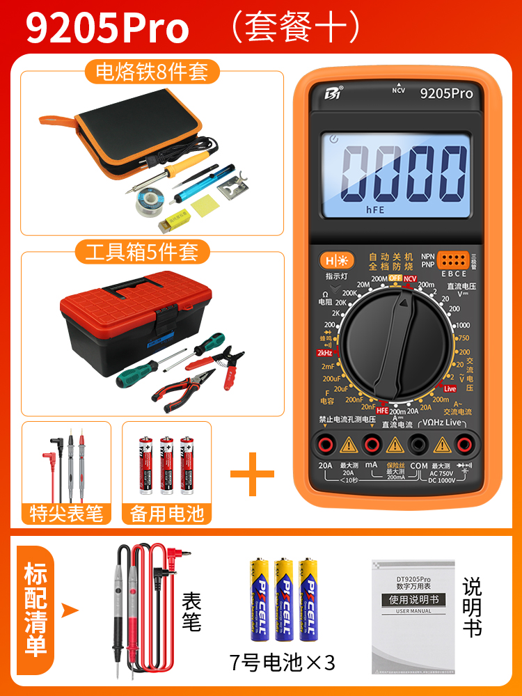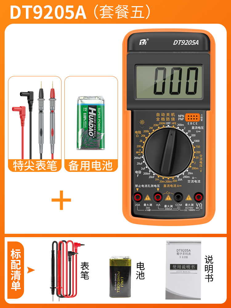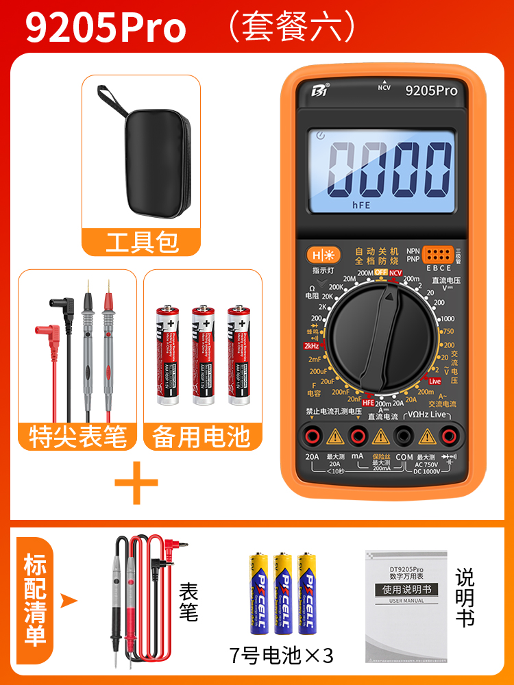 DT9205A поставляется в стандартной комплектации (включая батарею 9 В + измерительные провода + руководство); Стандартный + запасной аккумулятор; Стандарт + тканевый мешок; Стандартная + позолоченная ручка с дополнительным наконечником; Стандартная конфигурация + позолоченная ручка с дополнительным наконечником + тканевый чехол.; Стандартная конфигурация + запасной аккумулятор + позолоченная ручка с дополнительным наконечником; Стандартная конфигурация + специальная ручка + тканевый мешок + запасной аккумулятор; Стандартный внешний термопаяльник мощностью +40 Вт, набор из 5 предметов; Стандартный внешний термопаяльник мощностью +40 Вт, набор из 8 предметов; Стандартный + 12.5inch ящик для инструментов, набор из 5 предметов; 9205A Подарочный пакет для обслуживания электрика (пакет семейного портрета); Модернизированная модель 9205P-S [включает батарею типа АА + измерительные провода + руководство]; Модернизированная модель + запасной аккумулятор; Модернизированная модель + тканевая сумка.; Модернизированная модель + позолоченная ручка с дополнительным наконечником.; Модернизированная модель + позолоченная ручка с дополнительным наконечником + тканевый чехол; Модернизированная модель + запасной аккумулятор + позолоченная ручка с дополнительным наконечником; Модернизированная модель + специальная ручка + тканевый чехол + запасной аккумулятор; Модернизированная модель + внешний термоэлектрический паяльник мощностью 40 Вт, набор из 5 предметов.; Модернизированная модель + внешний термоэлектрический паяльник мощностью 40 Вт, набор из 8 предметов.; Модернизированная модель + 12.5inch ящик для инструментов, набор из 5 предметов; Обновленный подарочный пакет для обслуживания электрика (пакет семейного портрета); Новый 9205Pro в стандартной комплектации поставляется с [NCV+проводом под напряжением+частотой+конденсатором 2000 мкФ+предохранителем с самовосстановлением]; Новая модель + запасной аккумулятор.; Новый стиль + тканевая сумка; Новый стиль + позолоченная ручка с дополнительным наконечником; Новый стиль + позолоченная ручка с дополнительным наконечником + тканевый мешок; Новая модель + запасной аккумулятор + позолоченная ручка с дополнительным наконечником.; Новая модель + специальная ручка + тканевый чехол + запасной аккумулятор; Новый внешний термоэлектрический паяльник мощностью +40 Вт, набор из 5 предметов; Новый внешний термоэлектрический паяльник мощностью +40 Вт, набор из 8 предметов; Новый + 12.5inch ящик для инструментов, набор из 5 предметов; Новый подарочный пакет для ремонта электрооборудования (пакет «Семейный портрет»)