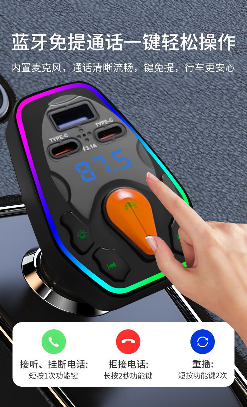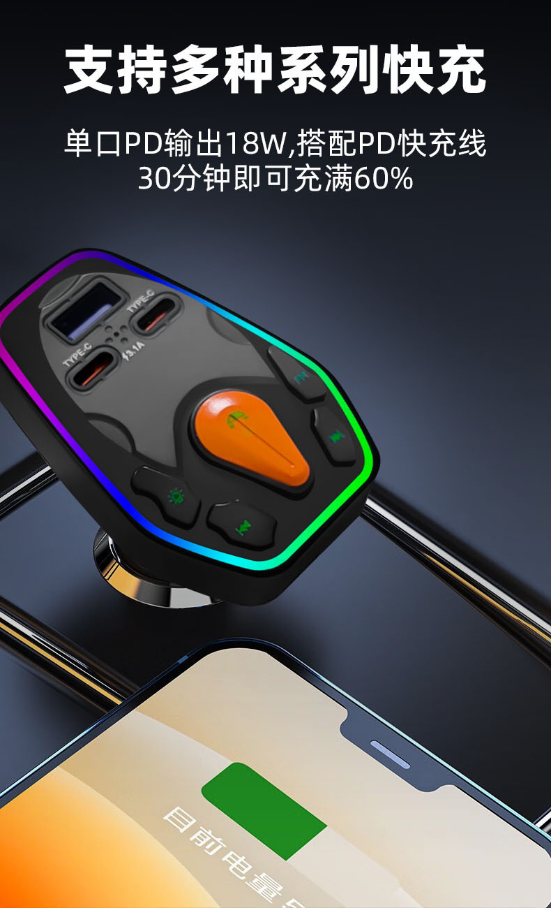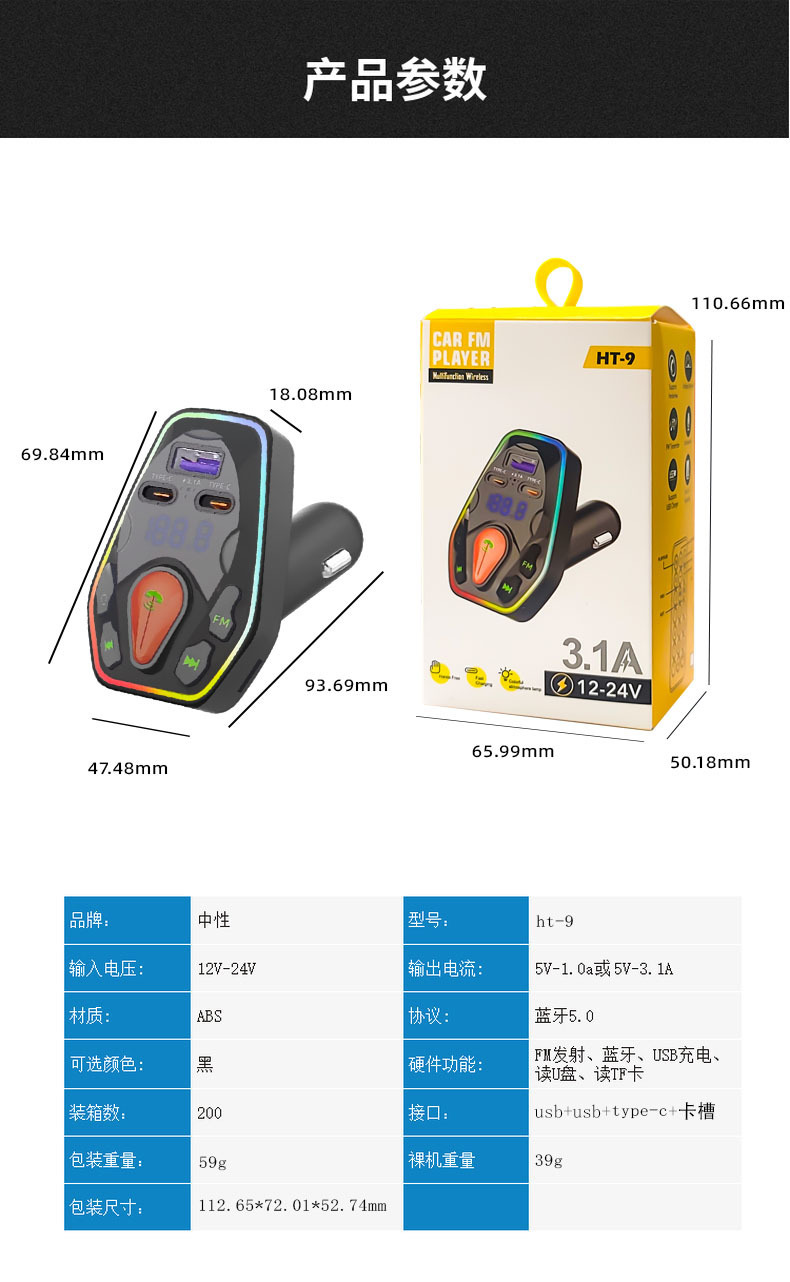 Трансграничное автомобильное зарядное устройство HT-9 с Bluetooth, быстрая зарядка, автомобильный прикуриватель, один для двух, с красочной атмосферой, быстрая зарядка PD