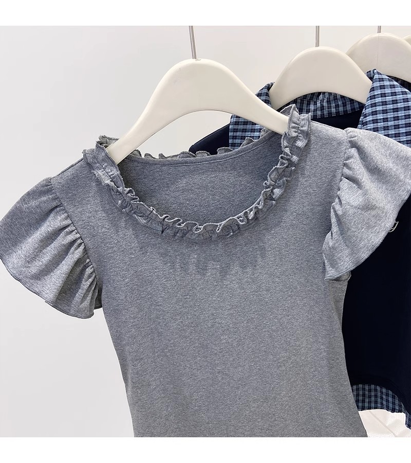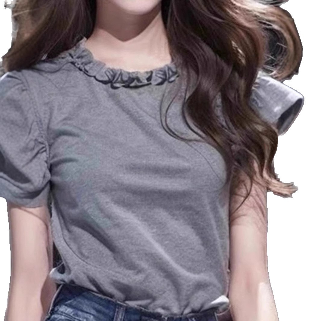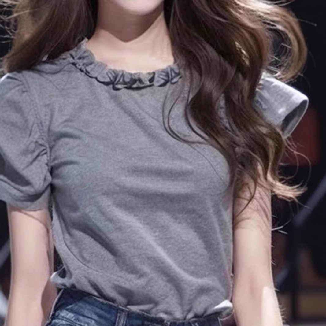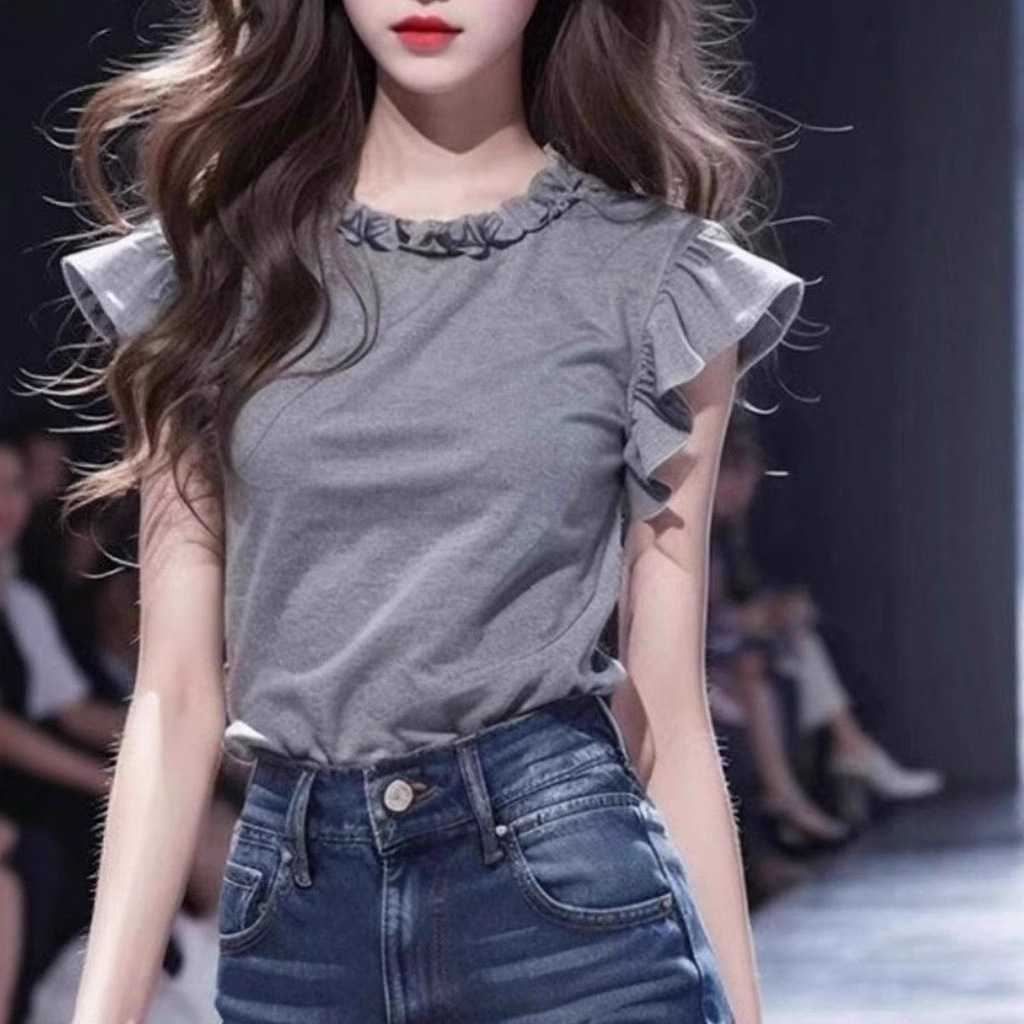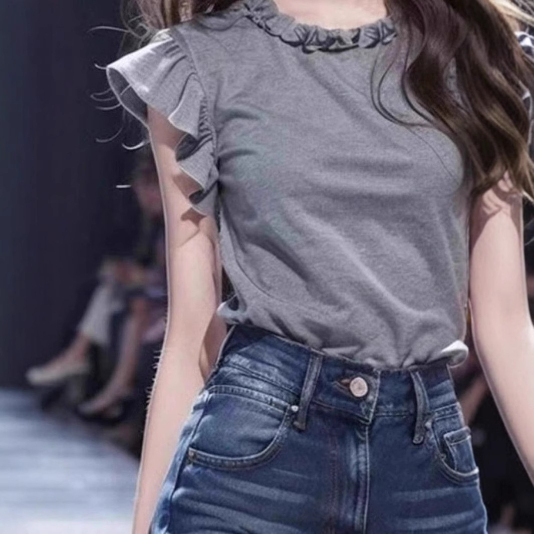 французский стиль, уникальный и красивый элегантный, круглый вырез, маленькие летящие рукава, футболка, топы с короткими рукавами, женский летний новый дизайн