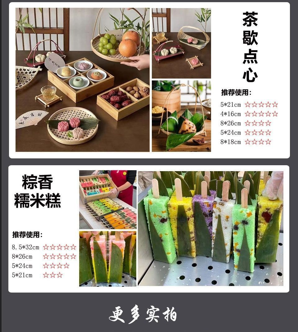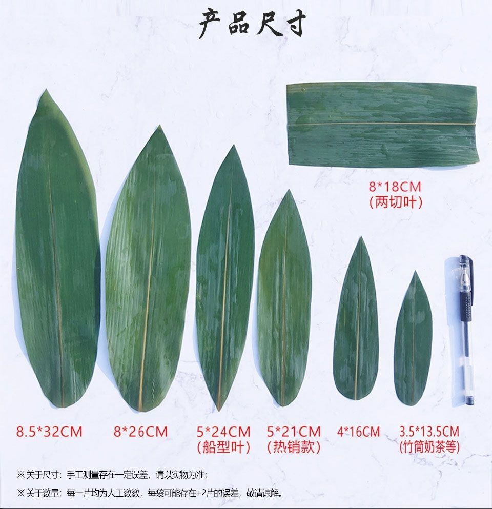 Мини-размер 3,5*13,5 см, свежая вакуумная упаковка.; Маленький размер 4*16 см, свежая вакуумная упаковка.; Свежая вакуумная упаковка среднего размера 5*21 см.; Большой размер 8*26 см, свежая вакуумная упаковка.; Очень большой размер 8*32 см, свежеупакованный в вакууме.; Двухсрезные листья бамбука 8*18 см, свежие, в вакуумной упаковке.; Бамбуковые листья в форме лодочки 5*24 см, свежие, в вакуумной упаковке.; Три листа 3-5*15 см, свежие, в вакуумной упаковке.