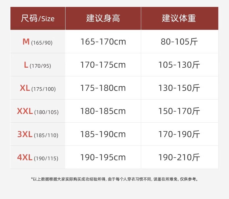 М/165【Вес 40-52.5kg 】; L/170【Вес 52.5-65kg 】; XL/175【Вес 65-75kg】; XXL/180【Вес 75-85kg 】; XXXL/185【Вес 85-95kg 】; XXXXL /190【Вес 95-105kg 】