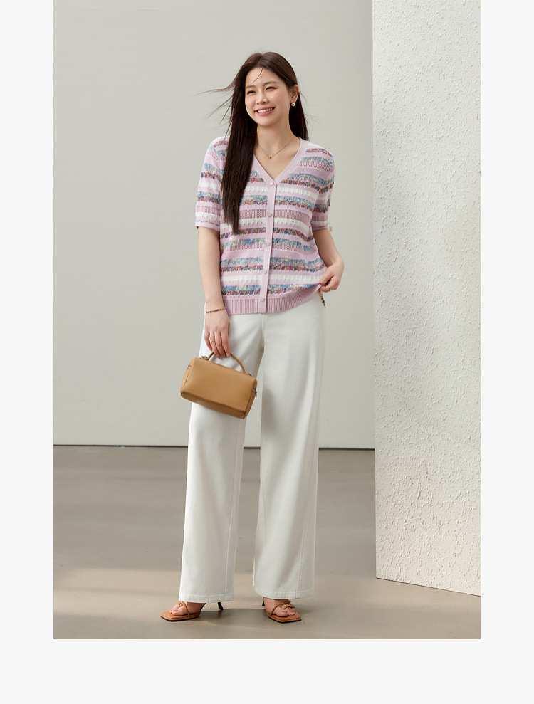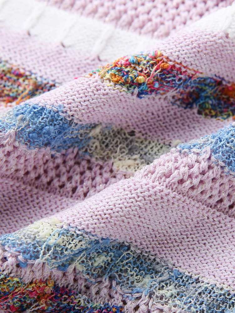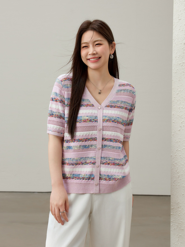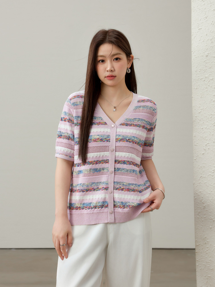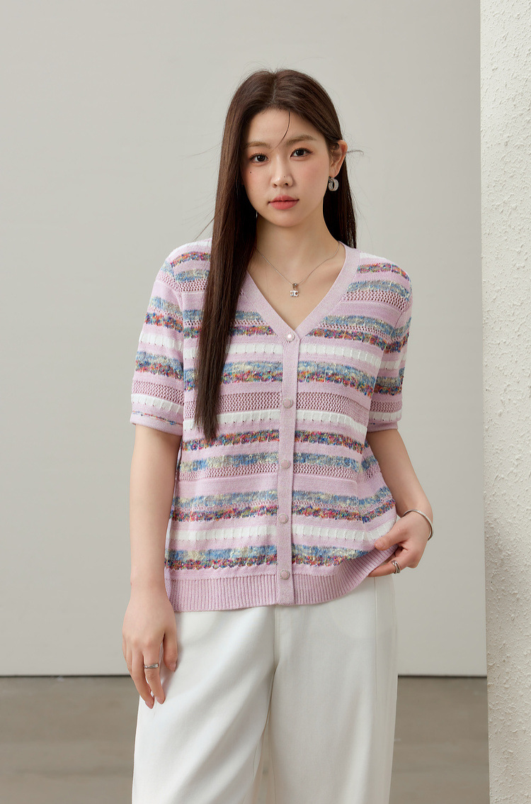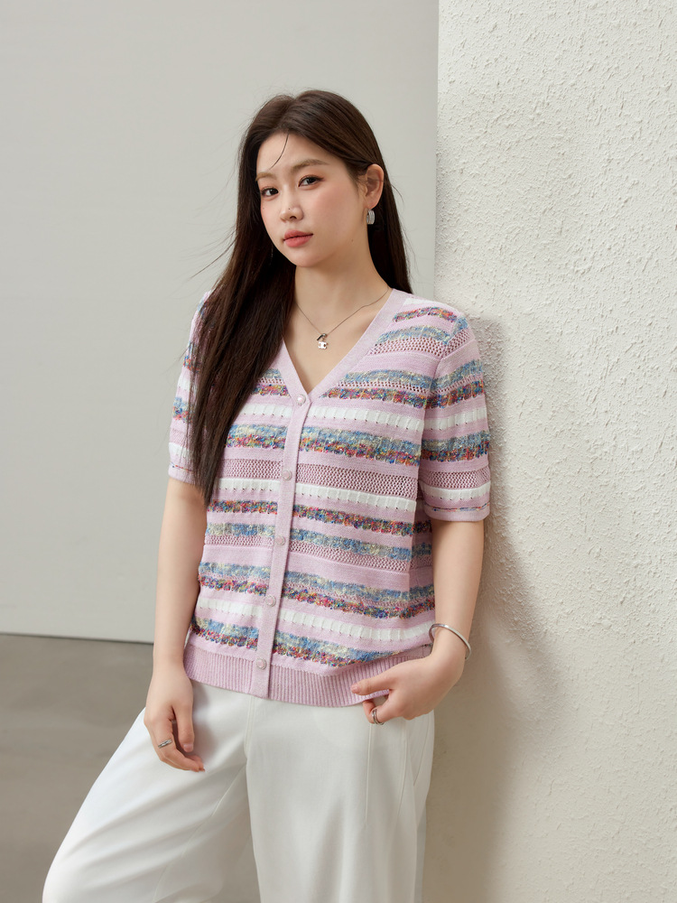 [Yunhai Morning Mist] Ленивый стиль, радужный элегантный трикотаж с v-образным вырезом, тонкий и эффектный женский размер больших размеров, летний новый стиль