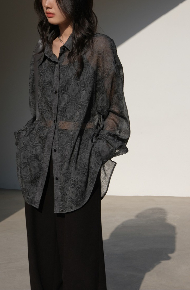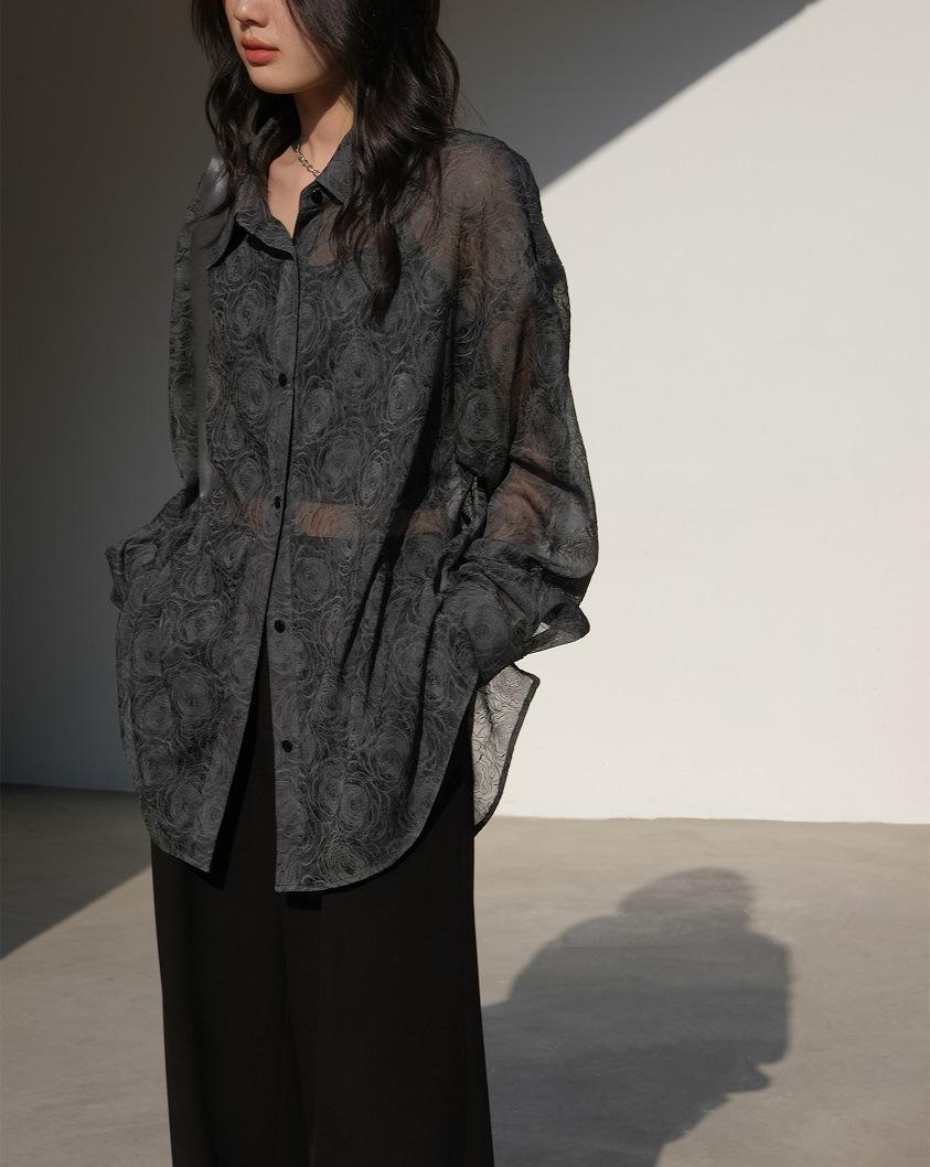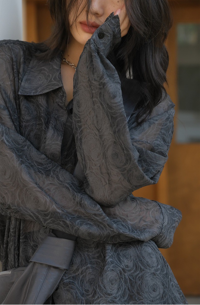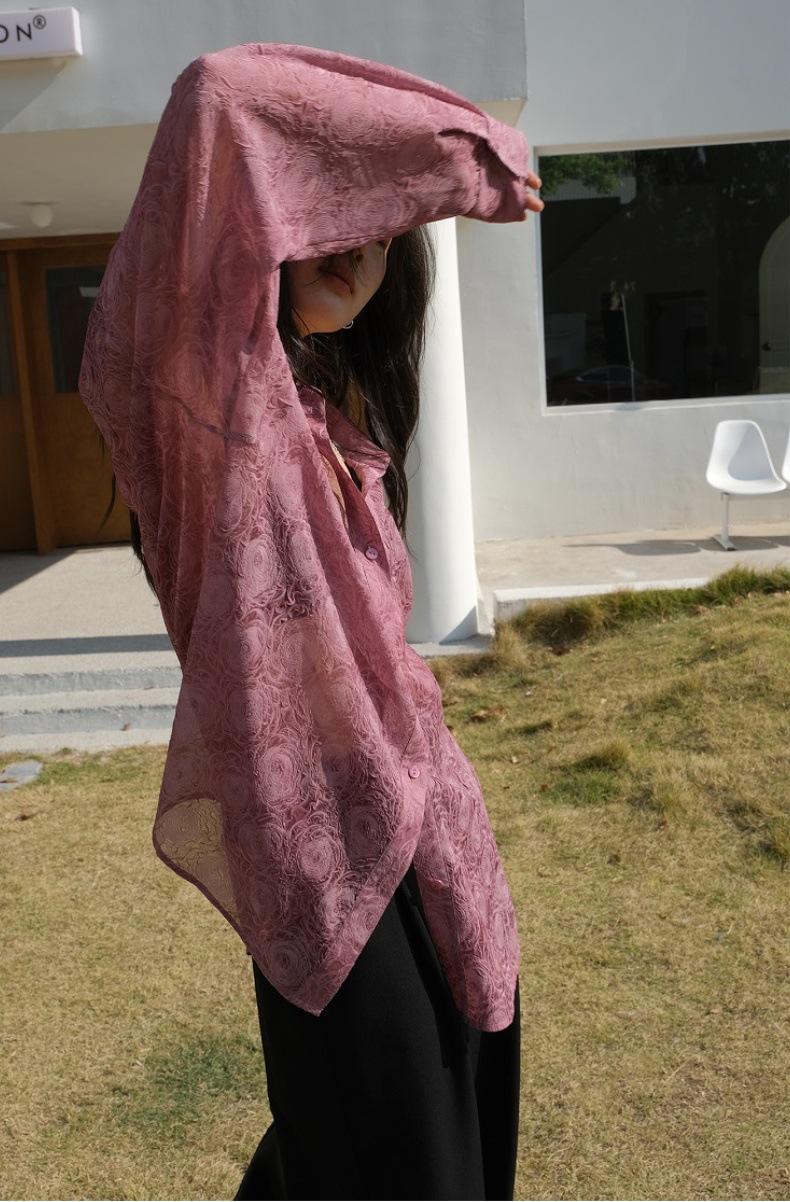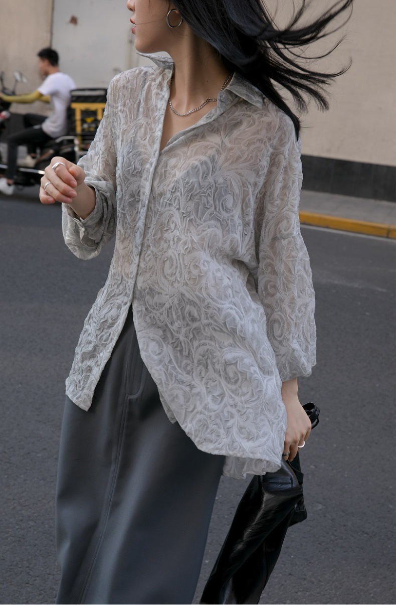 Премиум чувство тиснения дизайн солнцезащитный крем рубашка женская микро-прозрачная летняя шикарная рубашка ленивый солнцезащитный топ с длинными рукавами