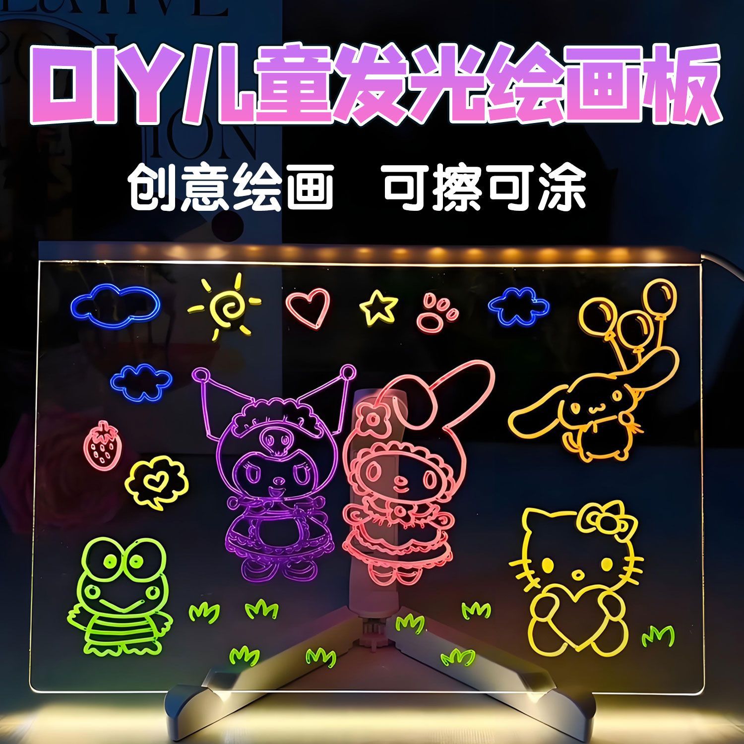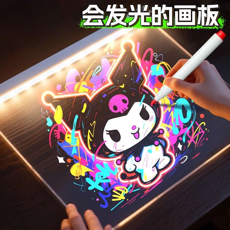 Большая светящаяся доска для рисования размером 30x20 см [с 7 кистями + 2 чистящими салфетками + подставкой]; Случайная книга отслеживания Sanrio.; 3 специальные ручки для светящихся досок для рисования.; 1 специальная ручка для светящейся доски для рисования