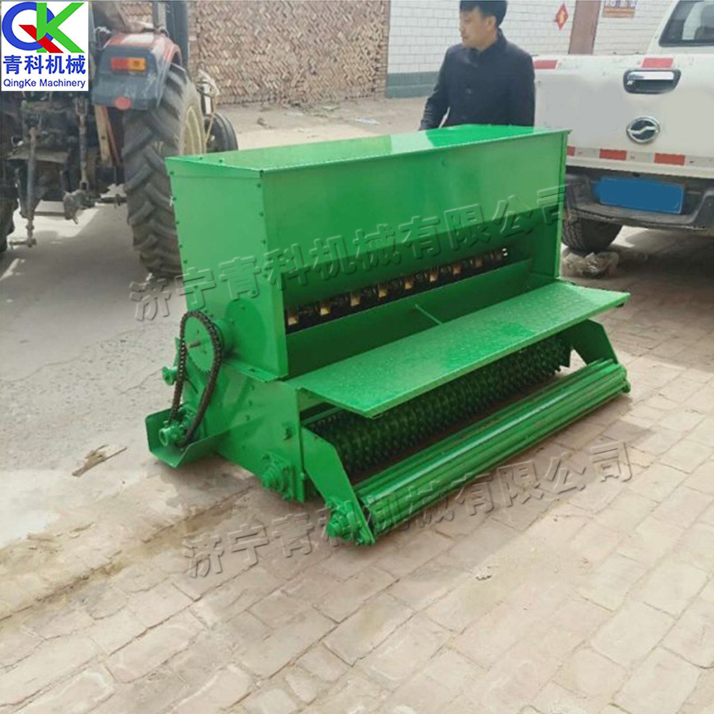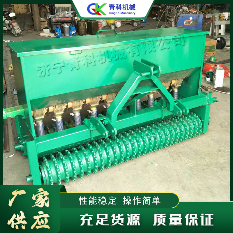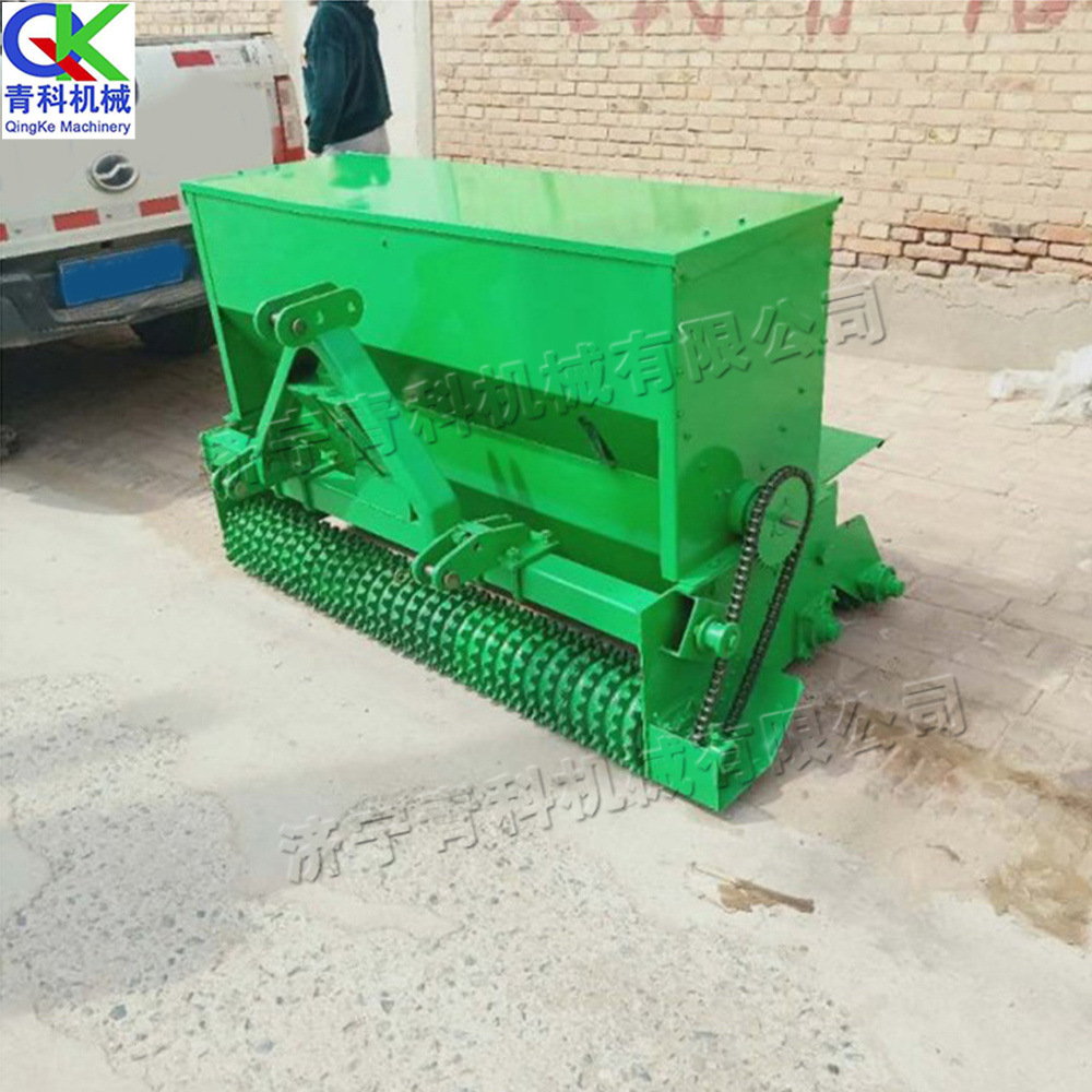 草坪播种机与28马力拖拉机拖带作业,适用于各种地况的种子播种机,前镇/压轮齿压碎土块、压低小石块、压实苗床、起到开沟器的作用,种箱的种子通过播种器落下,先落到一个球面上,均匀的撒播在苗床上,后镇/压轮齿与前镇/压轮齿错位,将前镇/压轮齿压出的小垄分开,将种子周围的土压实,播种深度在0.6-2.5厘米之间,能够获得发芽率和出苗,结构简单,前镇/压轮驱动,不易损坏操作方便。