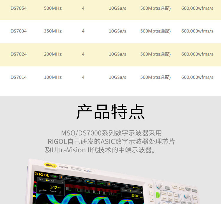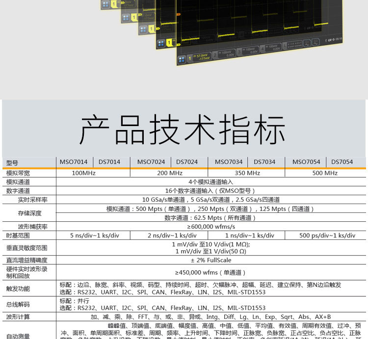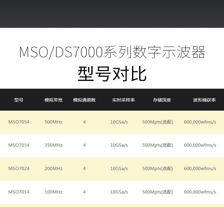MSO7054 (500 МГц, 4 канала) + источник сигнала; MSO7034 (350 МГц, 4 канала) + источник сигнала; MSO7024 (200 МГц, 4 канала) + источник сигнала; MSO7014 (100 МГц, 4 канала) + источник сигнала; DS7054 (4 канала 500 МГц); DS7034 (350 МГц, 4 канала); DS7024 (200 МГц, 4 канала); DS7014 (100 МГц, 4 канала); RP1018H (датчик высокого напряжения 18кВ150МГц); RP6150A (пассивный датчик с низким сопротивлением 1,5 ГГц); RP7080S (несимметричный активный пробник 800 МГц); RP1000P (4-канальный источник питания датчика тока); RPL2316 (16-канальный активный логический анализатор); RP1001C (300 кГц, 100 А); RP1002C (1 МГц, 70 А); RP1003C (50 МГц, 30 А); RP1004C (100 МГц, 30 А); RP1005C (10 МГц, 150 А); RP1006C (2 МГц, 500 А)