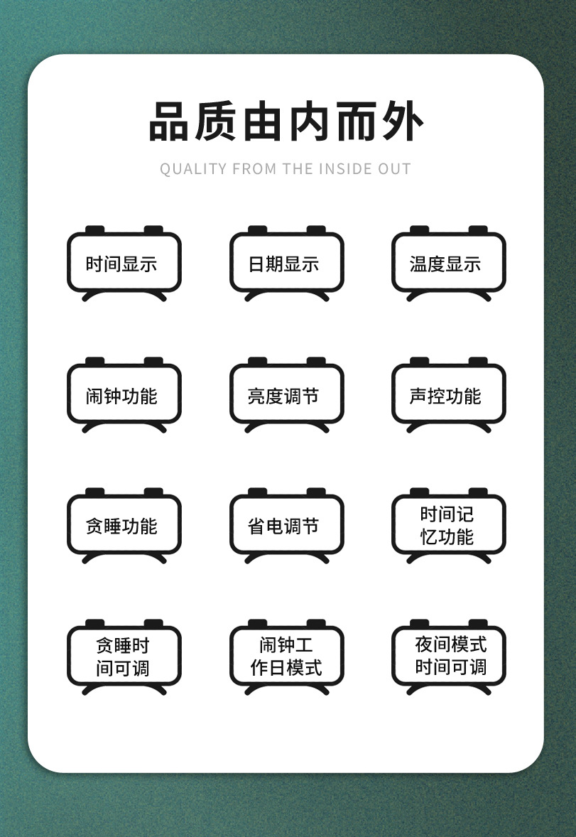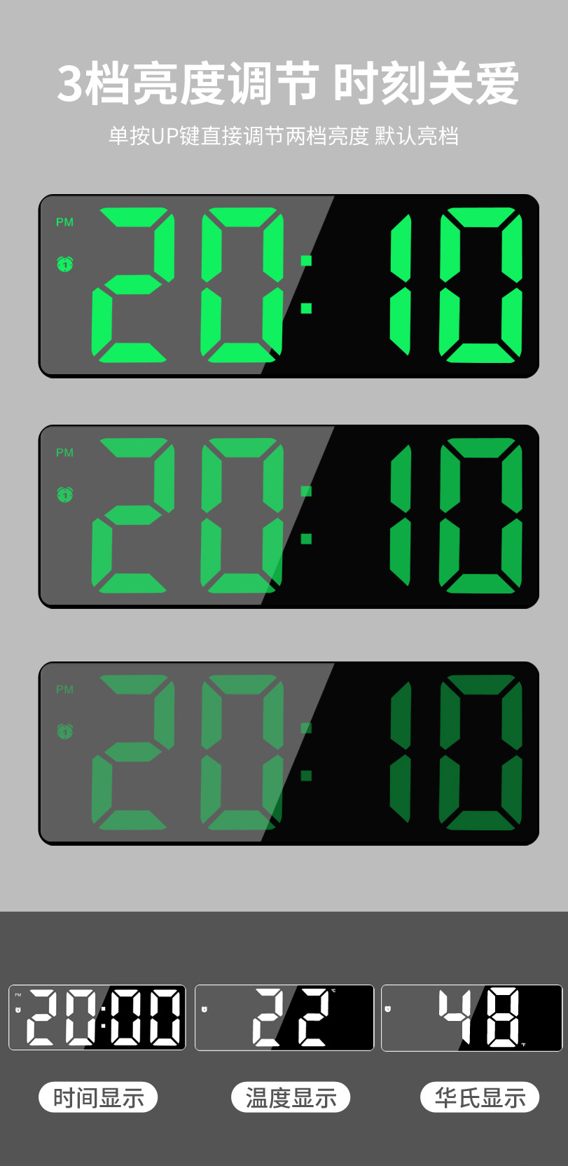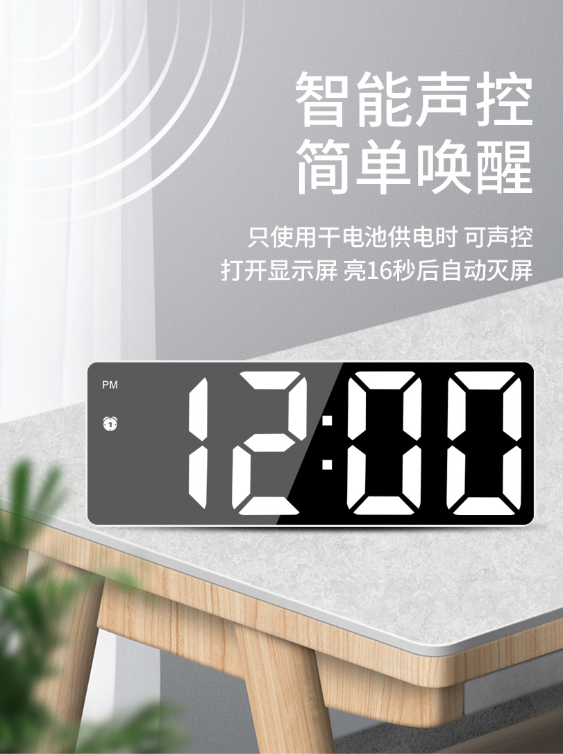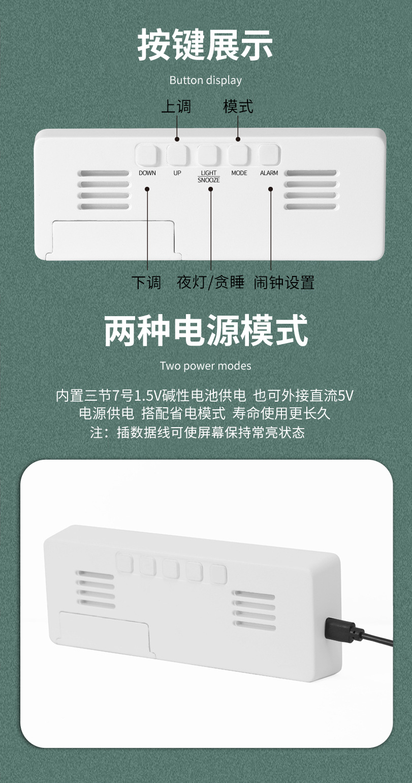 电池【客户自配】供电会自动节能息屏,声控屏幕,建议三节碳性七号电池,产品仅用电池供电时为声控节能模式,轻拍桌面或按任意按键可唤醒屏幕显示,15秒左右自动息屏
