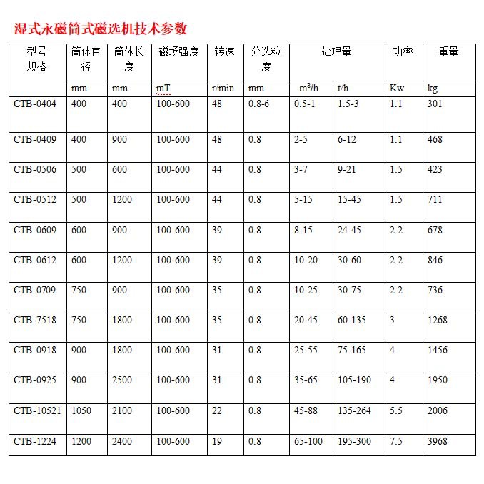 在湿式磁选作业中,若要求获得纯净的磁性矿物,通常选用顺流型磁选机(适用小于6毫米);若要求最大限度地回收磁选矿物,则选用逆流型磁选机(适用小于0.8毫米);当药兼顾磁性矿物的品位和回收率时,以选用半逆流磁选机(适用小于1毫米),磁场强度由100高斯到6800高斯之间。