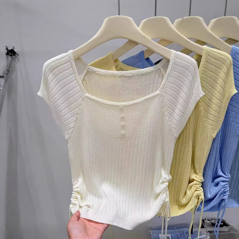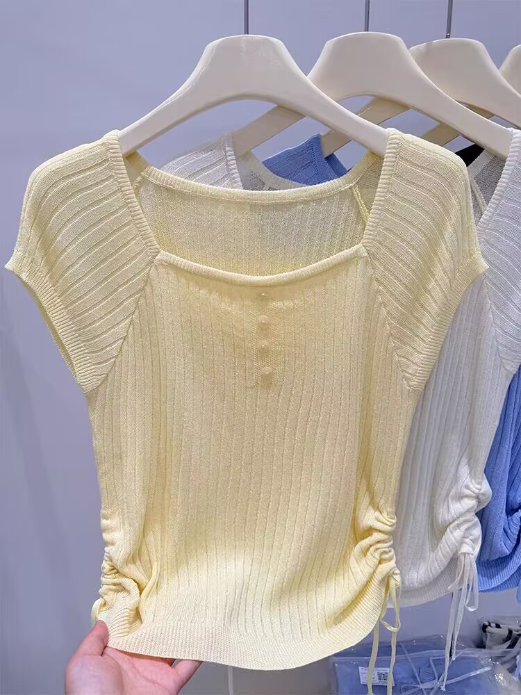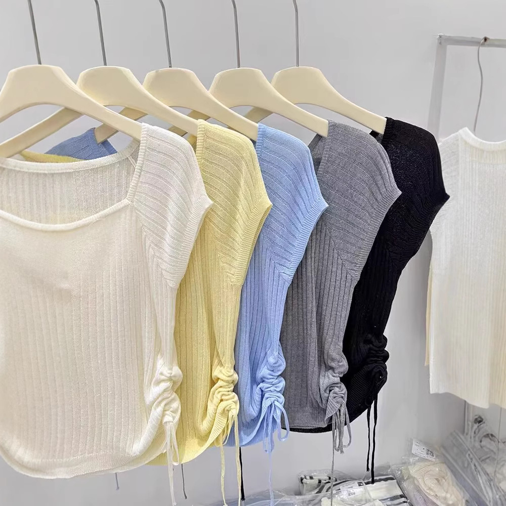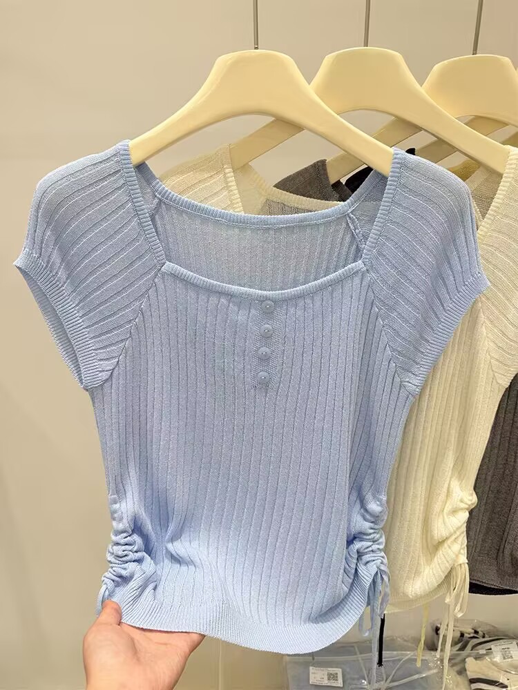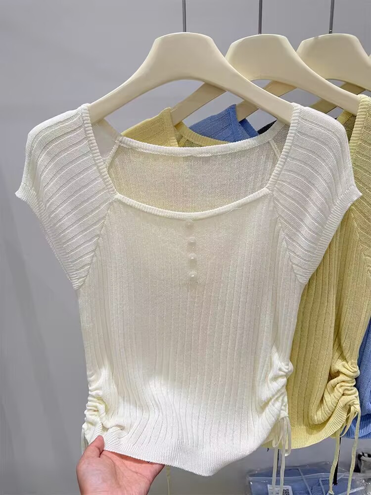 2025 новая летняя мода универсальная футболка с квадратным вырезом и завязками на талии, утягивающая короткий рукав, вязаная майка для женщин, высококачественные топы