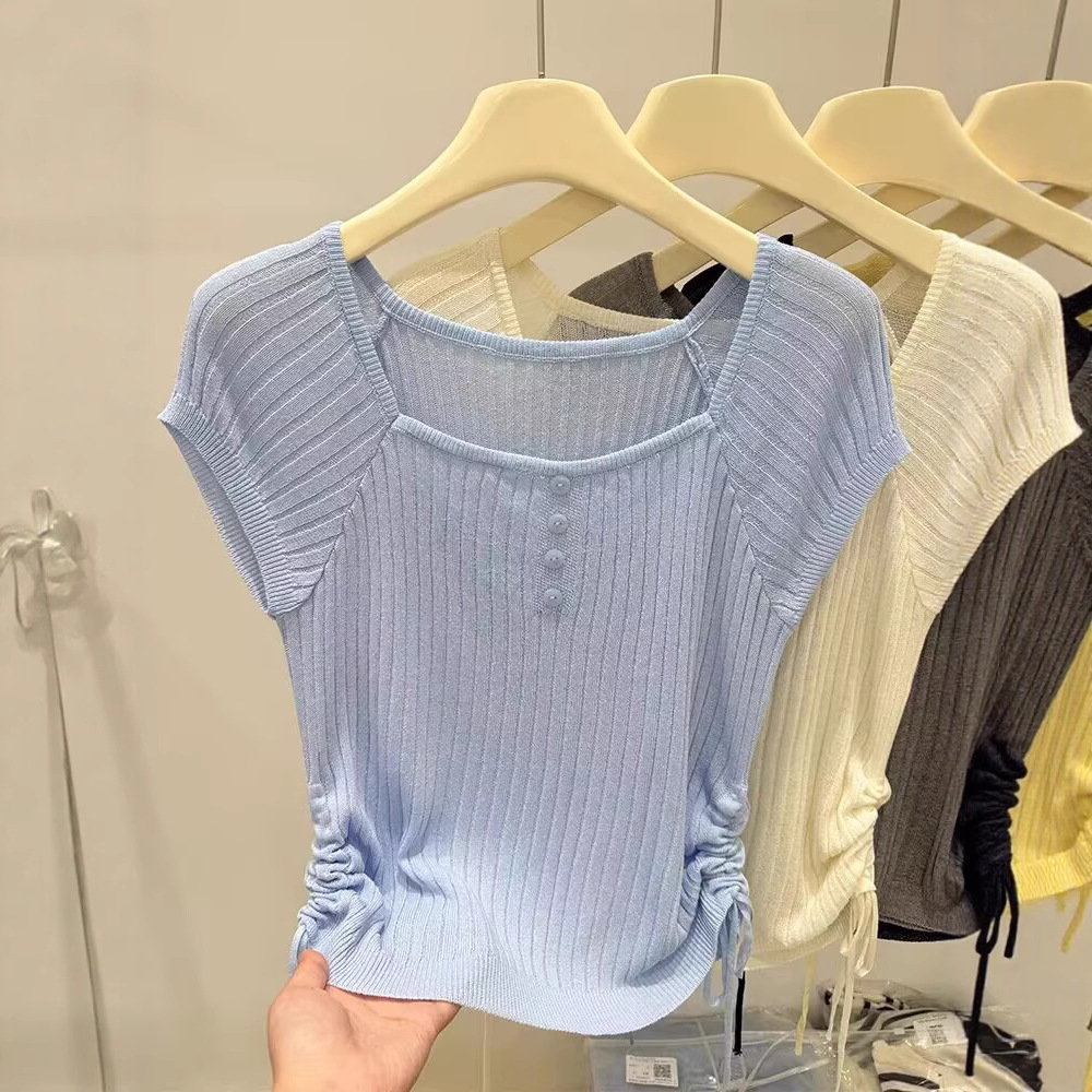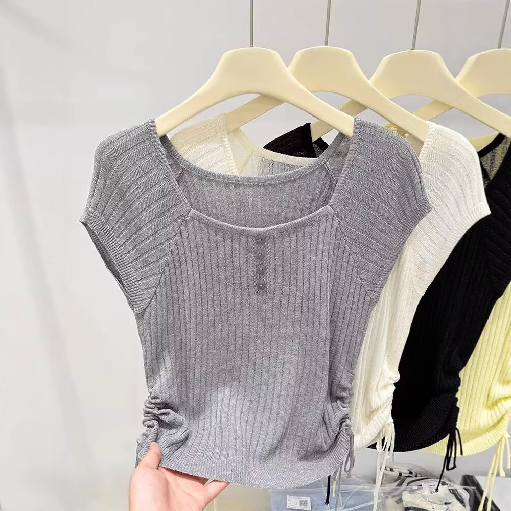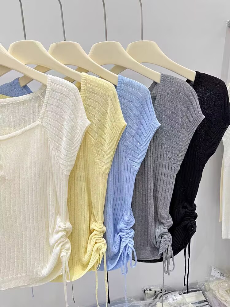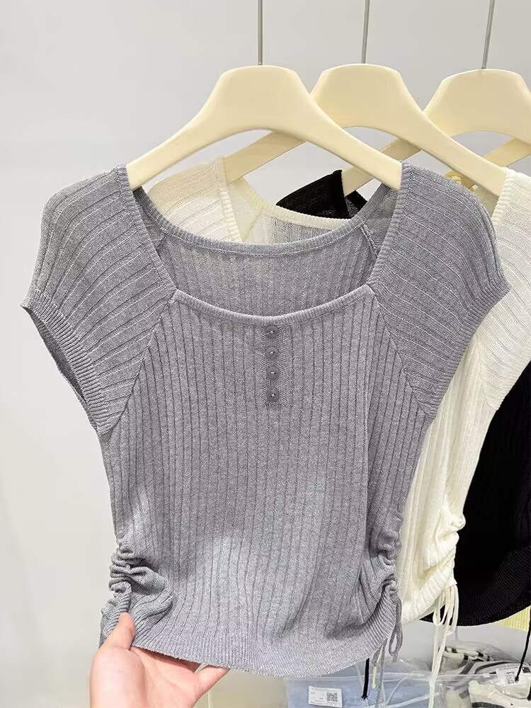 2025 новая летняя мода универсальная футболка с квадратным вырезом и завязками на талии, утягивающая короткий рукав, вязаная майка для женщин, высококачественные топы