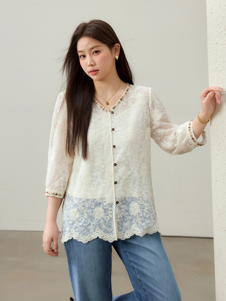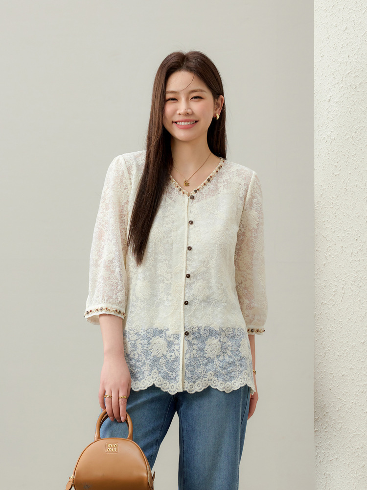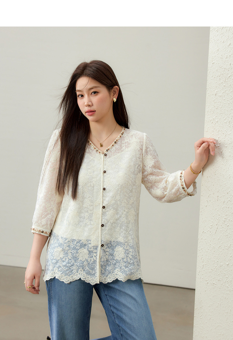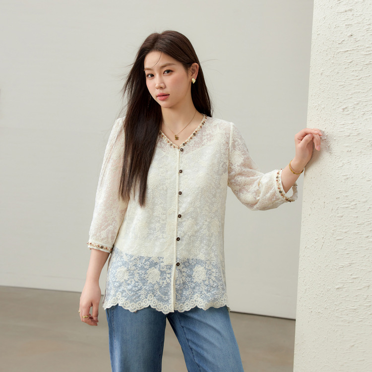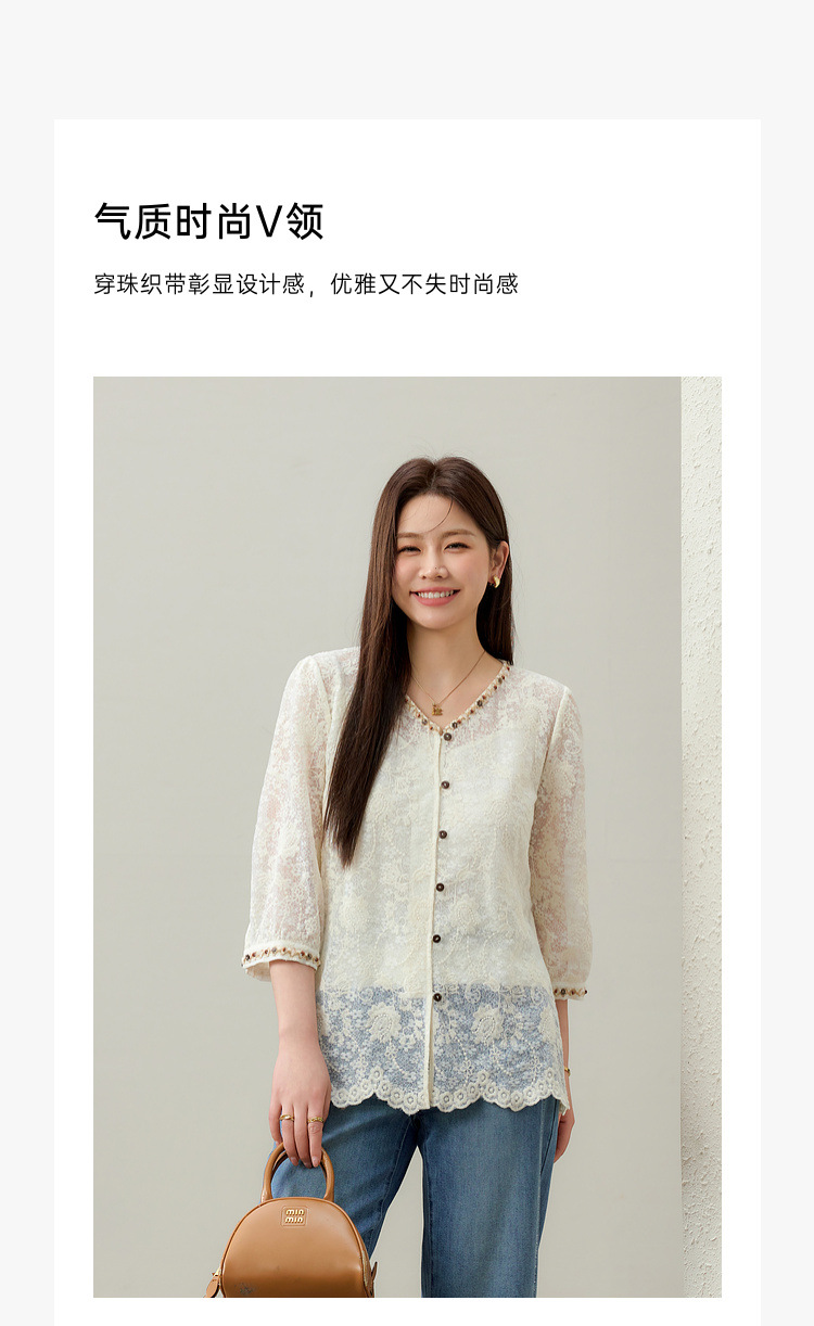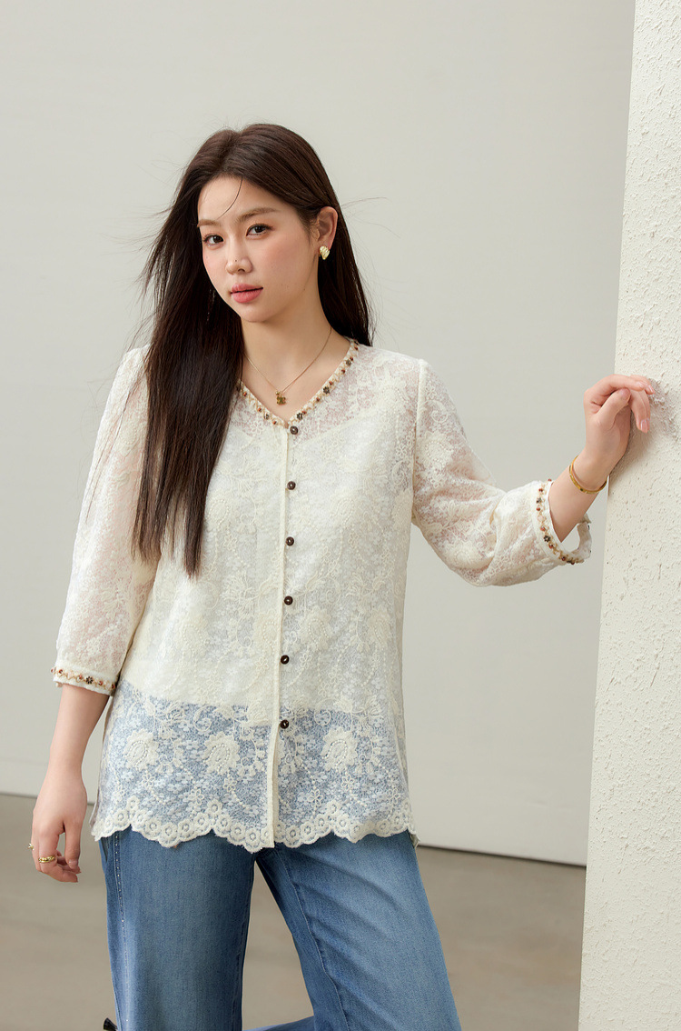 [Элегантная рубашка с v-образным вырезом и кружевной тесьмой в литературном стиле] Тонкая и красивая женская одежда больших размеров, толстая мм 2025, летний новый стиль
