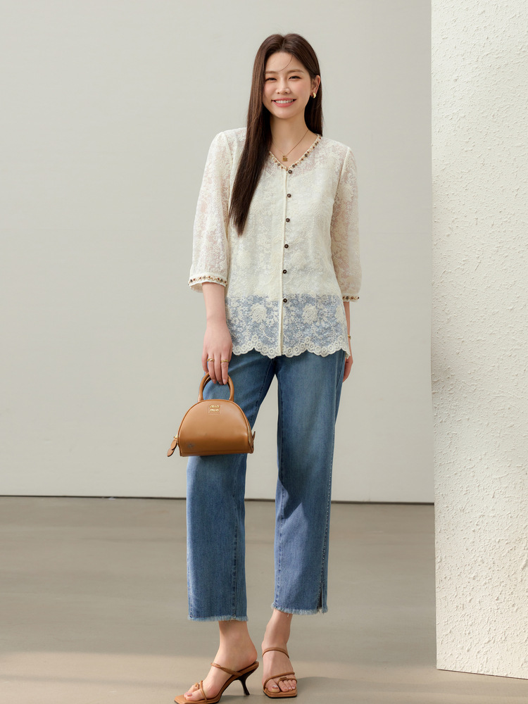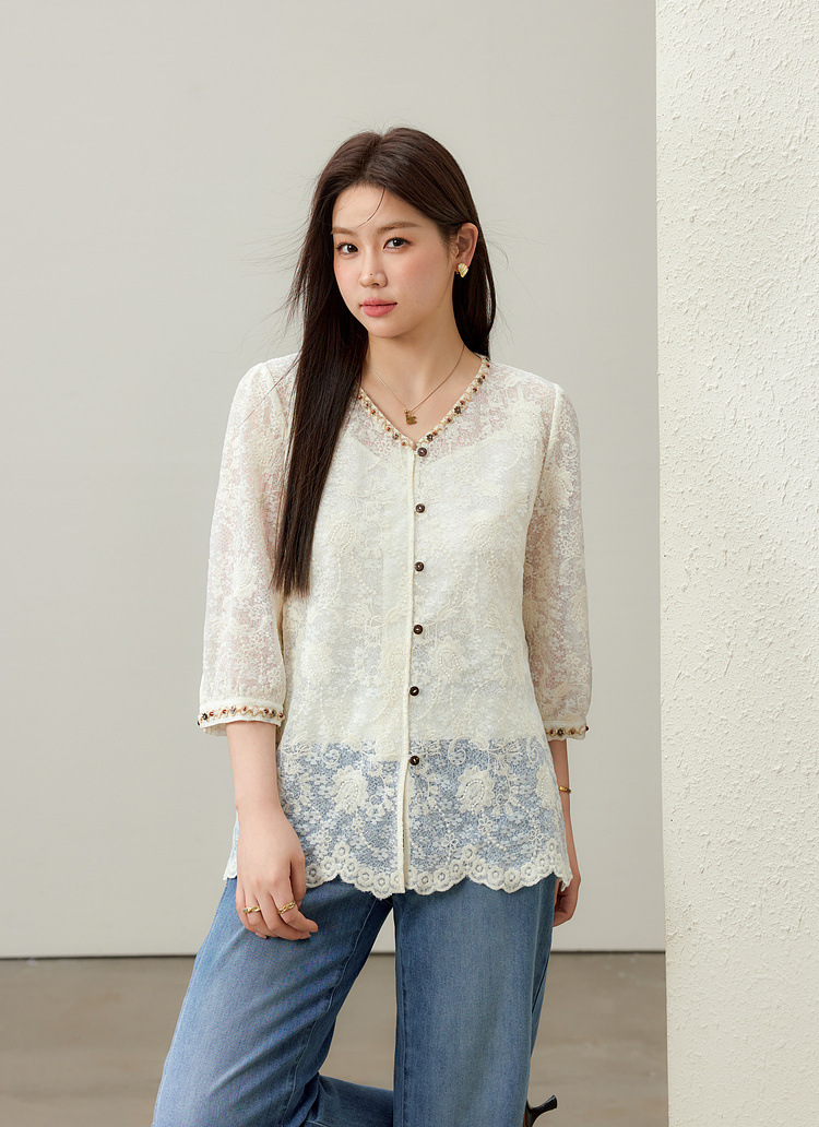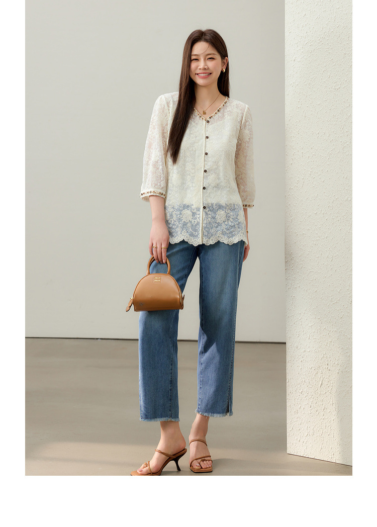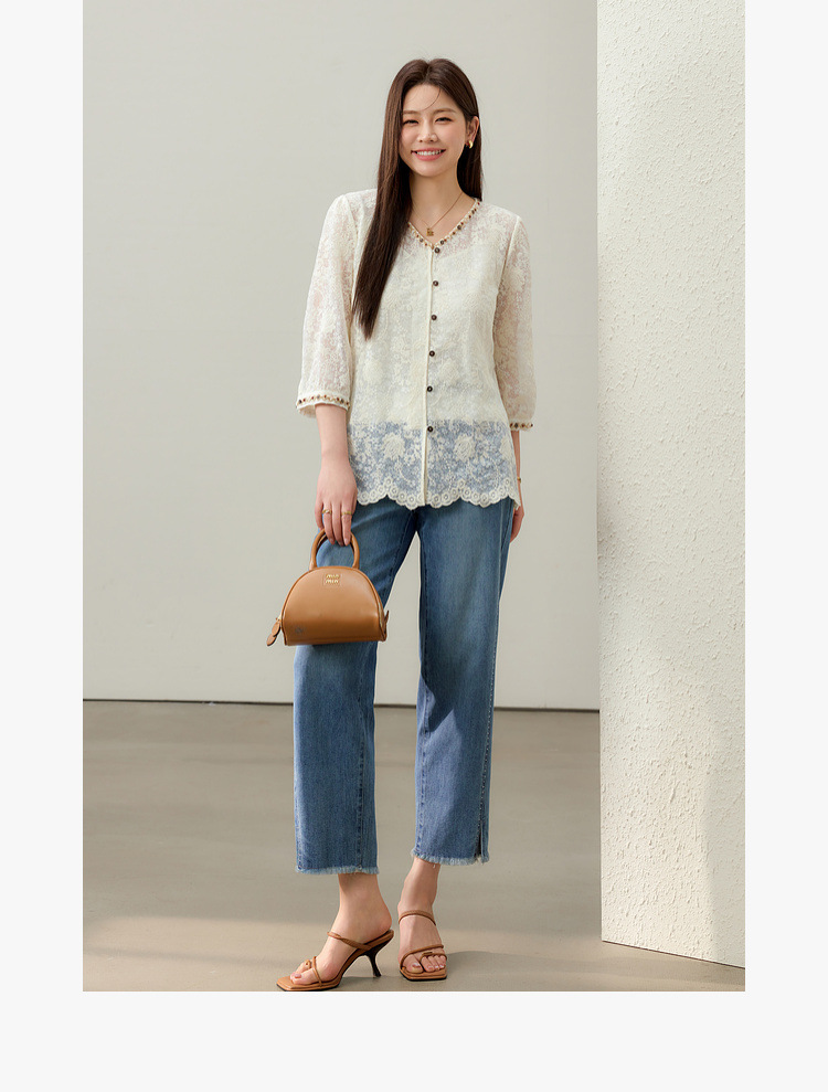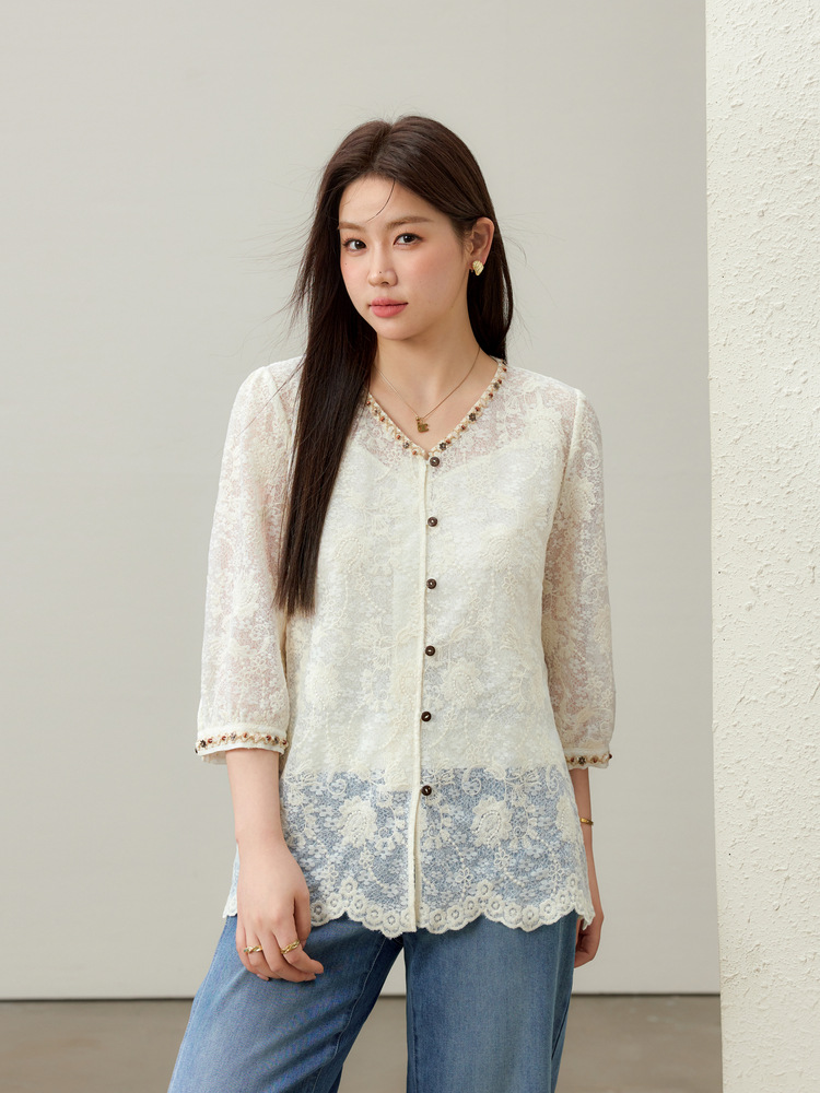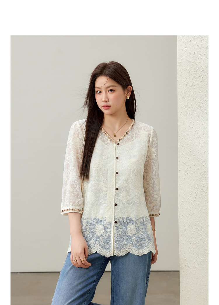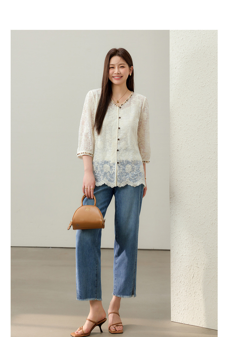 [Элегантная рубашка с v-образным вырезом и кружевной тесьмой в литературном стиле] Тонкая и красивая женская одежда больших размеров, толстая мм 2025, летний новый стиль