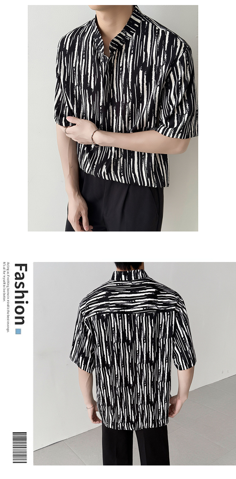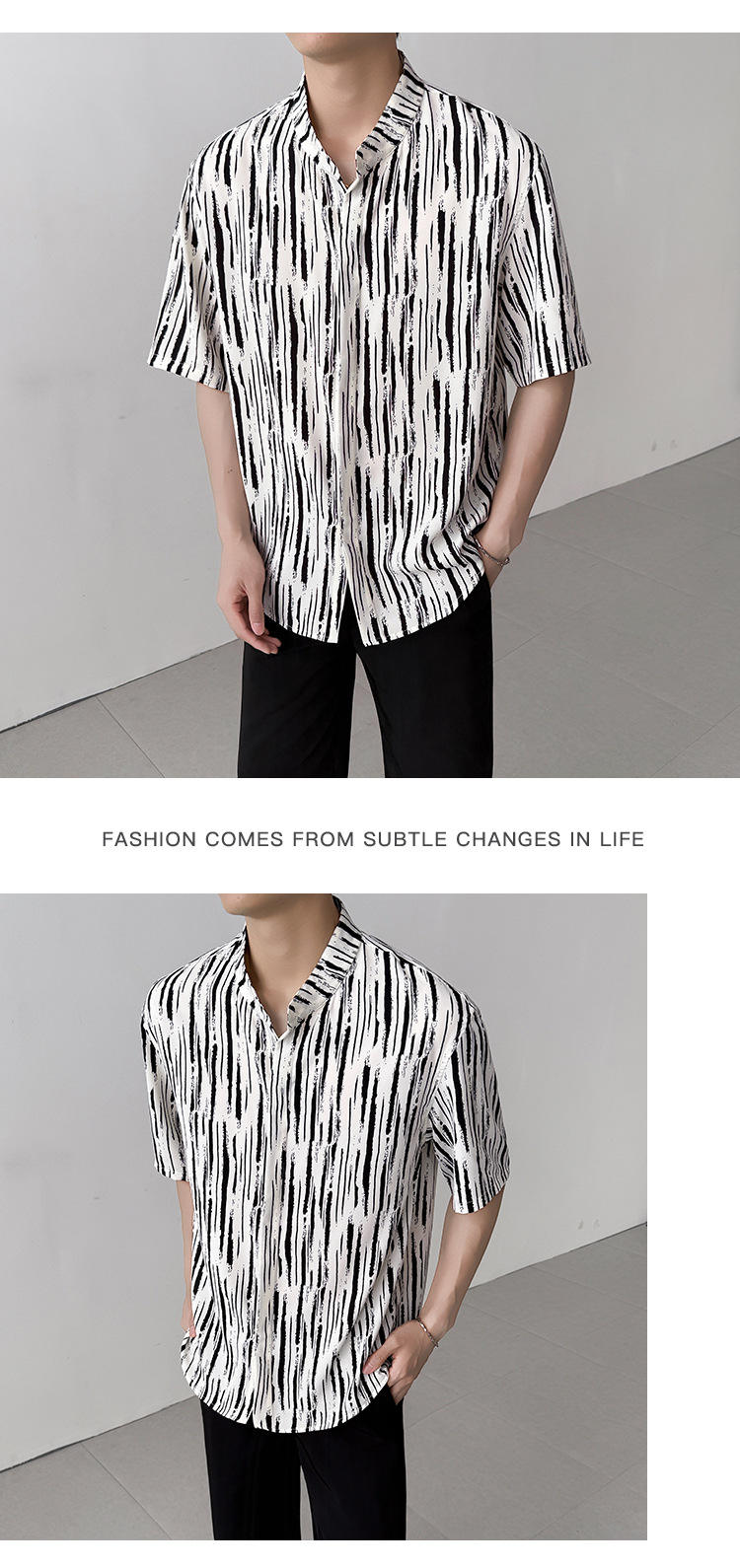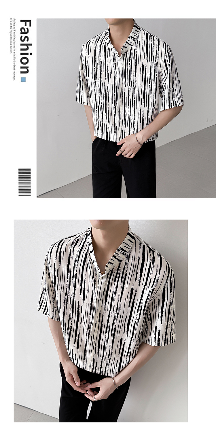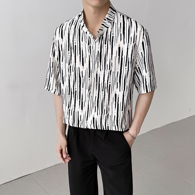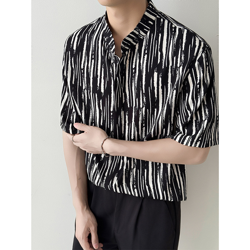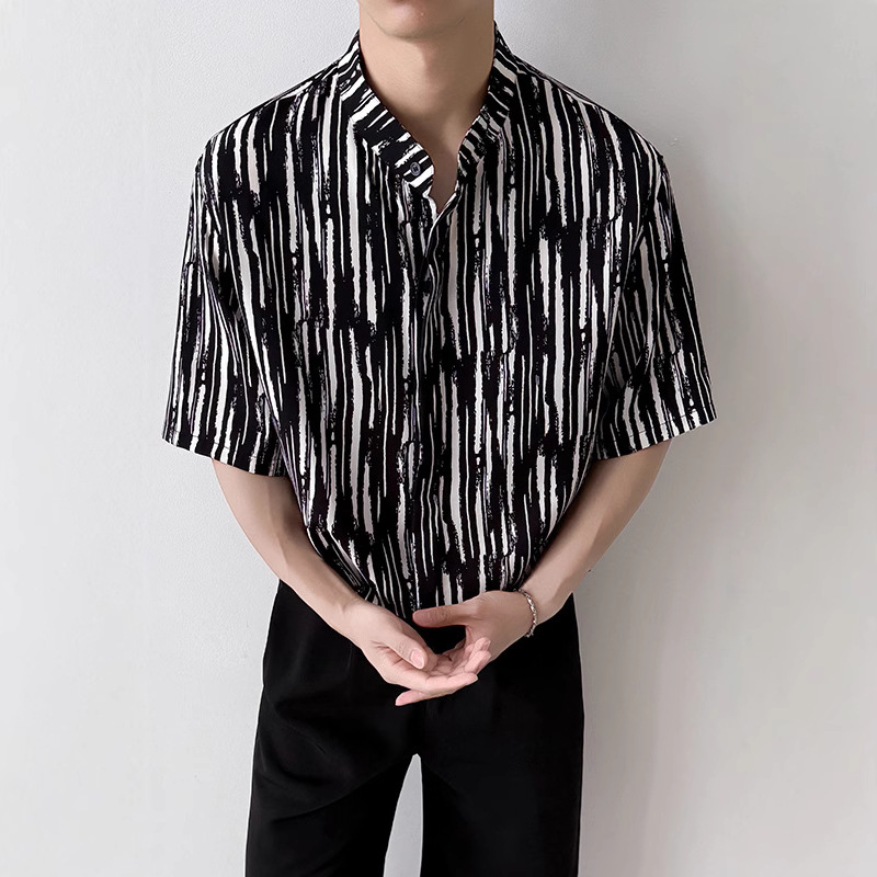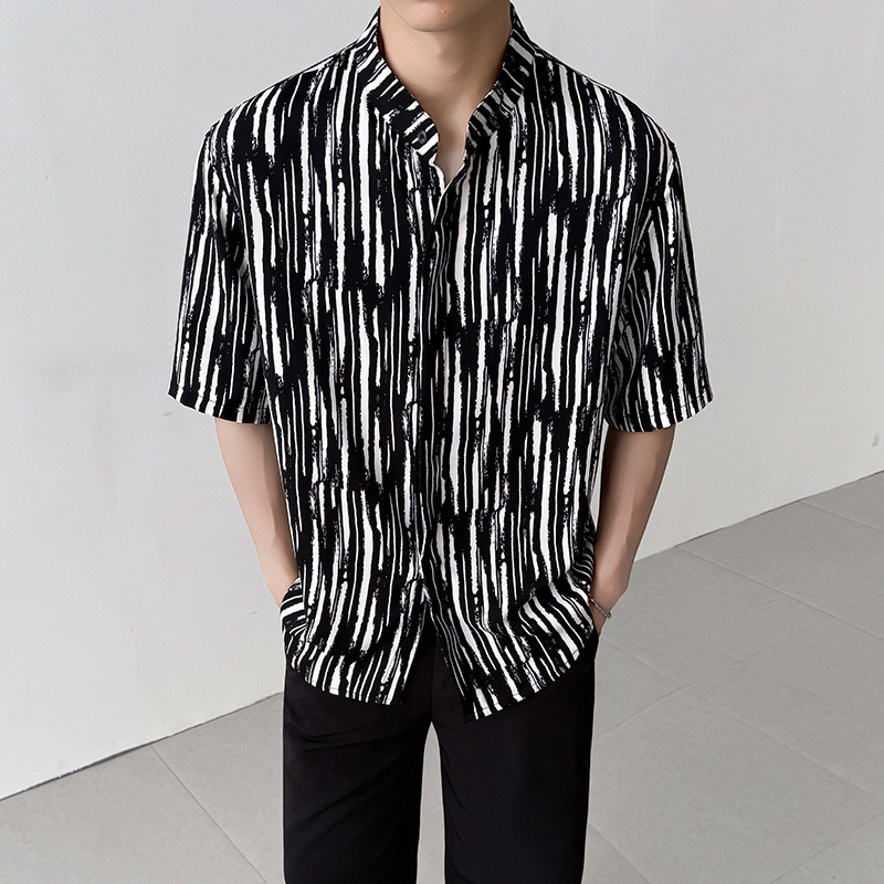 Летняя рубашка в корейском стиле в легком зрелом стиле с воротником-стойкой из ледяного шелка, темная рубашка со средним рукавом, черно-белая красивая драпированная свободная рубашка с принтом тай-дай