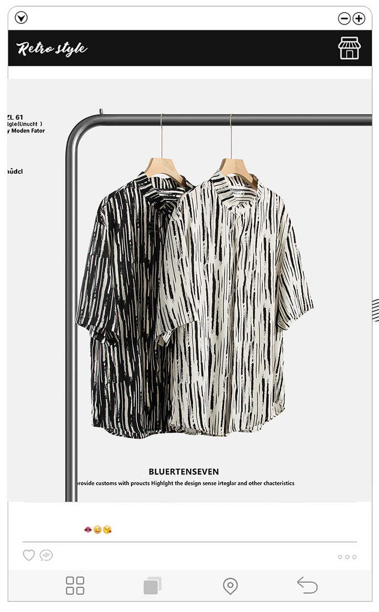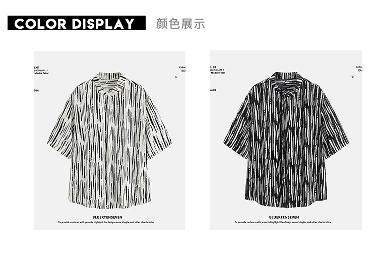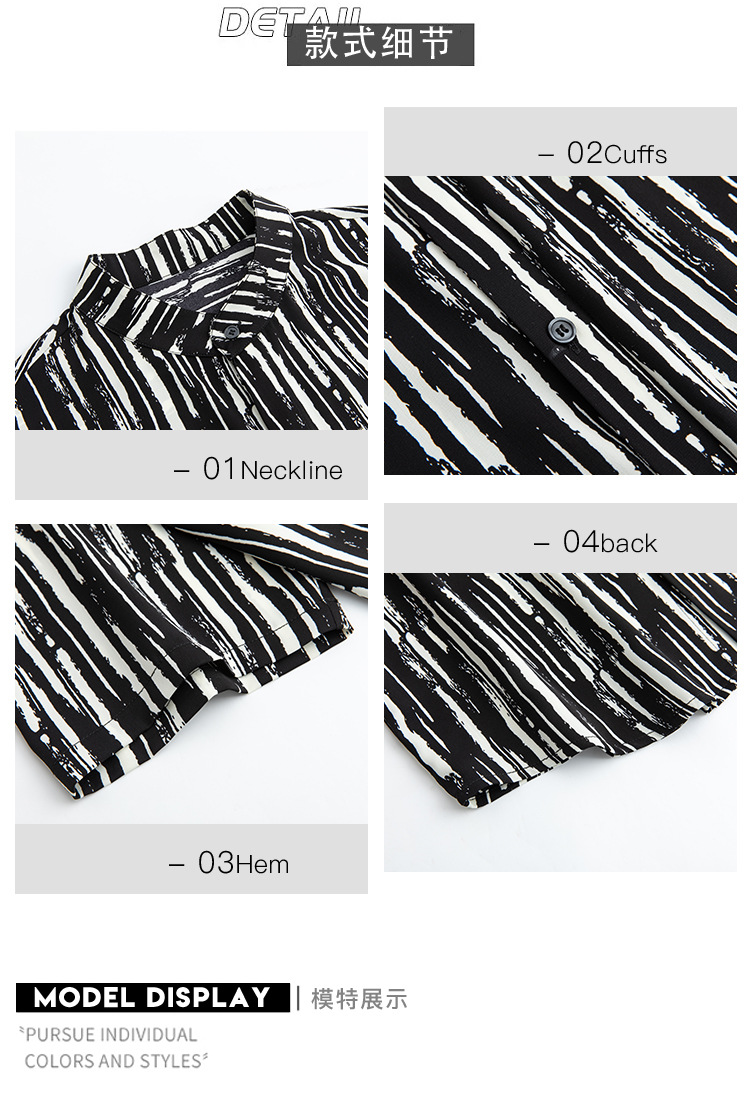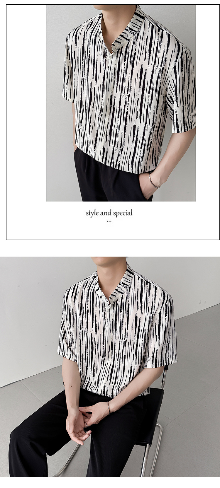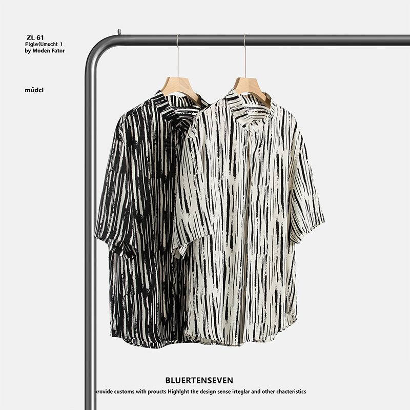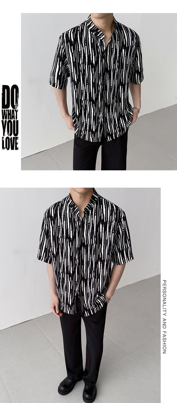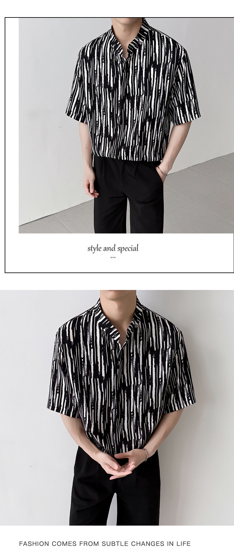 Летняя рубашка в корейском стиле в легком зрелом стиле с воротником-стойкой из ледяного шелка, темная рубашка со средним рукавом, черно-белая красивая драпированная свободная рубашка с принтом тай-дай