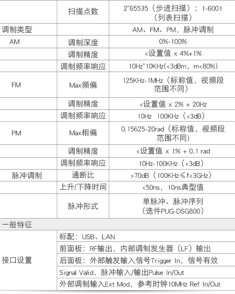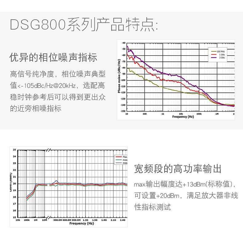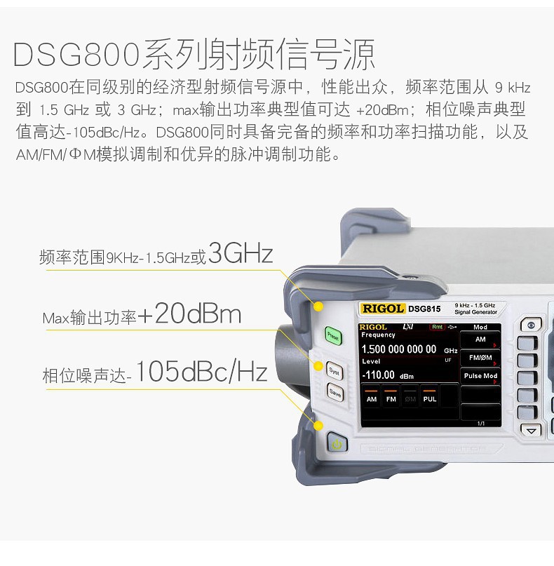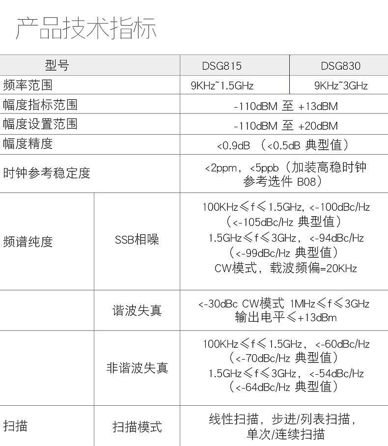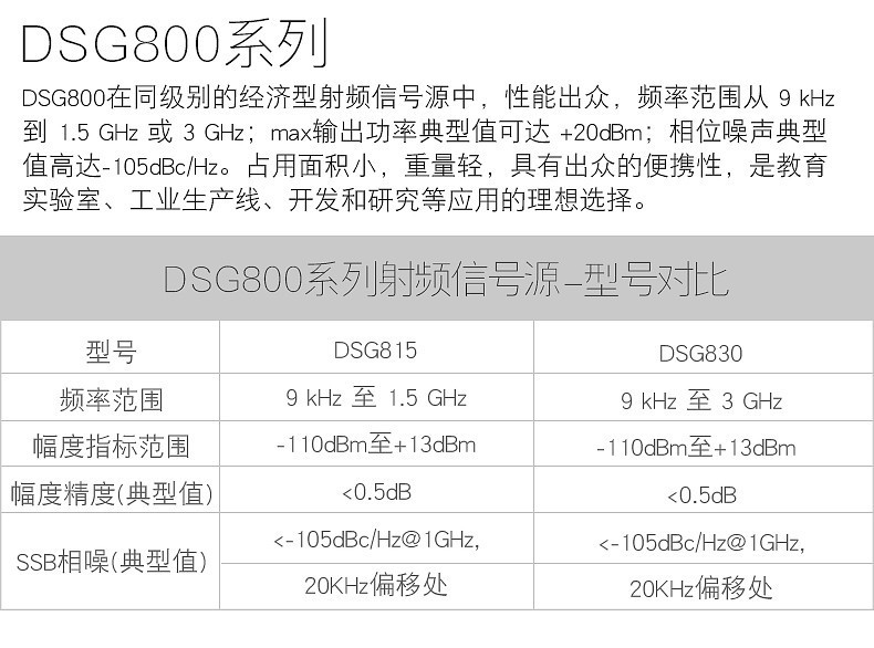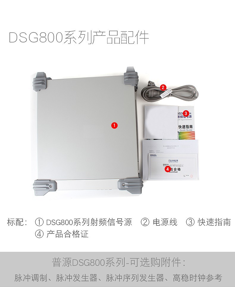 DSG815(kHz~1.5GHz); DSG821(9kHz~2.1GHz); DSG821A(9kHz~2.1GHz); DSG830(9kHz~3GHz); DSG836(9kHz~3.6GHz); DSG836A(9kHz~3.6GHz); DSG800-PUG (генератор импульсных последовательностей); DSG800-PUM (импульсная модуляция); RFAttenuatorKit (Аттенюатор); ATT03301H (аттенюатор 100 Вт, 30 дБ)
