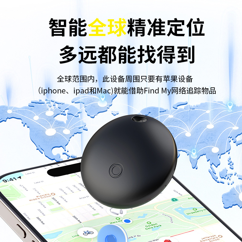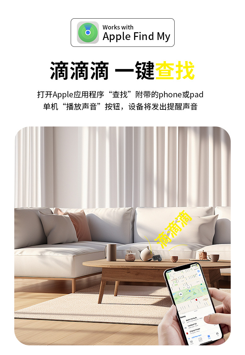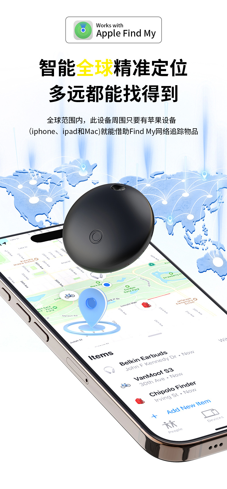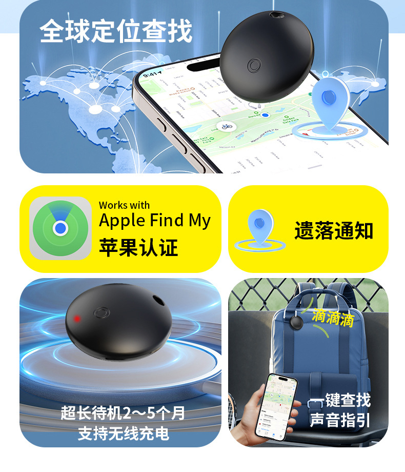 产品已通过苹果MFI认证,支持苹果Find My网络的蓝牙定位器,可以直接和苹果手机自带的“查找”App绑定,无需下载独立的app,直接使用方便快捷。