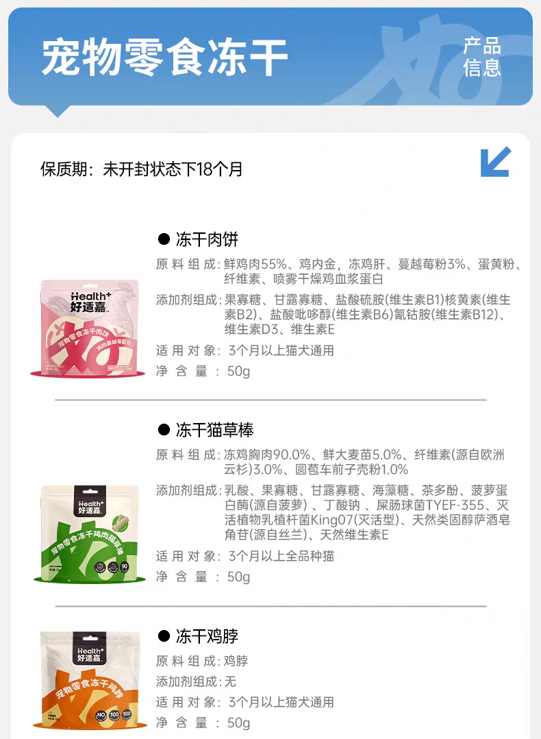 Ледяные кубики курицы Хао Шицзя; Фризильдried курица и клюквенный торт Haoshijia; Ледяная куриная шея Haoshijia; Ледяные палочки из кошачьей травы Хао Шидзя; Ледяное мясо утки и груша Haoshijia; Гранулы сублимированной свиной печени Haoshijia