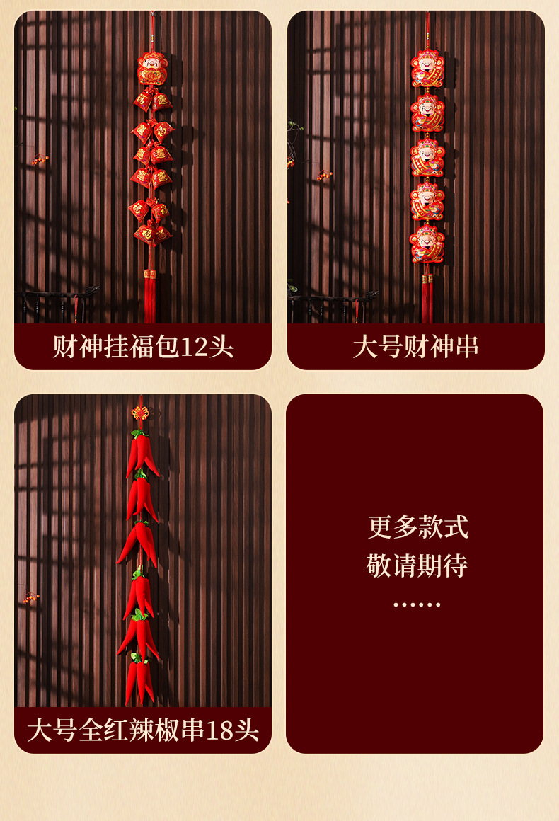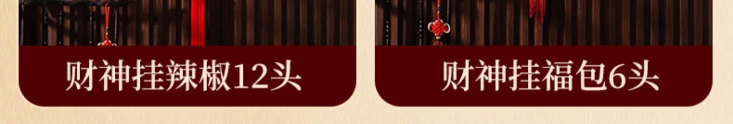 Струна Qianbao Wu Fu [Цена за 2 струны]; Подвесная веревка для петарды God of Wealth (6 шт.) [цена за 2 веревки]; Висящая веревка для мешка с деньгами God of Wealth (6 головок) [Цена за 2 веревки]; Шашлыки для мешков с деньгами (8 головок) [цена 2 шампура]; Шнурок для мешочка для денег (16 шт.); Подвесная сумка для денег God of Wealth (12 головок); Подвесная сумка для денег Рыбы (12 голов); Подвесная веревка для петарды «Бог богатства» (12 голов); Подвесная веревка для петарды Рыбы (12 голов); Все красные петарды (8 шт.); Вся красная веревка для петарды (16 штук); Струна для петарды с персонажем Фу (16 штук); Скейеры Рыбы; Рыбы висит веревка из хурмы; Рыбы висит веревка для ведра благословения; Мешок денег с пятью благословениями; Мешок для денег, висящий на веревке из хурмы; Мешок для денег, висящий на веревке для благословения ведра; строка Юаньбао; Маленькая струна Бога Богатства; Большая струна Бога богатства; Подвесные шампуры с перцем чили «Бог богатства» (12 голов); Три Рыбы и две струны фонаря; Рыбы вешают три веревки фонарей; Рыбы вешают четыре веревки фонарей; Рыбы вешают пять веревок фонарей; Весы висячие шампуры с перцем (12 головок); 2 Рыбы висят 2 шампуры с хурмой; 2 Рыбы висят на 2 веревках с счастливым ведром; 2 мешка с деньгами, висящие на 2 шампурах с хурмой; 2 мешочка с деньгами, висящие на 2 веревках с счастливым ведром; Шашлыки из красного и огненного перца (16 шт.); Маленькие целые шампуры из красного перца (18 шт.); Большие целые шампуры из красного перца (18 шт.)