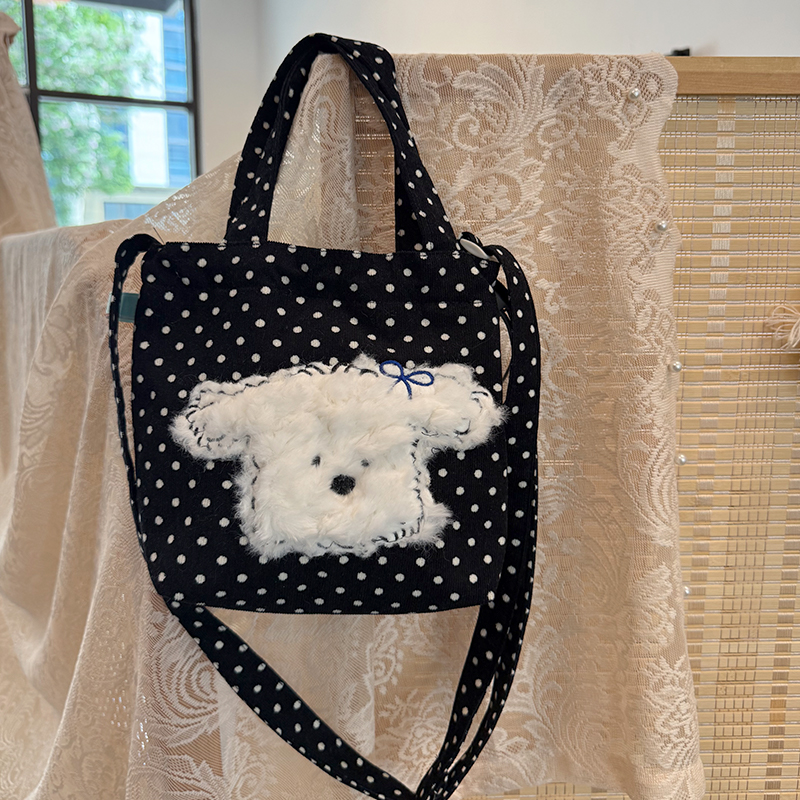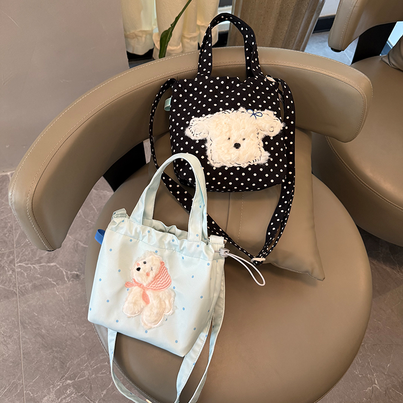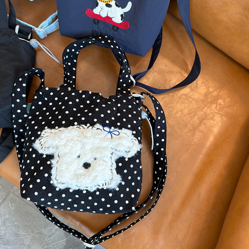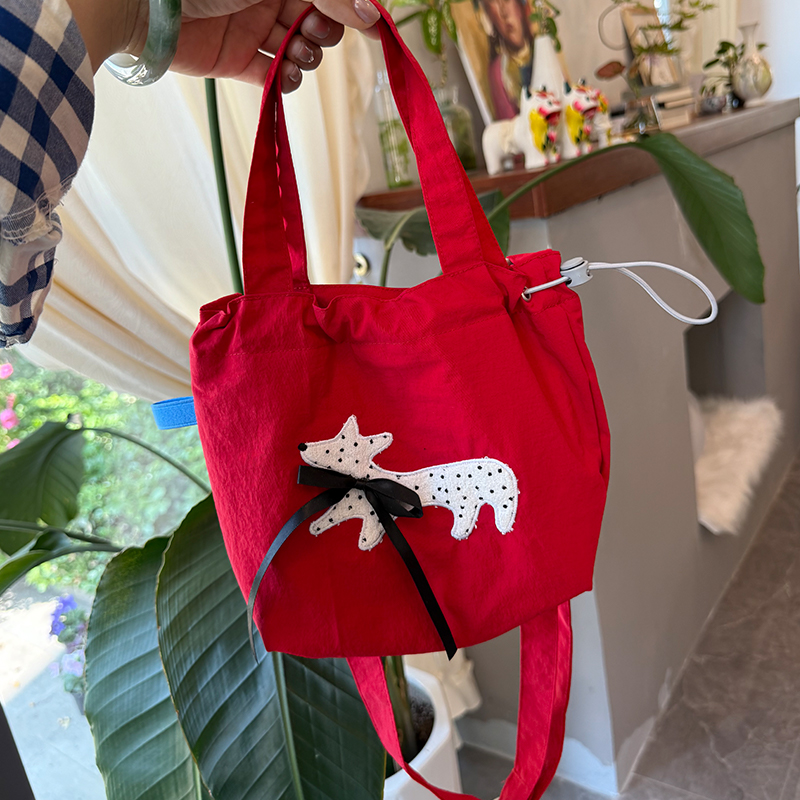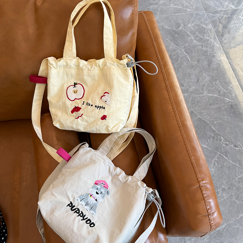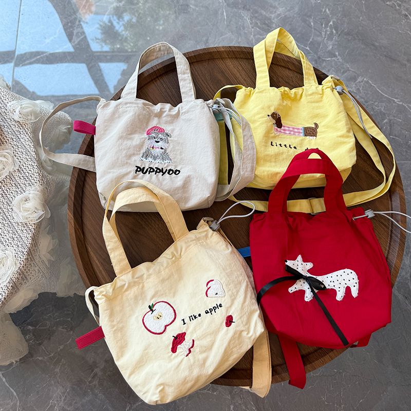 Красная сумка через плечо на шнурке с изображением щенка; Бежевая сумка через плечо Apple на шнурке; Синяя сумка через плечо West Highland в горошек на шнурке; Темно-синяя сумка через плечо со шнурком для скейтборда; Желтая сумка через плечо на шнурке с изображением таксы; Серая сумка через плечо с завязками для щенка серого цвета; Черная сумка через плечо на шнурке с изображением щенка; Черная сумка через плечо с завязками и пуделем в горошек