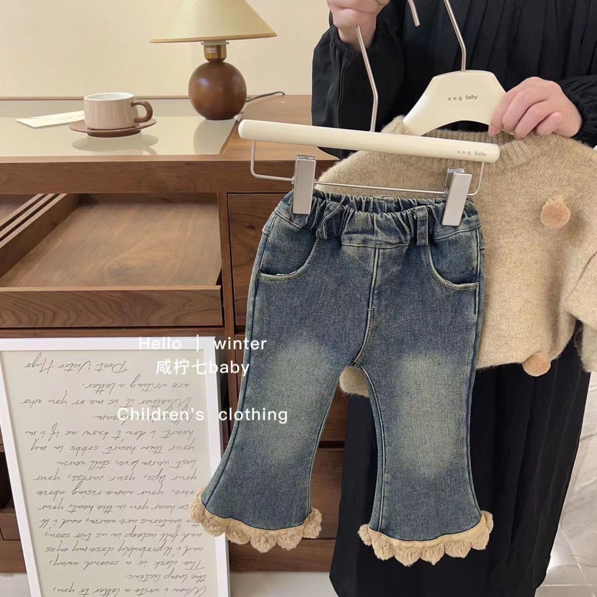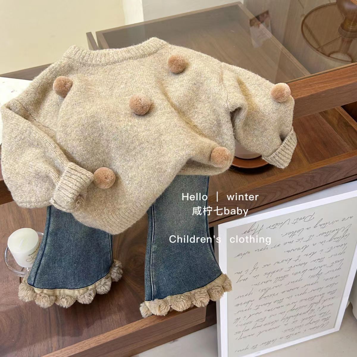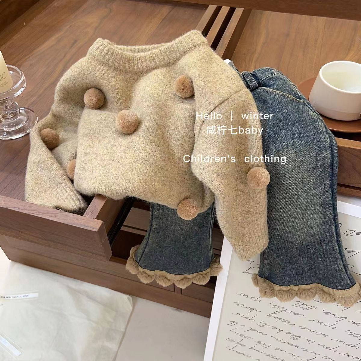 Детский костюм-свитер для девочек, зима 2024, новый стиль, трикотажная кофта, утолщенный двухслойный модный комплект для малышек