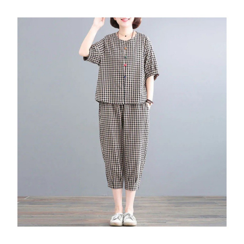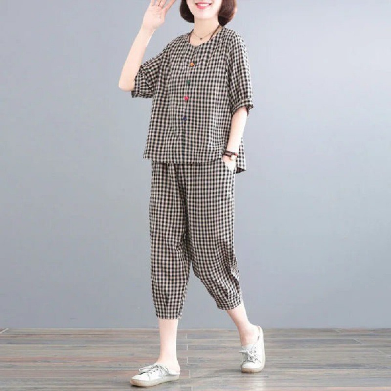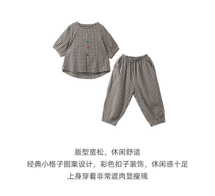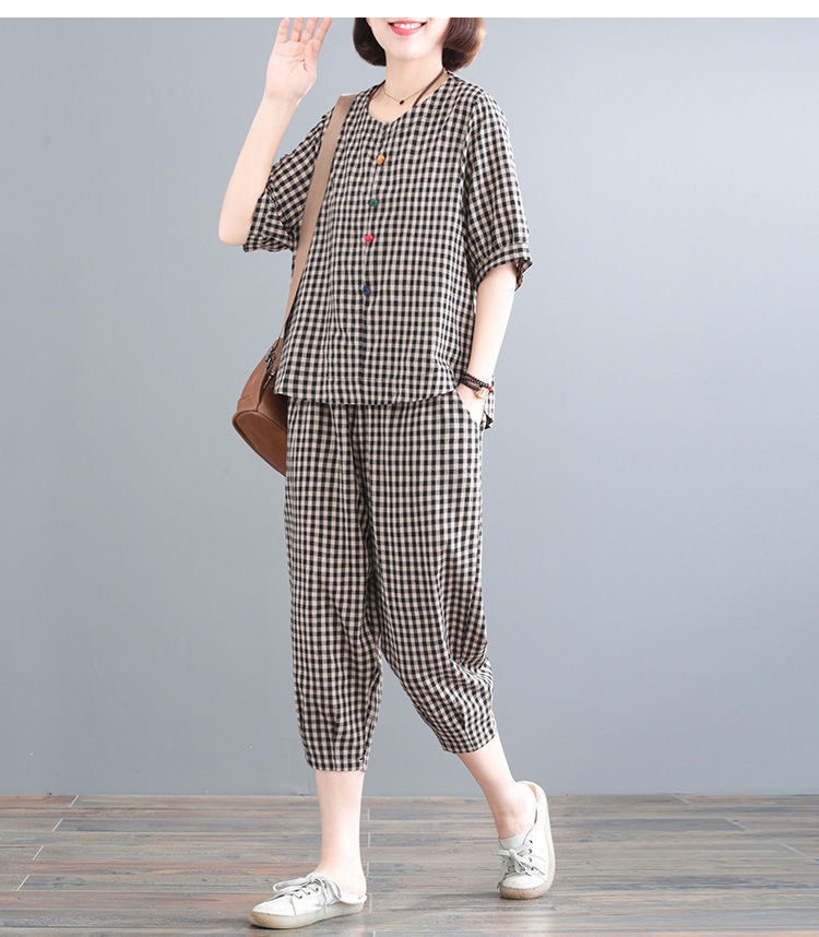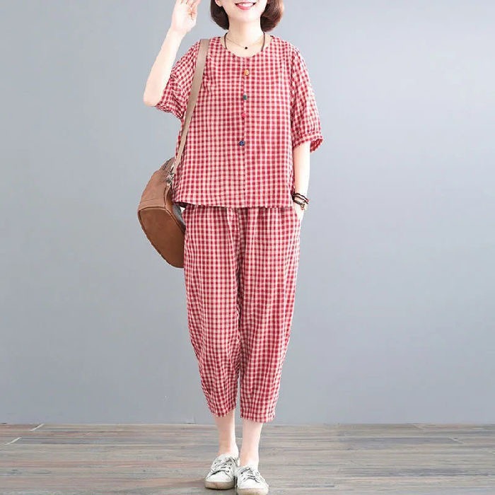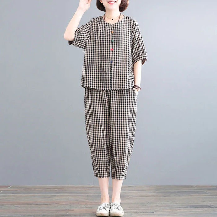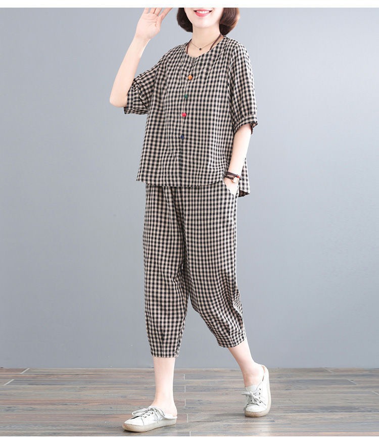 Женский хлопковый костюм-двойка больших размеров, лето 2025, в стиле литературного ретро, повседневный топ и брюки 7/8 в клетку, модный